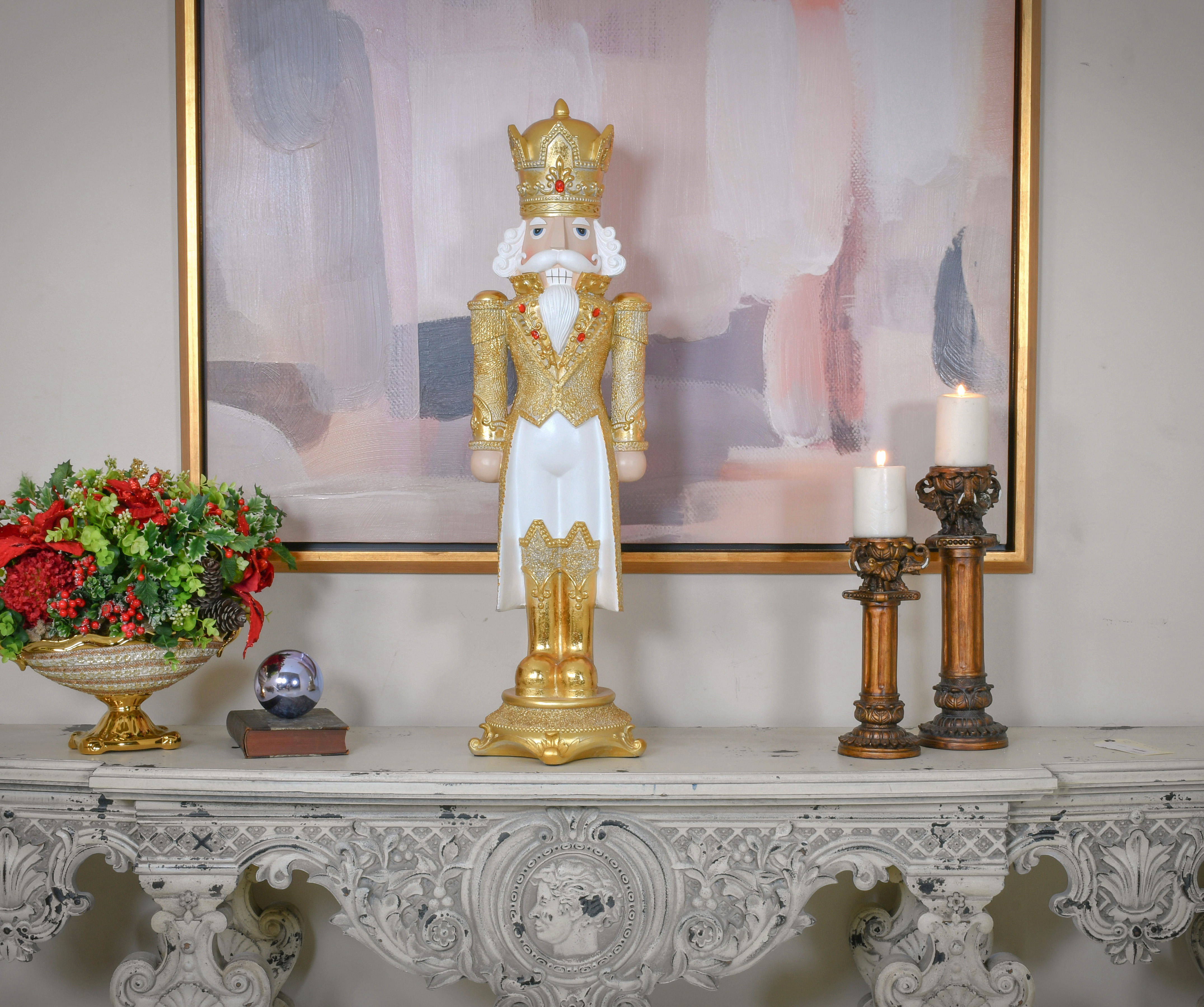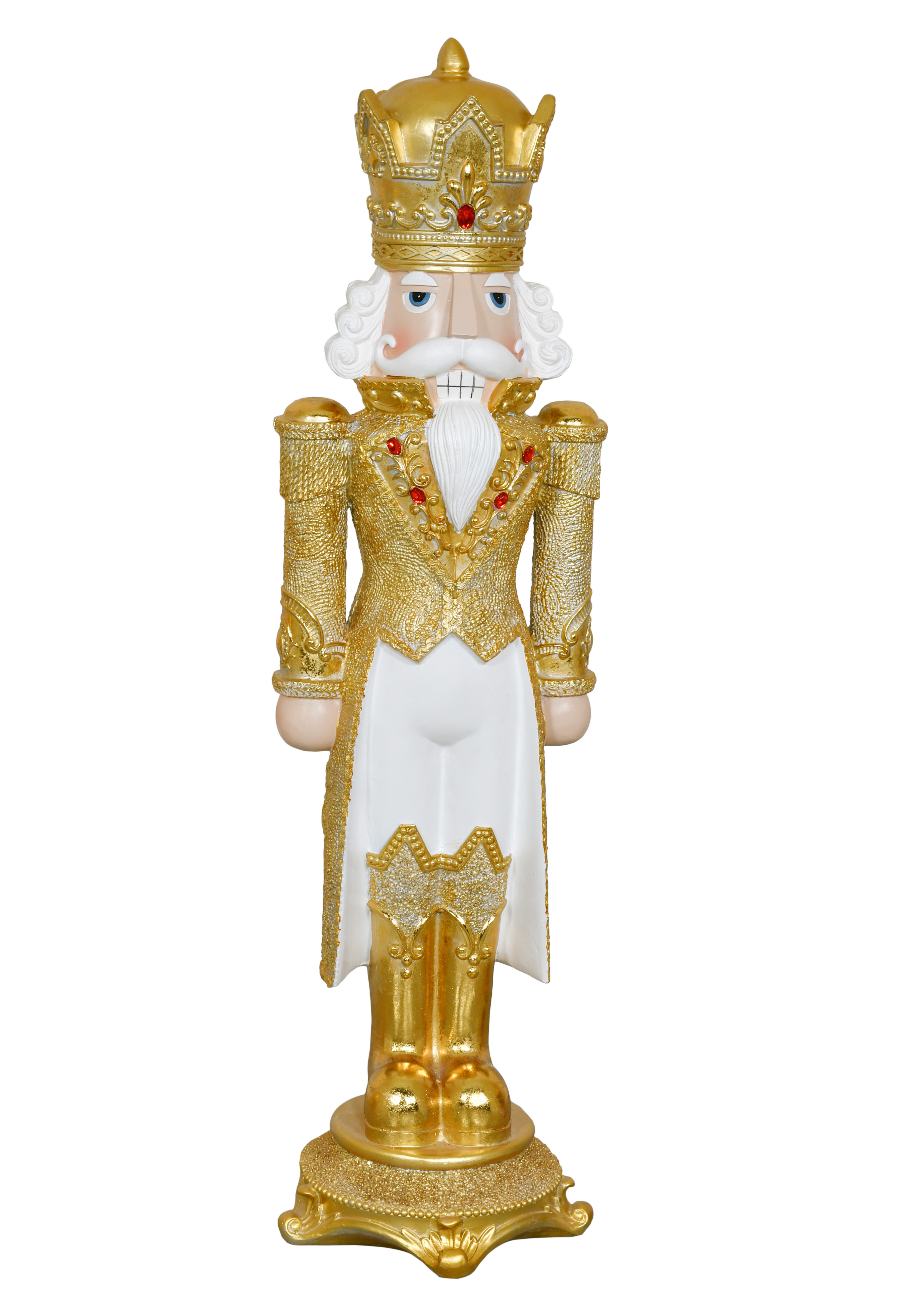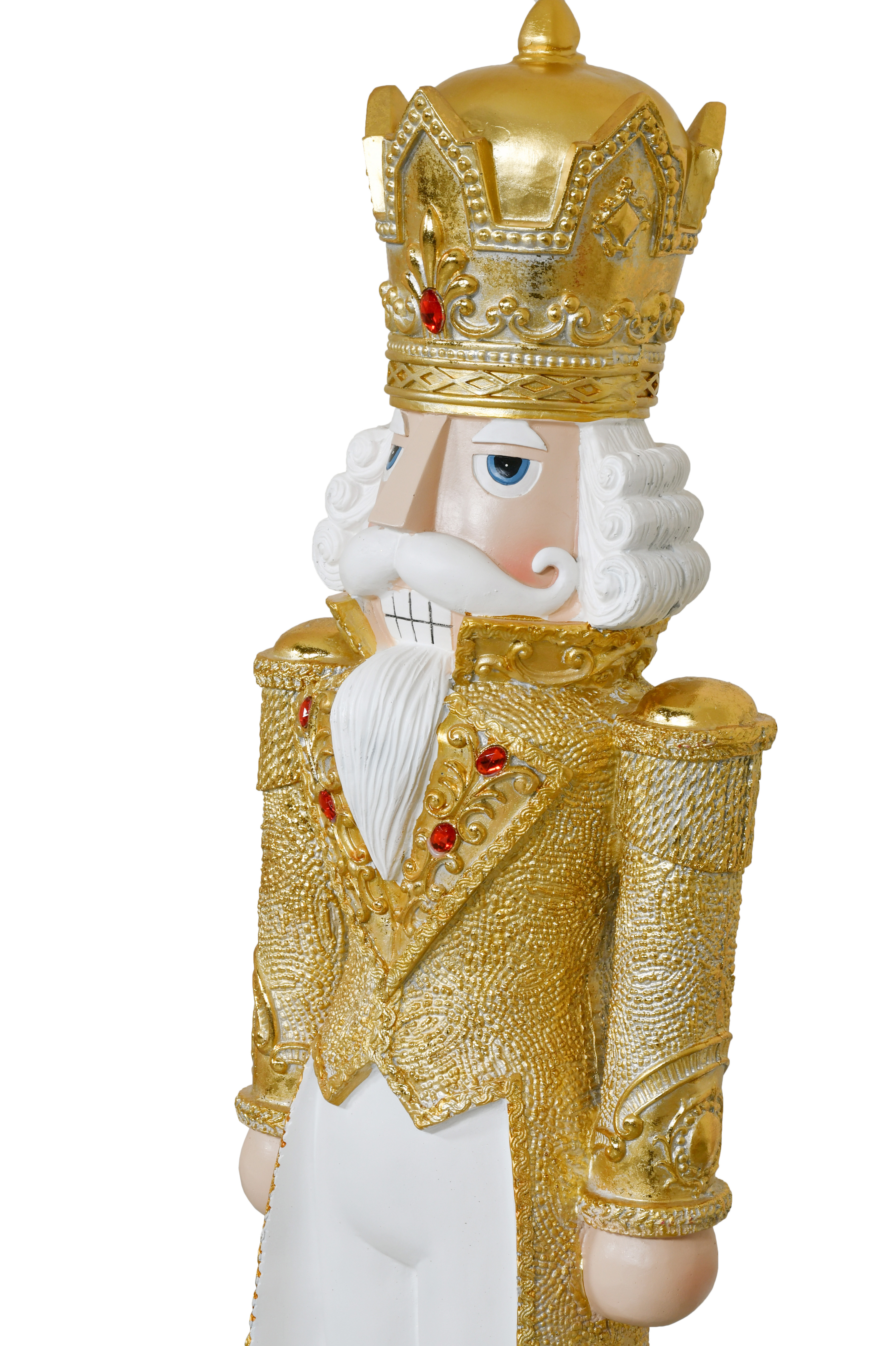 Make a truly opulent statement with this majestic 36-inch nutcracker. Clad in resplendent, gleaming gold regalia, this figurine embodies the grandeur of a bygone era. Every detail is meticulously crafted, from the gilded buttons on his royal coat to the stately crown resting on his wise, white-haired head. Standing tall on a matching pedestal, this impressive piece commands attention. More than a holiday decoration, it's a year-round symbol of nobility and splendor, perfect for a stately room or as a commanding festive centerpiece.