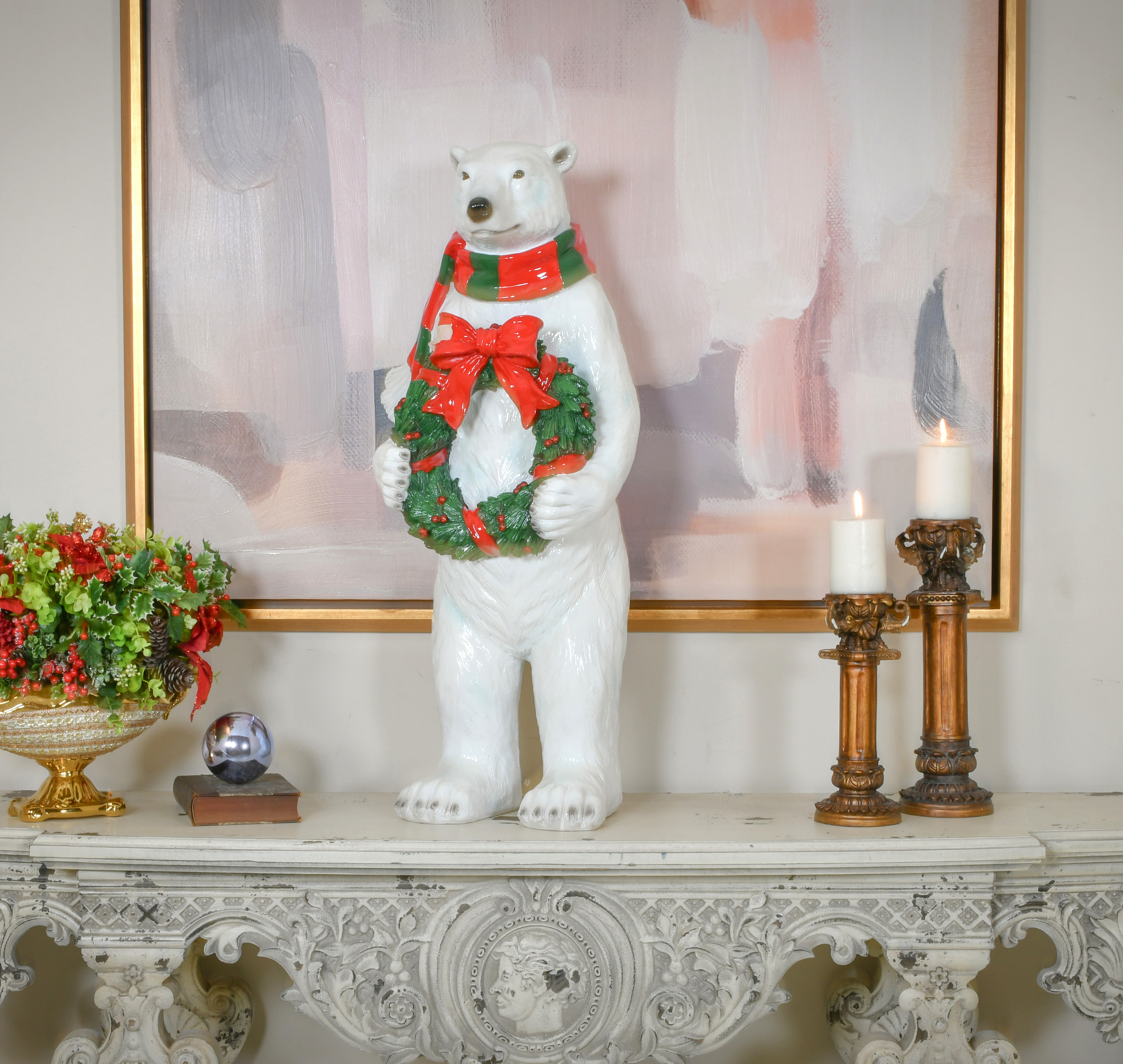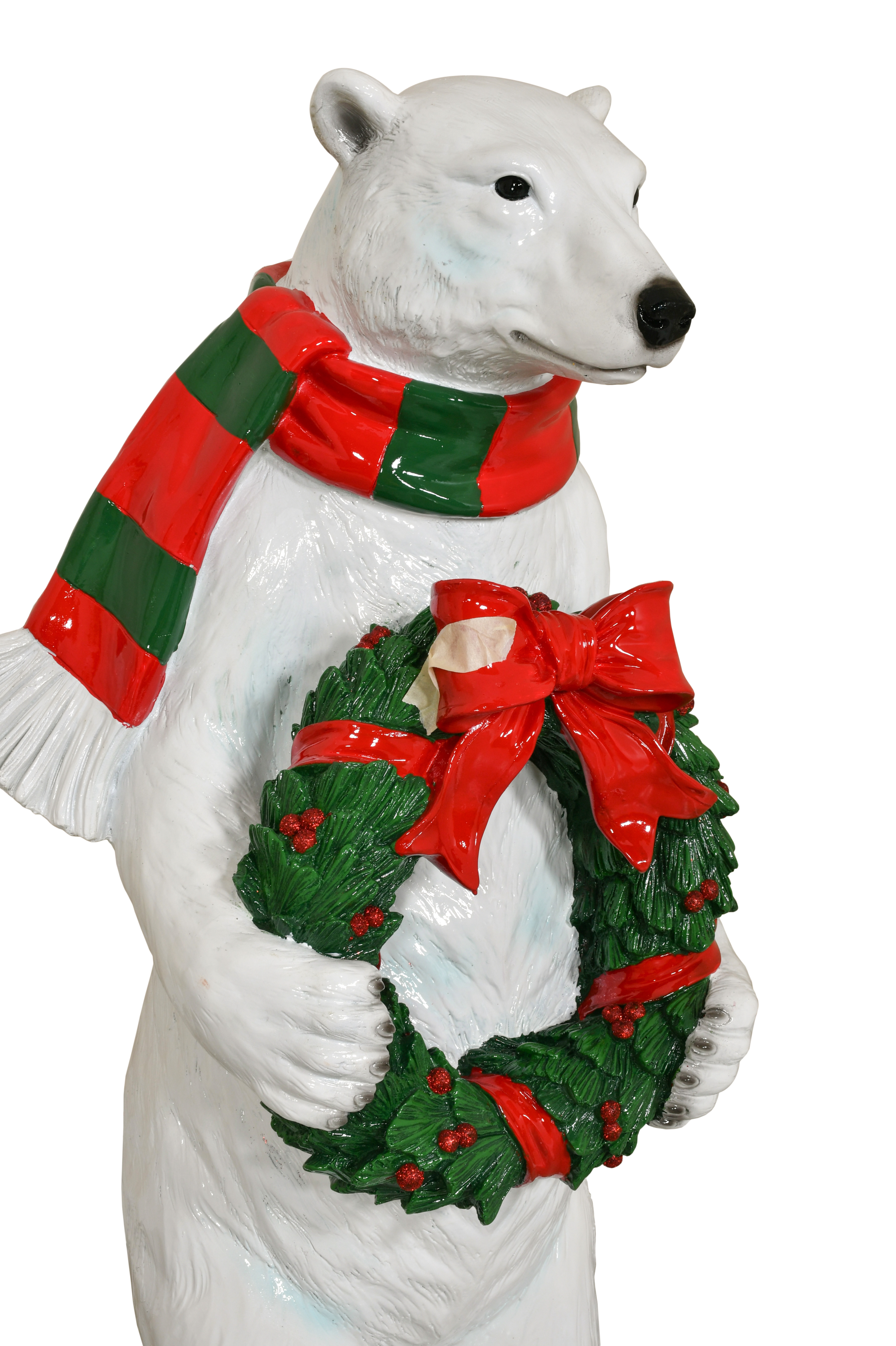 Make a statement this season with this charming, 36.5-inch-tall Polar Bear Holiday Statue! Dressed up for winter in a festive red and green scarf, this friendly bear holds a cheerful wreath, ready to greet your guests. Its endearing expression and realistic sculpted fur make it an inviting focal point for your holiday decorating. Place it anywhere—from the front door to the hearth—to instantly spread holiday cheer and a cozy, playful winter feeling.