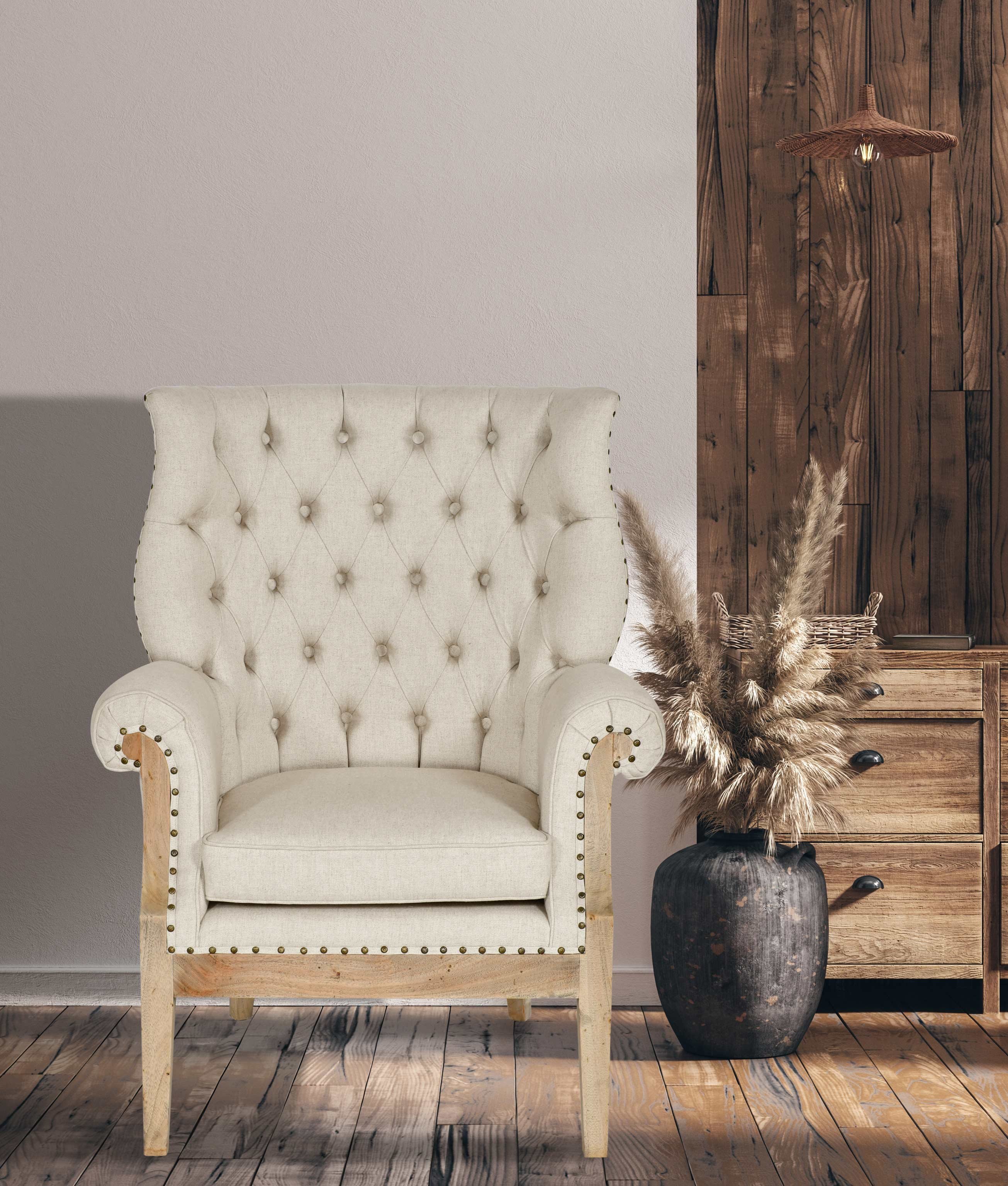 Bring the trending elegance of a modern farmhouse and coastal retreat into your home with our Impressive Farmhouse Islander Armchair. This piece is designed to be a striking focal point, featuring a detailed, artfully crafted back that immediately catches the eye. It's perfectly complemented by one of the hottest finishes in contemporary design—a sophisticated, neutral (achromatic) tone that effortlessly pairs with any decor palette.