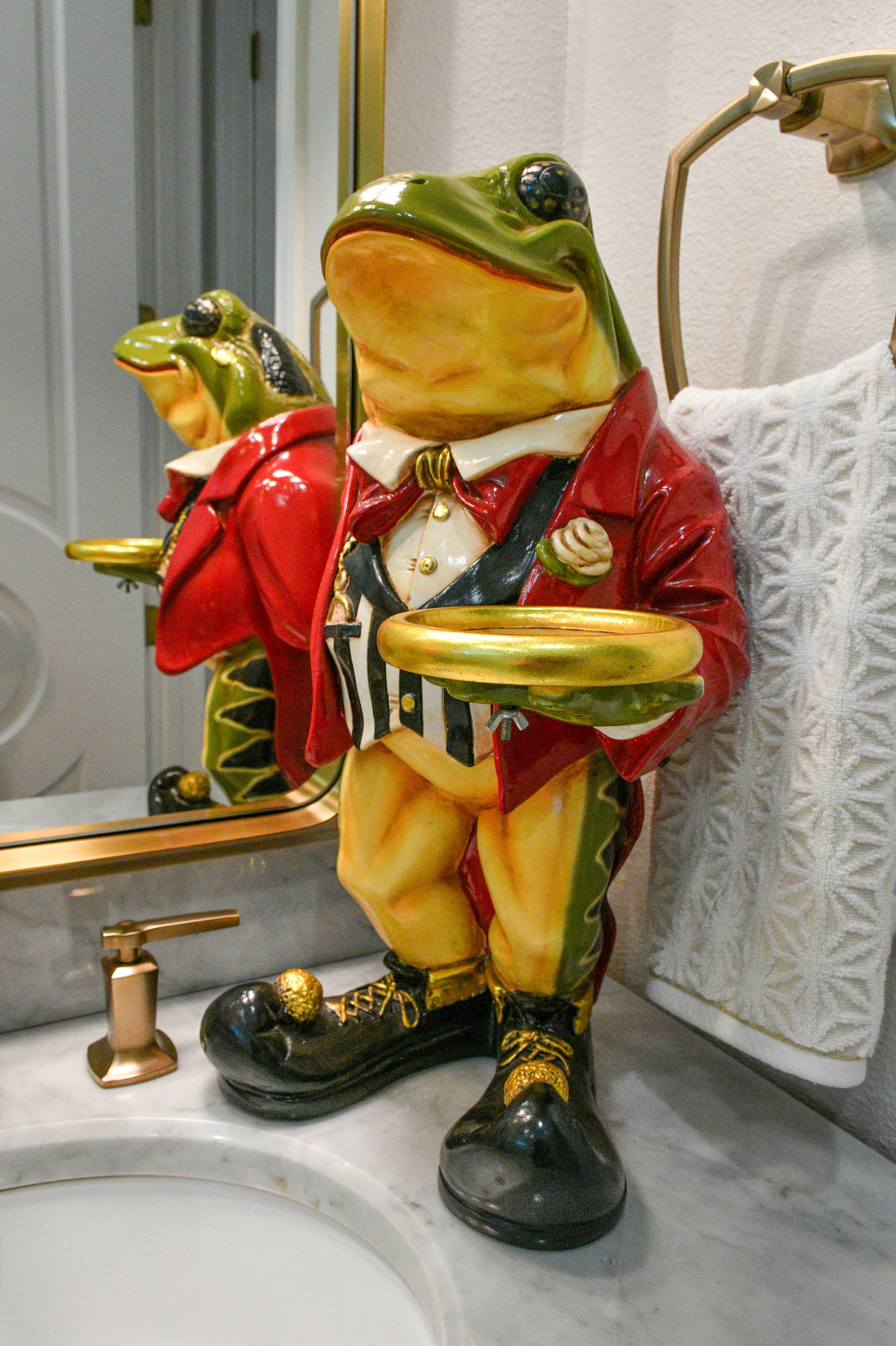 Elevate your home decor with a whimsical touch of sophistication! Meet the Dapper Frog Butler, a delightful statue ready to bring playful charm and functional elegance to any space. Dressed in his finest attire—a smart tuxedo jacket, polished shoes, and a jaunty bow tie—this proud frog stands at attention, extending a serving tray for your convenience.