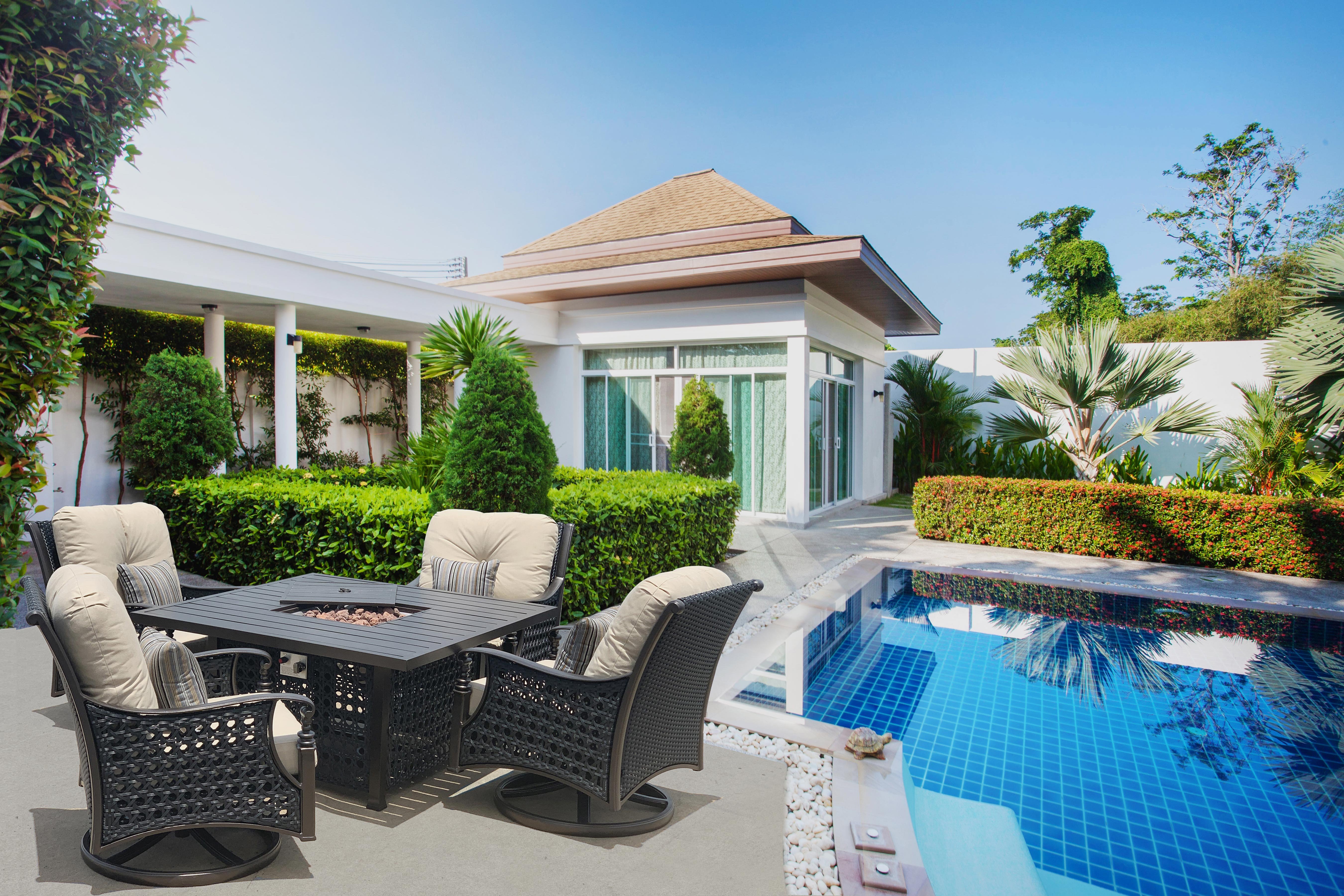 Elevate your outdoor living experience with the Monterey 5-Piece Fire Pit Chat Set, a premier collection that masterfully blends indoor sophistication with outdoor durability. Designed for those who refuse to compromise on comfort, this set features four deep-seated club chairs that offer a soothing swivel and rocking motion, centered around a powerful propane fire table.