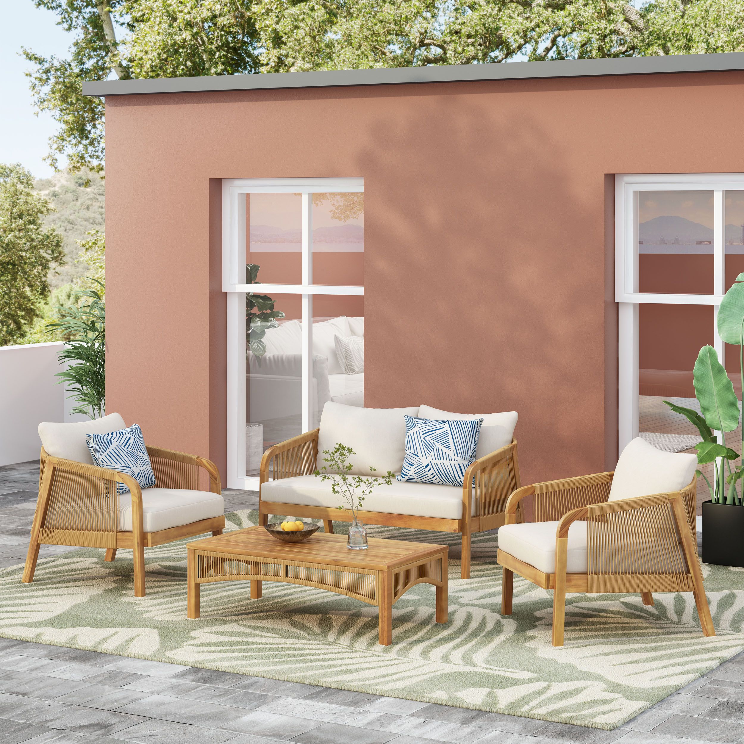 Woven Faux Rattan Accents: The chairs and coffee table are accented with lovely, hand-woven faux rattan details. This unique texture adds a breezy, modern charm that complements the wood and effortlessly blends into any outdoor decor