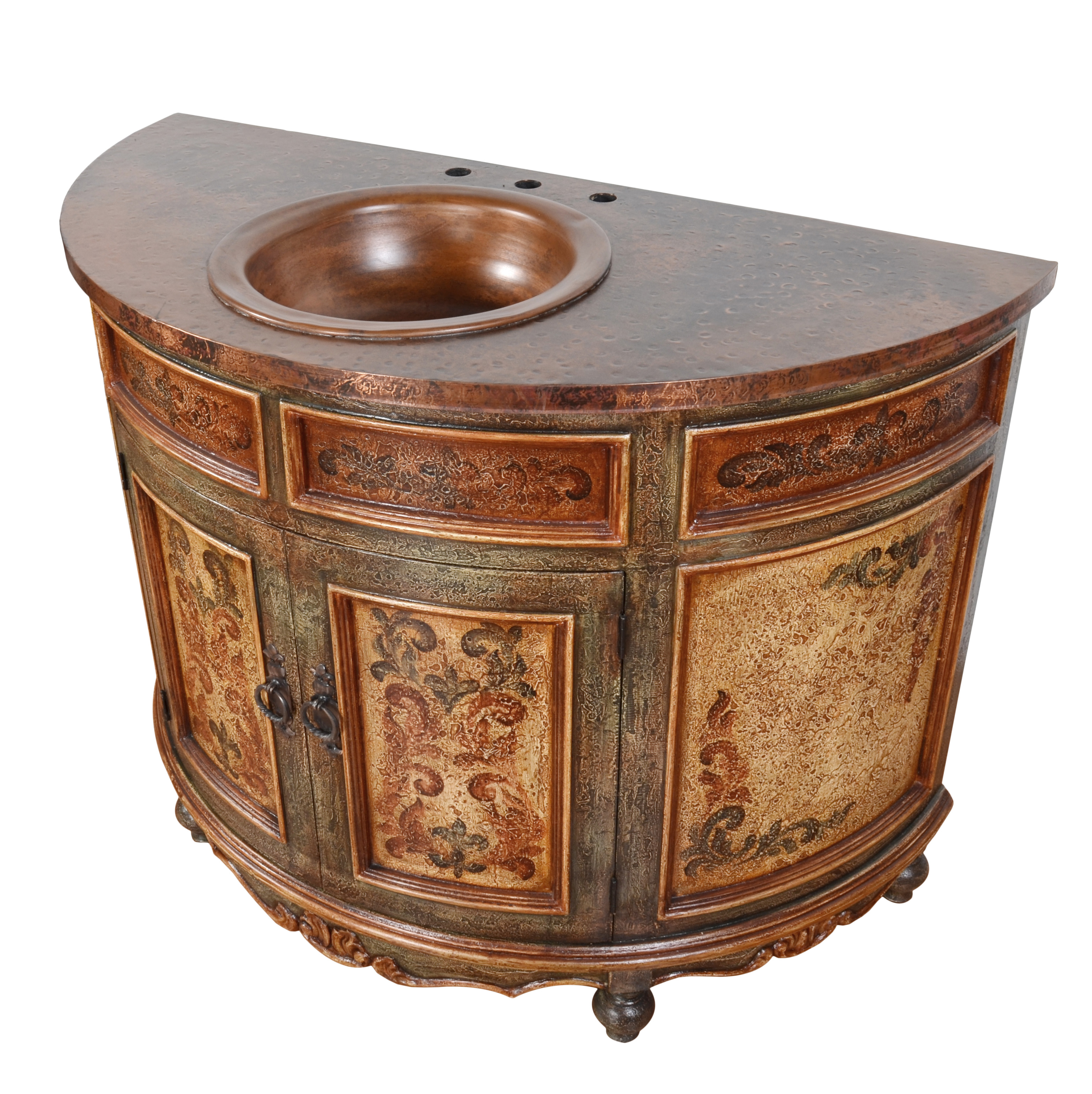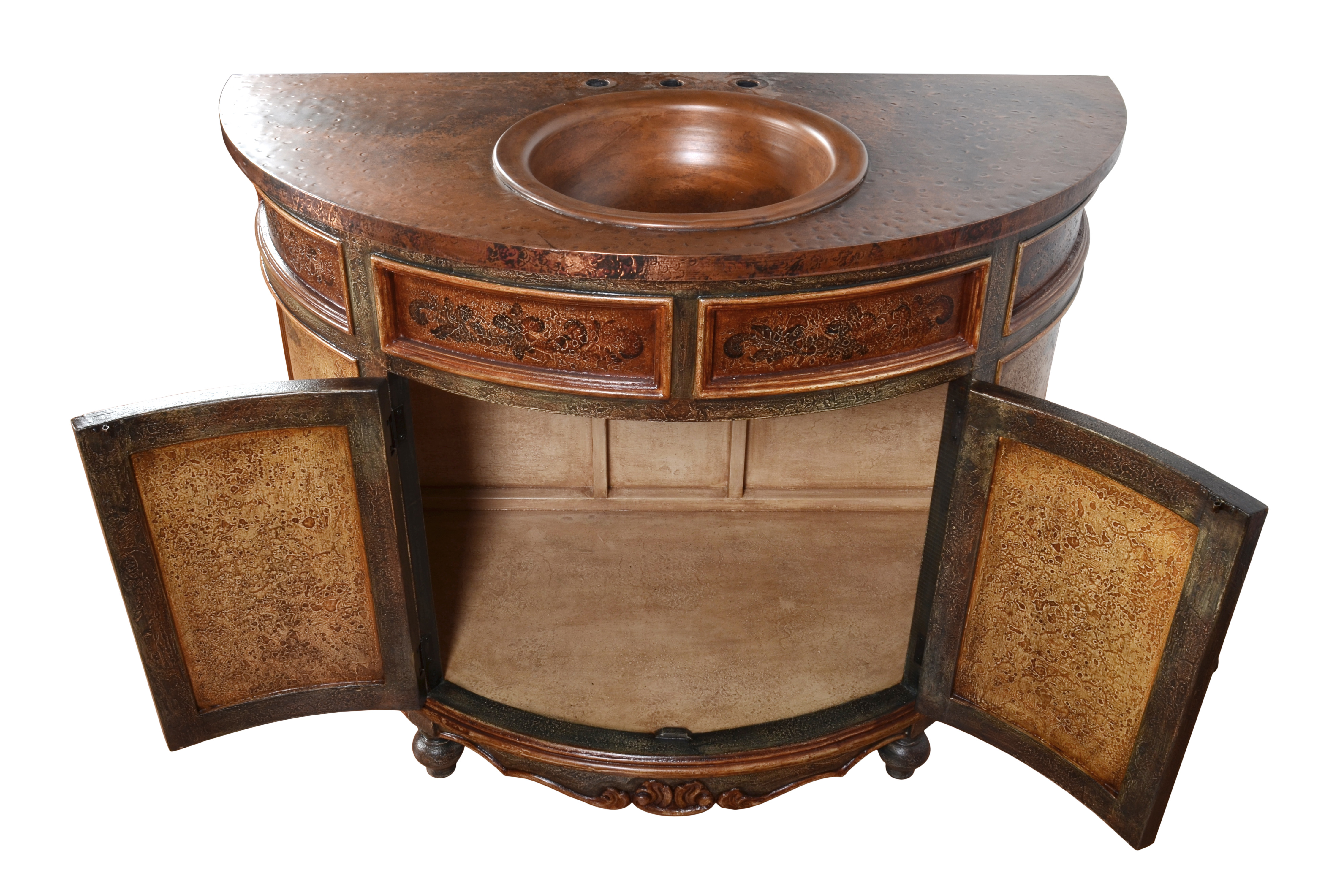 The Peruvian Copper Top Vanity is a 48" wide single bowl vanity. The vanity is beautiful and decorative as well as designed to make installation as easy as possible. It comes with a mounted hand hammered copper top and bowl with pre-drilled holes for faucets the back was designed with an opening to allow for easy plumbing hook-ups. This collection boasts a Spanish influence with its large scaled details in a finish of varying tones of rich darker tones featuring a contrast of distressed creamy beige and delicately detailed with hand painted scrolls. Consider ordering 2 for a large master bath application or for smaller space requirements consider our equally beautiful Lima Copper Top Vanity with an efficient 25" width. The Peruvian Copper Top Vanity is part of our Santa Lucia Collection consisting of handmade, hand painted, and distressed solid wood furniture making each piece a timeless investment. Hand crafted treasures made one piece at a time, under one roof, by our exclusive family owned manufacturer from Lima, Peru. Their master artisans are skilled in furniture making techniques influenced by the Spanish during the colonization of Peru. Many items in the diverse collection feature specialty hand painted finishes that have also been passed on and perfected from generation to generation. The family strives to be environmentally friendly by using woods re-purposed from haciendas and old colonial homes as well as wood indigenous to South American forests, primarily mahogany, cedar, moena and requiem. If you are a lover of beautiful painted furniture, find hill country rustic romantic, or find richness in Mediterranean lore Then you too may fall in furniture love with this fine collection.