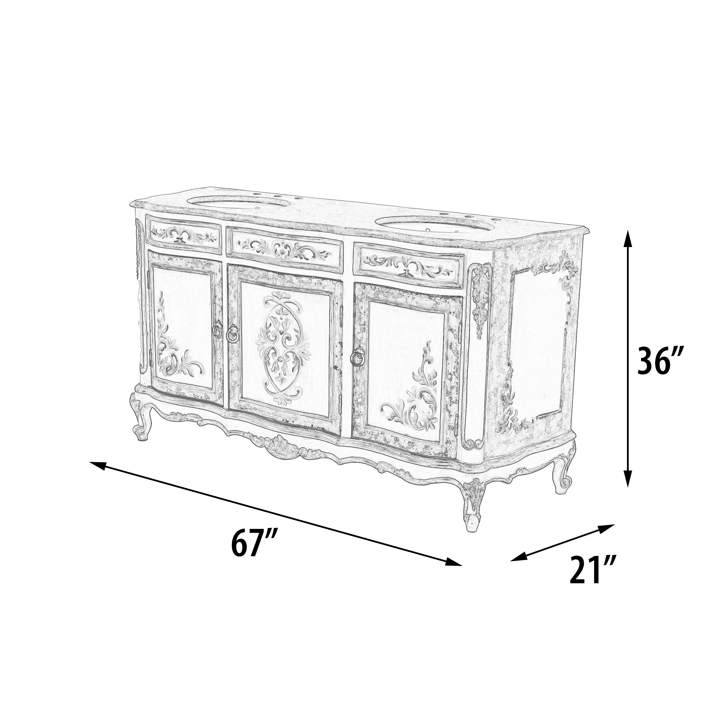 The Cabo Blanco Double Vanity from our expansive Santa Lucia Collection is a 67" wide, double bowl vanity. The vanity is beautiful and decorative as well as designed to make installation as easy as possible. It comes with a mounted beige solid marble top with pre-drilled holes for faucets, 2 mounted porcelain bowls and the back was designed with an opening to allow for easy plumbing hook-ups. This collection boasts a Spanish influence with its large, scaled details in a popular finish of deep rustic browns featuring a contrast of distressed creamy whites and delicately detailed with hand painted soft scrolls. Consider pairing with the single Casa Grande Vanity from this series. The Casa Grande series is part of our Santa Lucia Collection consisting of handmade, hand painted, and distressed solid wood furniture making each piece a timeless investment. Hand crafted treasures made one piece at a time, under one roof, by our exclusive family-owned manufacturer from Lima, Peru. Their master artisans are skilled in furniture making techniques influenced by the Spanish during the colonization of Peru. Many items in the diverse collection feature specialty hand painted finishes that have also been passed on and perfected from generation to generation. The family strives to be environmentally friendly by using woods re-purposed from haciendas and old colonial homes as well as wood indigenous to South American forests, primarily mahogany, cedar, moena and requiem. If you are a lover of beautiful painted furniture, find hill country rustic romantic, or find richness in Mediterranean lore then you too may fall in furniture love with this fine collection.