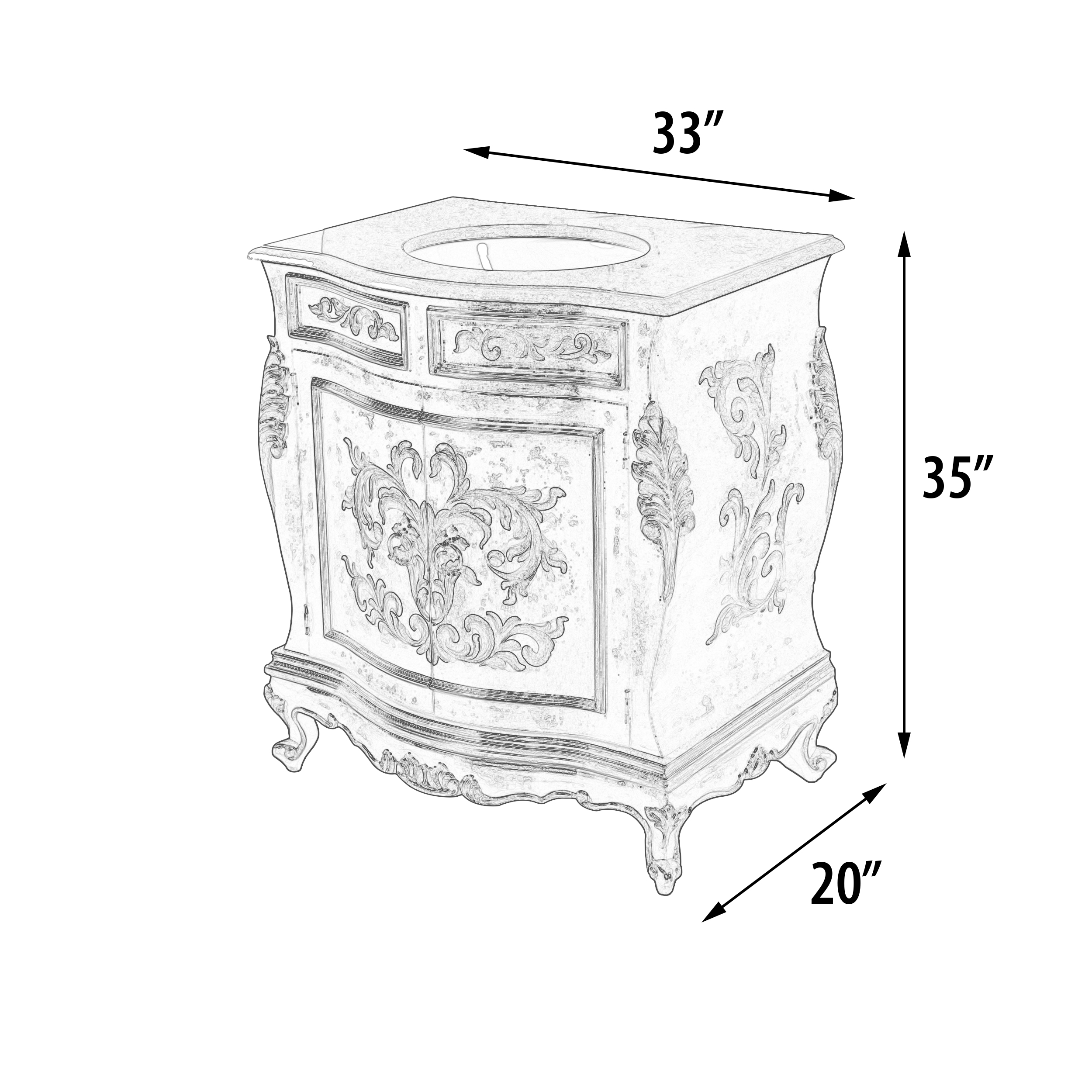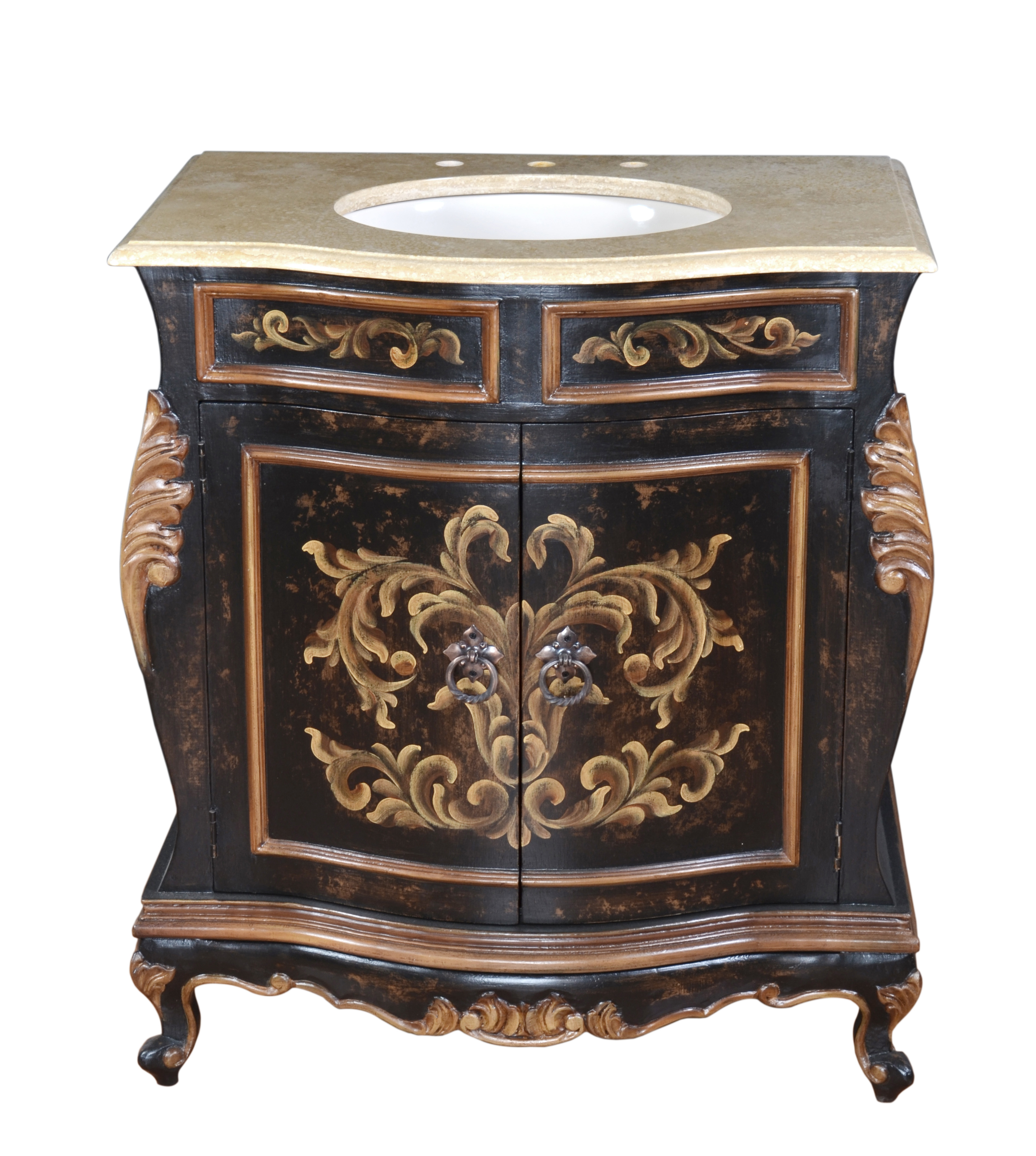 The Dorado Vanity is a 33" wide single bowl vanity. The vanity is beautiful and decorative as well as designed to make installation as easy as possible. It comes with a mounted beige solid travertine marble top with pre-drilled holes for faucets, a mounted porcelain bowl, and the back was designed with an opening to allow for easy plumbing hook-ups. This collection boasts a Spanish influence with its large scaled details in a popular finish of deep rustic browns featuring a contrast of distressed black and delicately detailed with hand-painted soft scrolls. Consider ordering 2 for a large master bath application. The Dorado Vanity s is part of our Santa Lucia Collection consisting of handmade, hand-painted, and distressed solid wood furniture making each piece a timeless investment. Handcrafted treasures made one piece at a time, under one roof, by our exclusive family owned manufacturer from Lima, Peru. Their master artisans are skilled in furniture making techniques influenced by the Spanish during the colonization of Peru. Many items in the diverse collection feature specialty hand-painted finishes that have also been passed on and perfected from generation to generation. The family strives to be environmentally friendly by using woods re-purposed from haciendas and old colonial homes as well as wood indigenous to South American forests, primarily mahogany, cedar, moena, and require. If you are a lover of beautiful painted furniture, find hill country rustic romantic, or find richness in Mediterranean lore then you too may fall in furniture love with this fine collection.