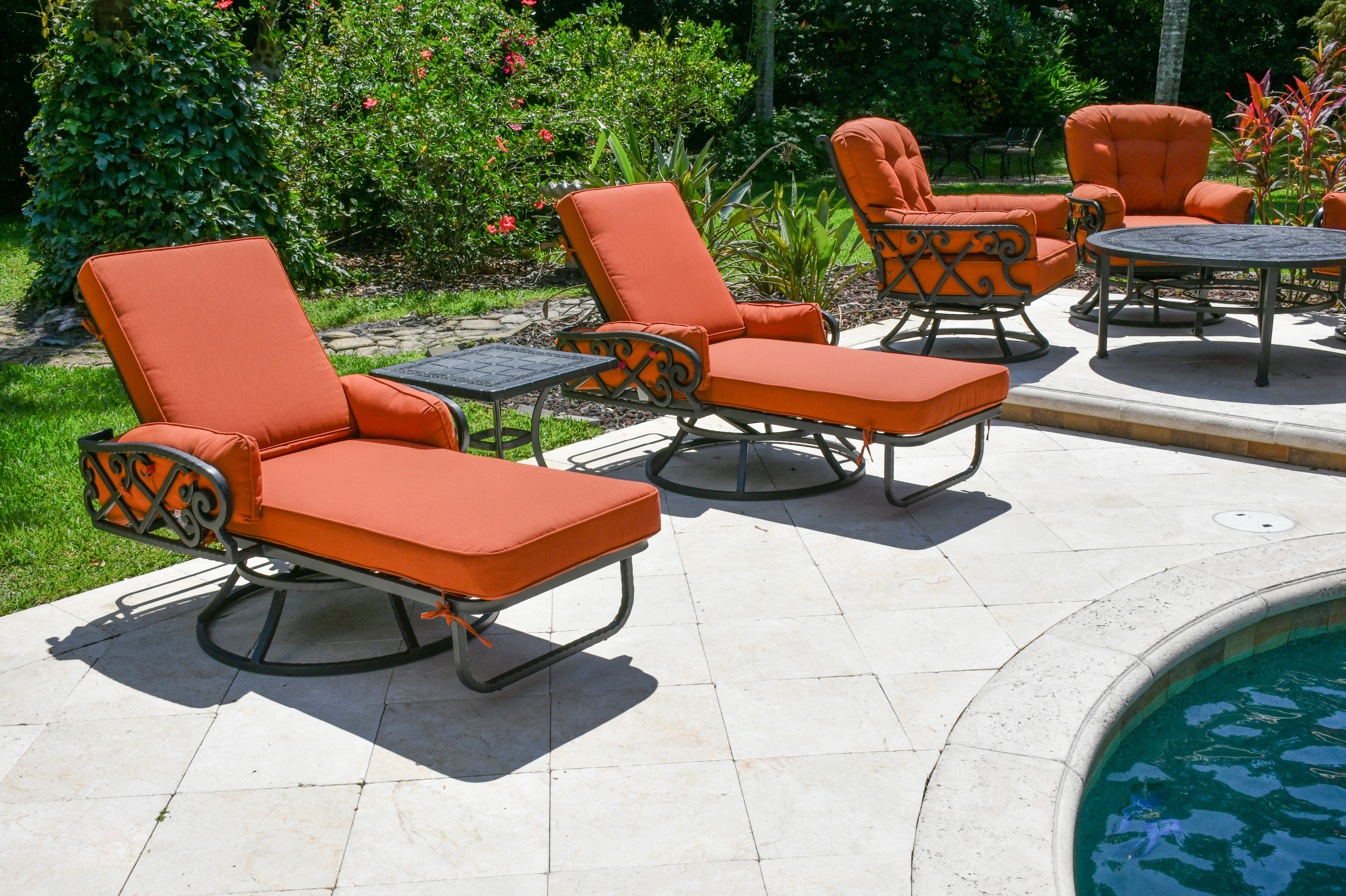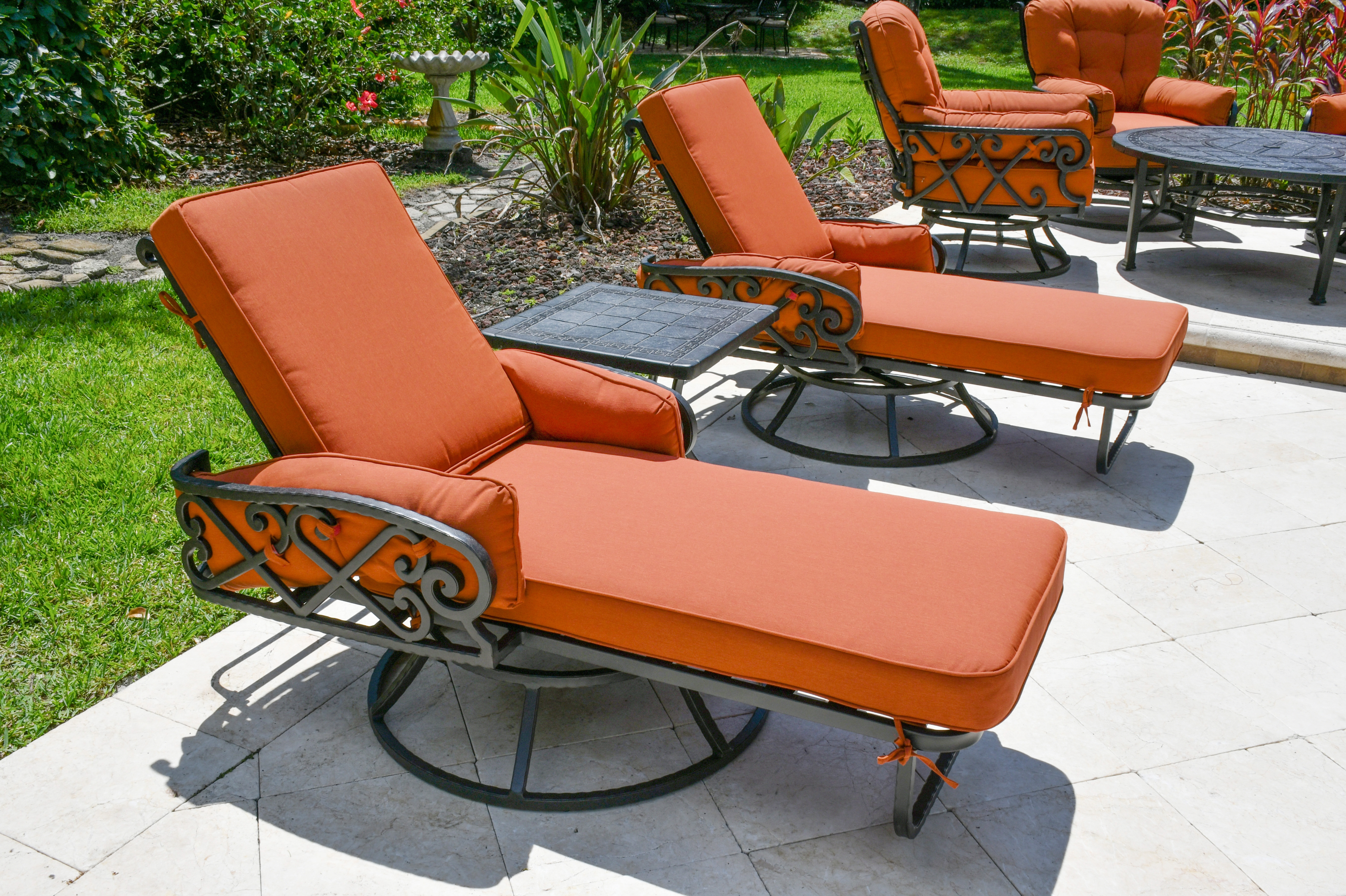 Introducing the groundbreaking Chillounger Chaise Lounge Set with 360-degree Swivel Base by Bridgeton Moore, a revolution in outdoor comfort. This set seamlessly blends luxury with innovation, creating a sanctuary of relaxation in your outdoor haven. Featuring two exclusive 360-degree swivel chaise lounges and a matching side table, this set allows effortless adjustment for optimal comfort without the need to relocate the entire chaise. Simply rotate to find your perfect lounging position. Whether enjoying some alone time or snuggled up with a companion, these lounges beckon you to unwind and let go of the day's stresses. Each chaise boasts a striking bent, forged, and hand-hammered scroll design, finished in a rich bronzed tone with brown highlights, enhancing its elegance. Fully constructed in aluminum with a powder-coated finish ensures lasting beauty and functionality. Welded for durability, these swivel chaise lounges ensure stability and enjoyment for years to come in any outdoor setting. Special quick-drying cushion cores are covered in Terra Cotta Sunbrella Brand fabric, offering both comfort and durability. Sunbrella fabrics are UV resistant and colorfast, allowing for easy removal and washing, ensuring vibrant fabric for years of enjoyment. Backed by Bridgeton Moore's high-quality standards and a 3-year warranty on all frames and finishes, this investment is built to last. For maintenance, we recommend covers for year-round outdoor exposure, especially in coastal areas prone to corrosion. Simple care, such as hosing down or rinsing off salt exposure, preserves the finish. Experience ultimate relaxation with the Chillounger Chaise Lounge Set, where comfort, functionality, and style unite to elevate your outdoor living space. Some assembly required.