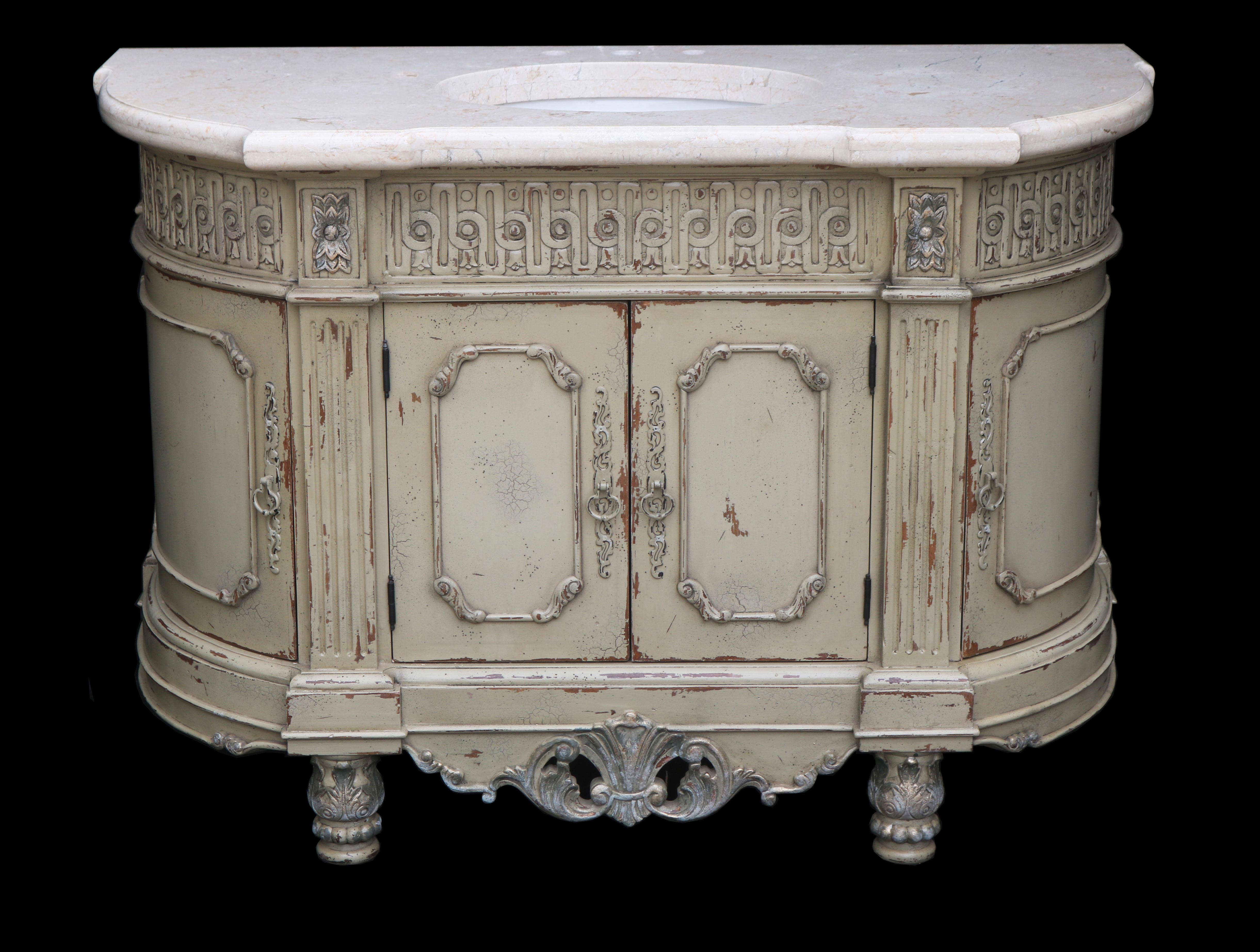 Bring timeless sophistication to your bathroom with the Essex Parchment Vanity, a stunning piece that blends Old World craftsmanship with elegant modern utility. This gracefully curved vanity features intricately carved floral and scroll detailing, hand finished in a soft parchment tone with a lightly distressed patina that evokes the charm of a European estate. The luxurious marble top provides a refined surface, perfectly complementing the ornate wood base. Double cabinet doors open to reveal ample storage, allowing you to keep essentials organized while maintaining an air of classic elegance.
