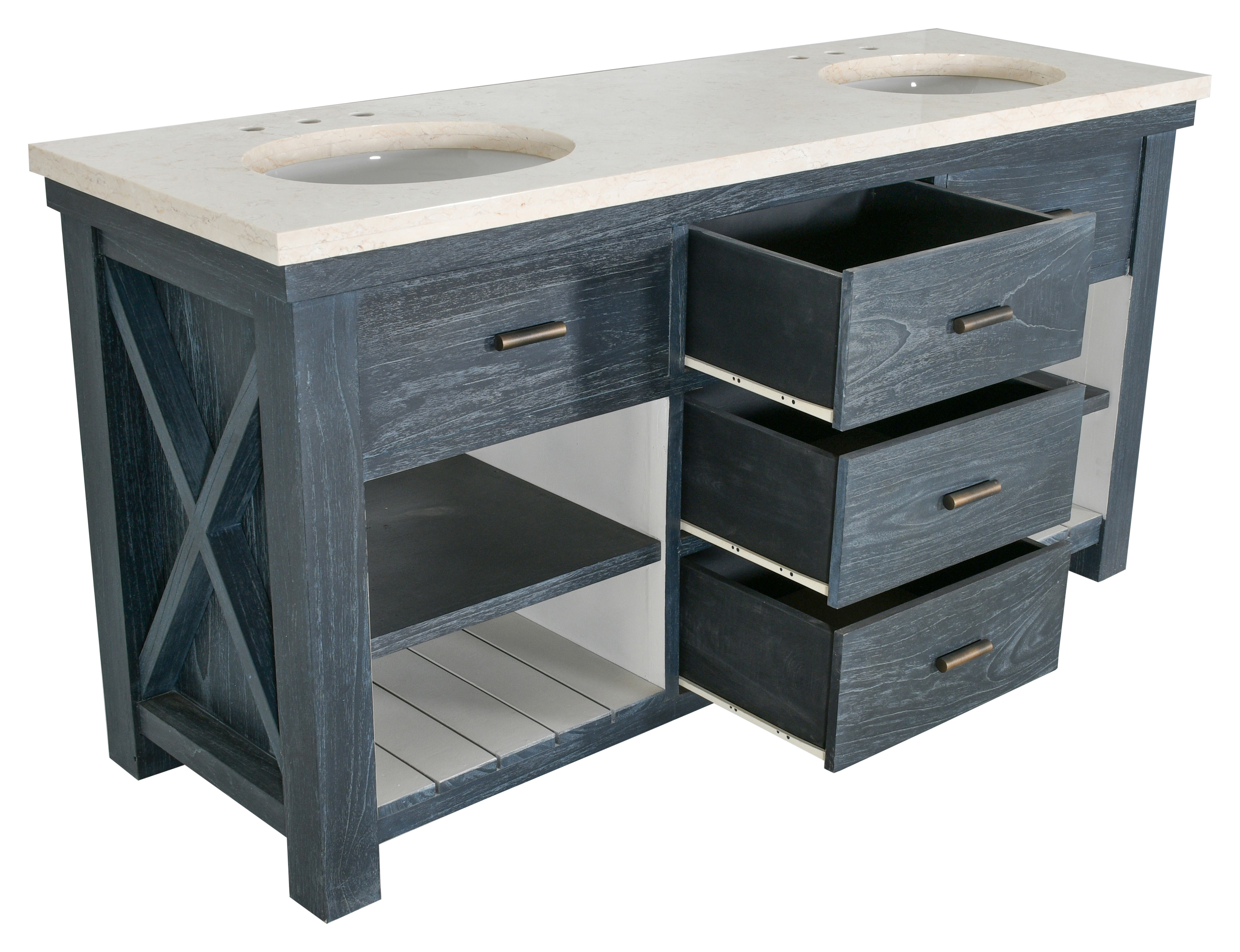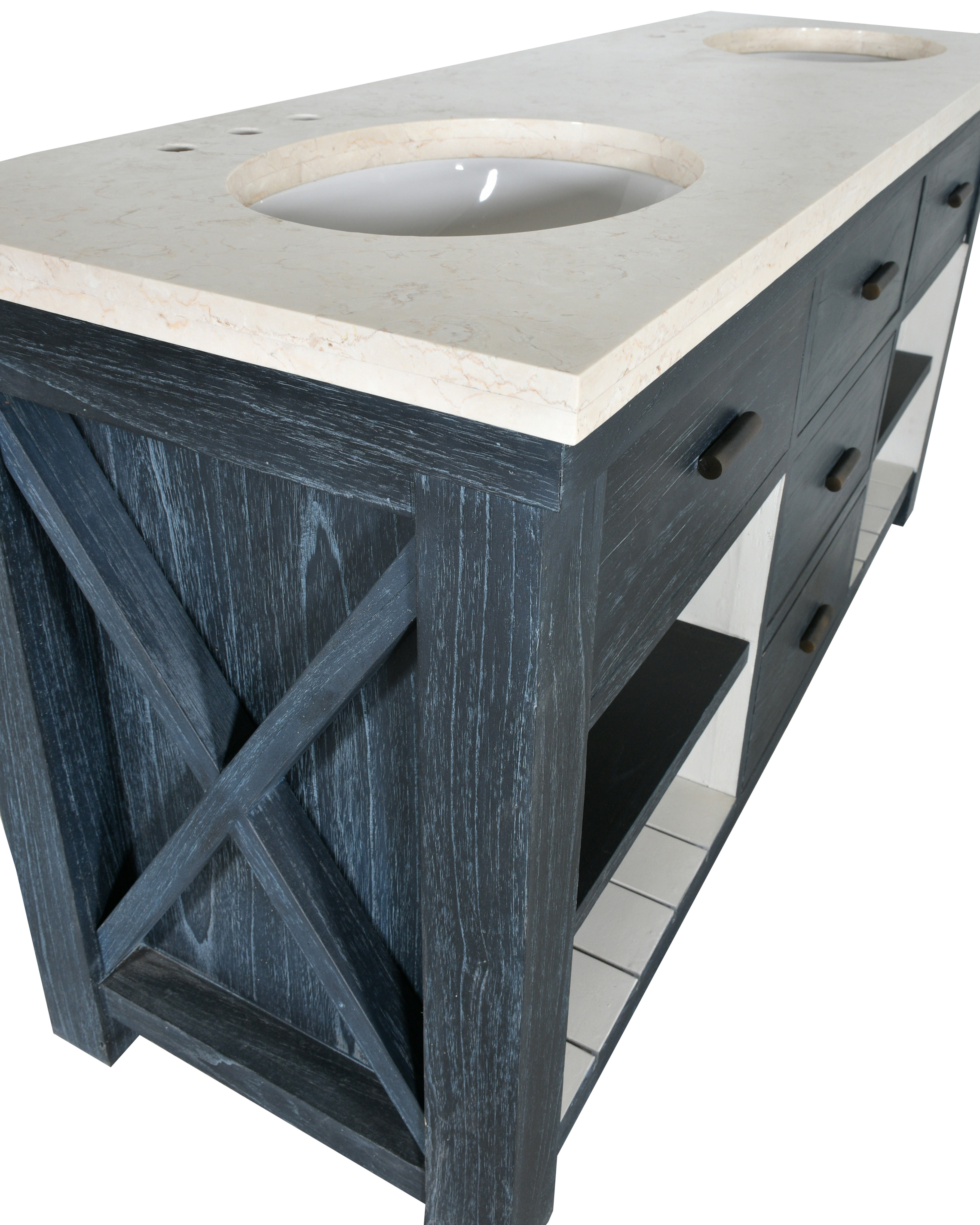 Elevate your bathroom with the exquisite craftsmanship and versatile design of our bathroom vanities from the Heritage Collection, offered in standard sizes of 66 inches, 72 inches, and 84 inches, along with the option for customization to perfectly fit your space. Each vanity is meticulously handcrafted from premium kiln dried solid mahogany wood to withstand the rigors of everyday use. While the listing showcases double vanities, complete with porcelain sink bowls and a standard faucet hardware spread of 8 inches centered (note: faucets not included), we also cater to those desiring a single vanity. Although not displayed, the single vanity option can be ordered to accommodate your specific requirements, ensuring a perfect match for your bathroom's dimensions and style. Our vanities, highlighted on the product page with the popular Beachstone and Charcoal finishes, are available in any finish from the extensive Heritage Collection palette. This allows you to personalize your vanity to harmonize with your bathroom decor, ensuring a cohesive and stylish look. Whether opting for a double or single vanity, each piece is backed by a five-year Limited Warranty, underscoring our commitment to quality and longevity. The vanities are designed to provide practical storage solutions, with three drawers and two shelves, all while bringing the refined craftsmanship and aesthetic of fine furniture into your bathroom. Elevate your space with a vanity that combines functional design with artisanal beauty, making your bathroom a sanctuary of style and comfort.