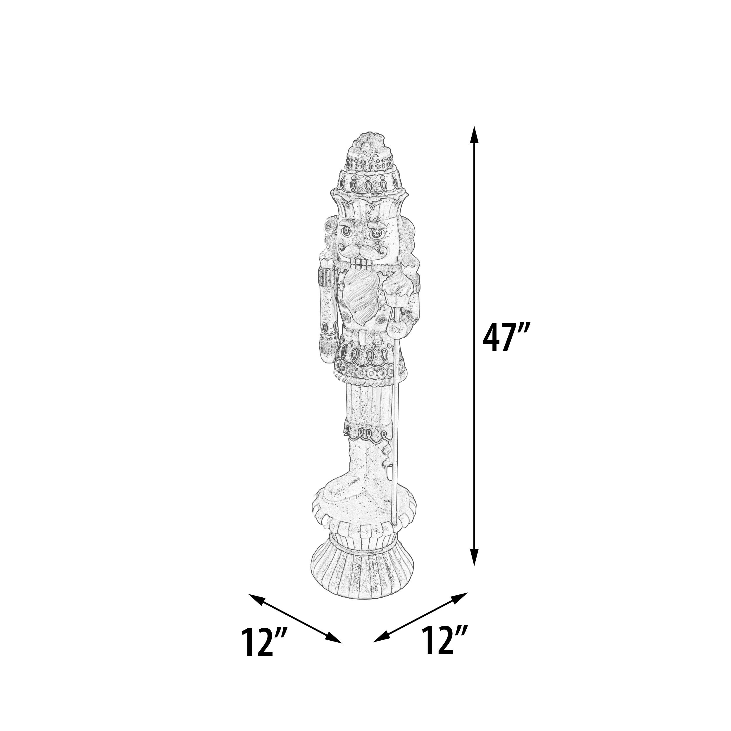 This 47-inch nutcracker statue is a symbol of protection that traditionally stands guard to offer strength and comfort. This piece combines classic charm with a regal palette, featuring a brilliant pastel colored uniform adorned with blue and pink accents. Its stern yet serene visage, complete with a majestic crown, lends an air of time-honored festivity.Perfect as a commanding focal point in a grand entryway or as part of a whimsical holiday arrangement, this figure is a testament to the enduring allure of historical craftsmanship and the spirit of the holiday season.