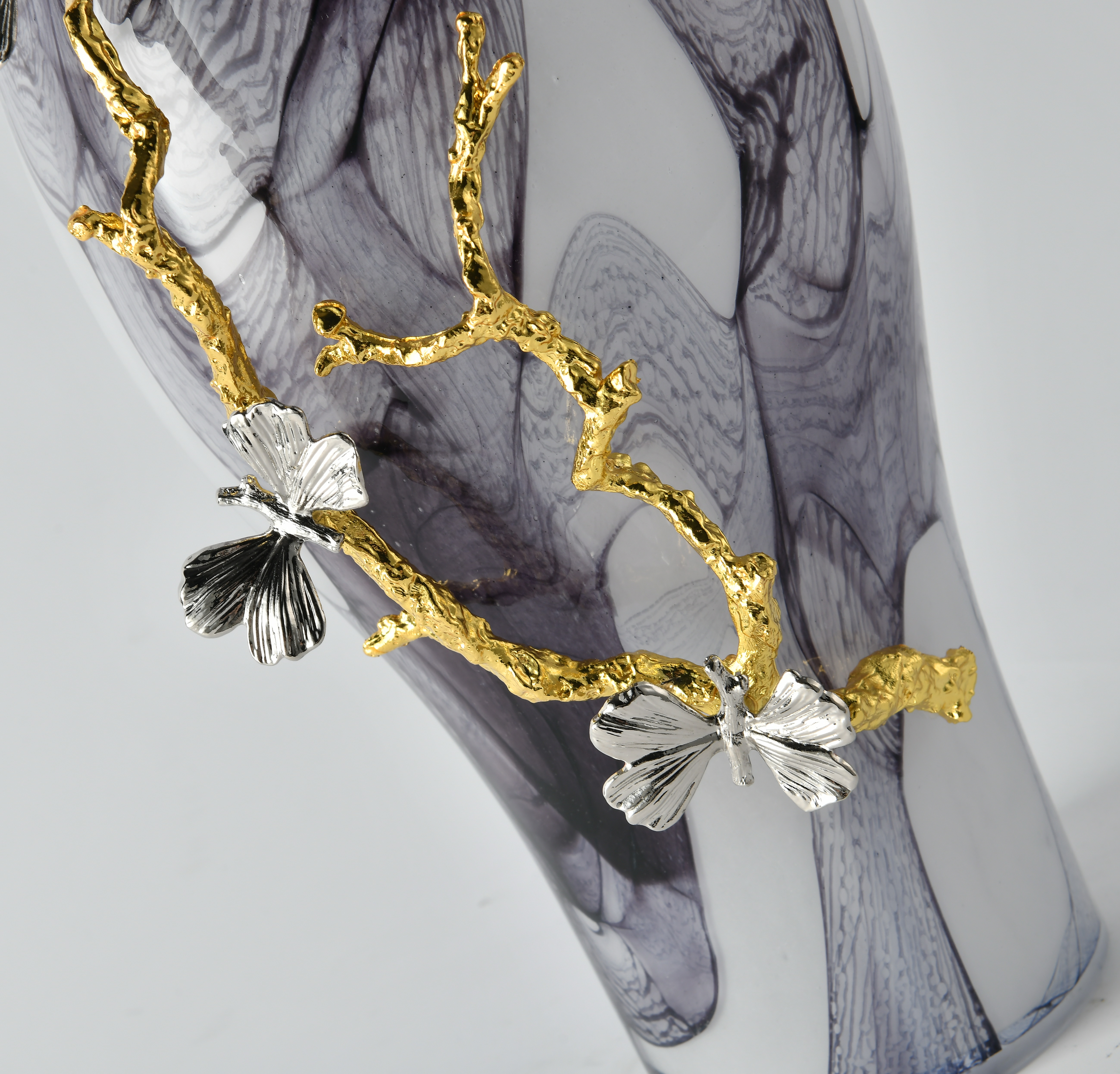 An exquisite addition to the Silver Monarch Collection, the Small Marble Bloom Vase is a refined piece of art. Featuring elegant vase in a smoky marble swirl finish, this smaller scale vase is adorned with glimmering gold branches and delicately cast silver butterflies. Whether styled solo or grouped with the larger version, it adds a sophisticated, nature inspired touch to your interior decor.