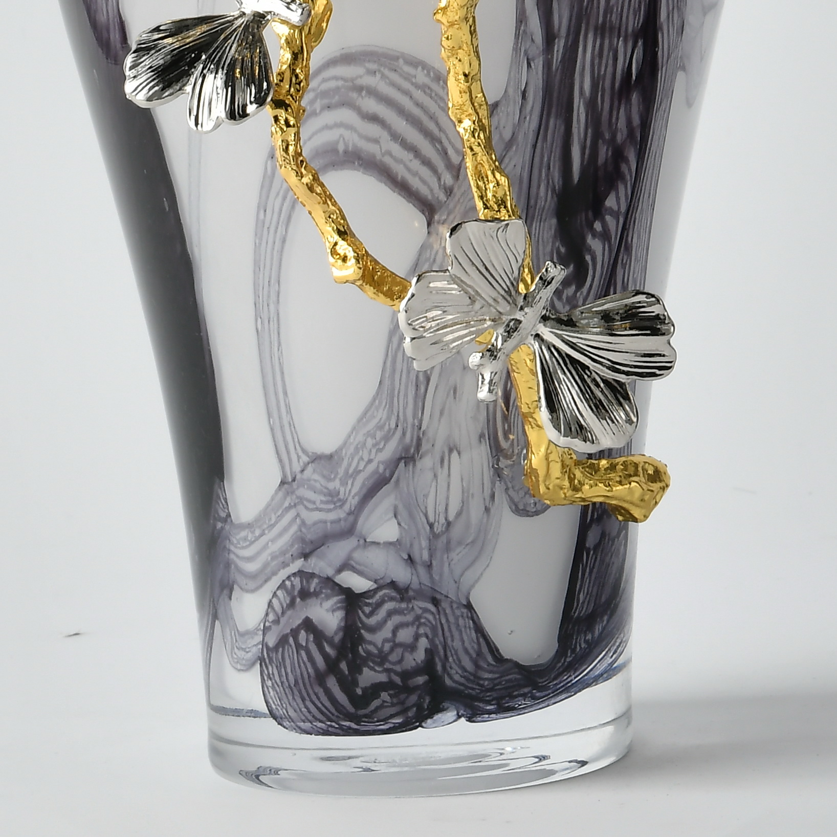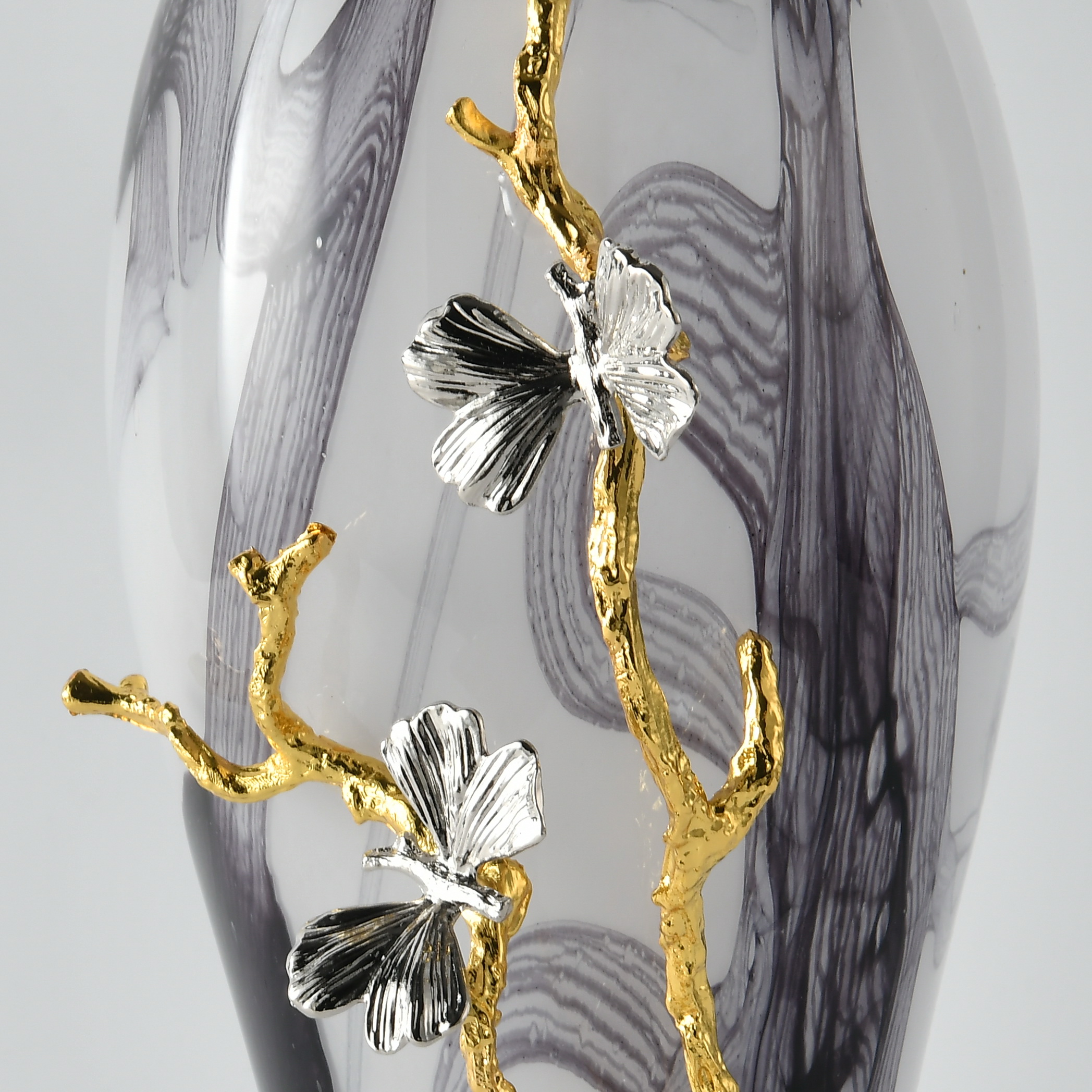 Part of our captivating Silver Monarch Collection, the Midnight Swirl Vase showcases a striking, dramatic marbled veining in smoky black and white. Elegant golden branches climb its sleek silhouette, adorned with gleaming silver butterflies—signature to the collection. This sculptural vase is both a conversation piece and a timeless decor accent, designed to elevate shelves, consoles, or entryway tables.