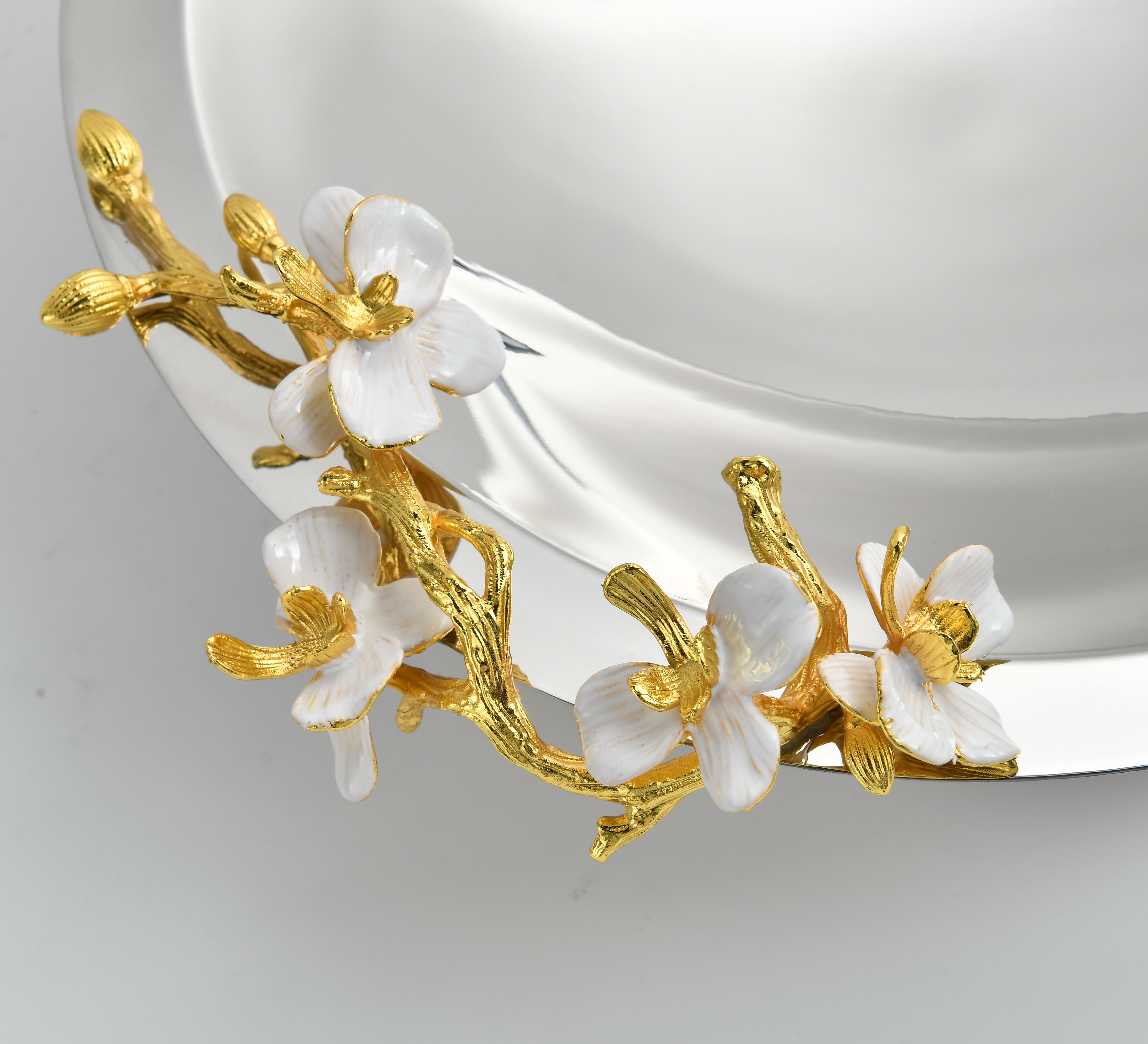 Sleek sophistication meets delicate artistry in the Orchid Bloom Polished Bowl. Crafted wth gleaming silver tones with a mirror like finish, this eye catching decorative bowl is elevated by a sculpted gold branch adorned with hand painted white orchid blossoms. Its unique blend of modern shine and floral detail makes it a standout centerpiece for any table or console. Perfect for styling on its own or filled with seasonal decor, this bowl brings elegance and luxury to your home.
