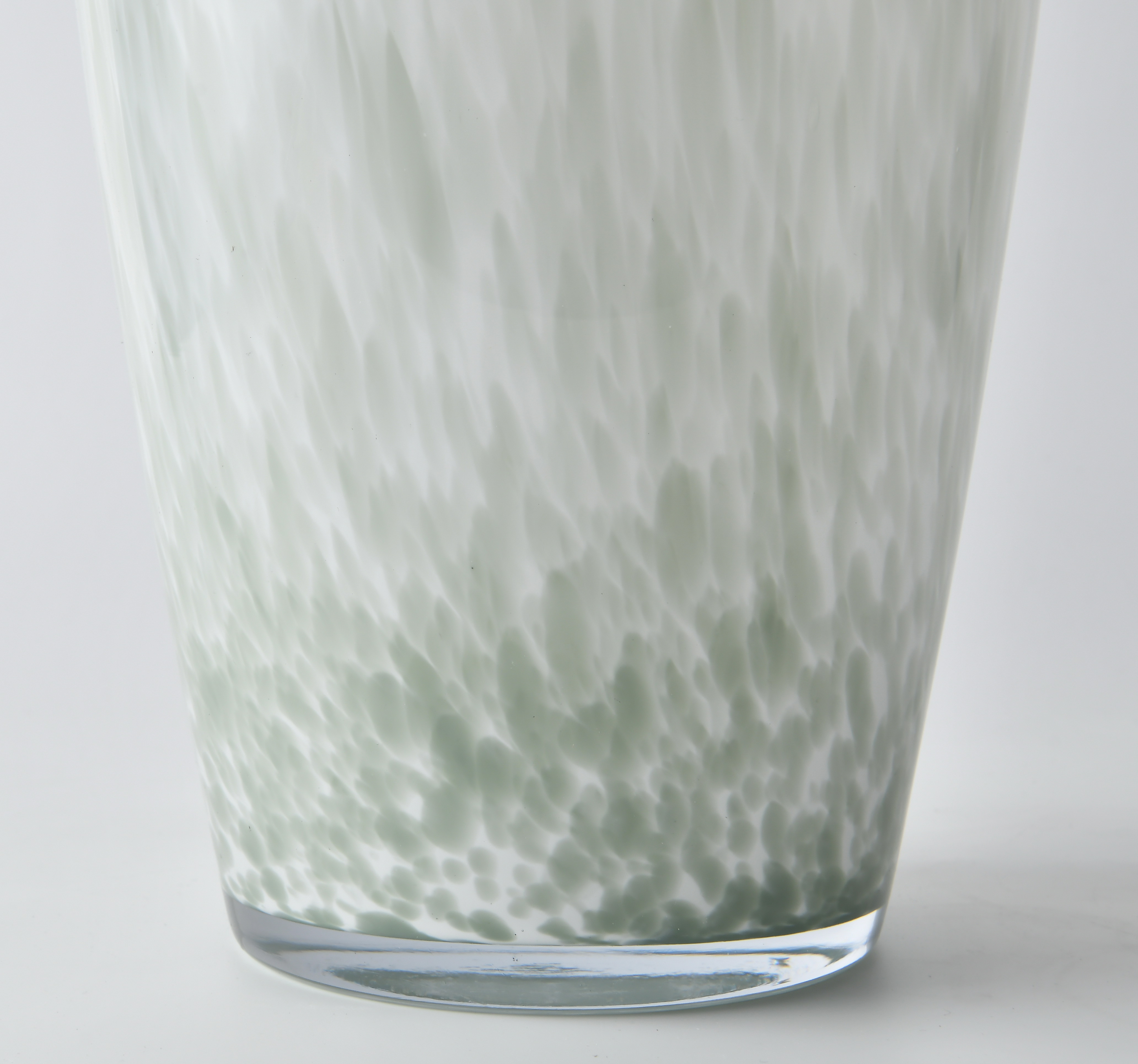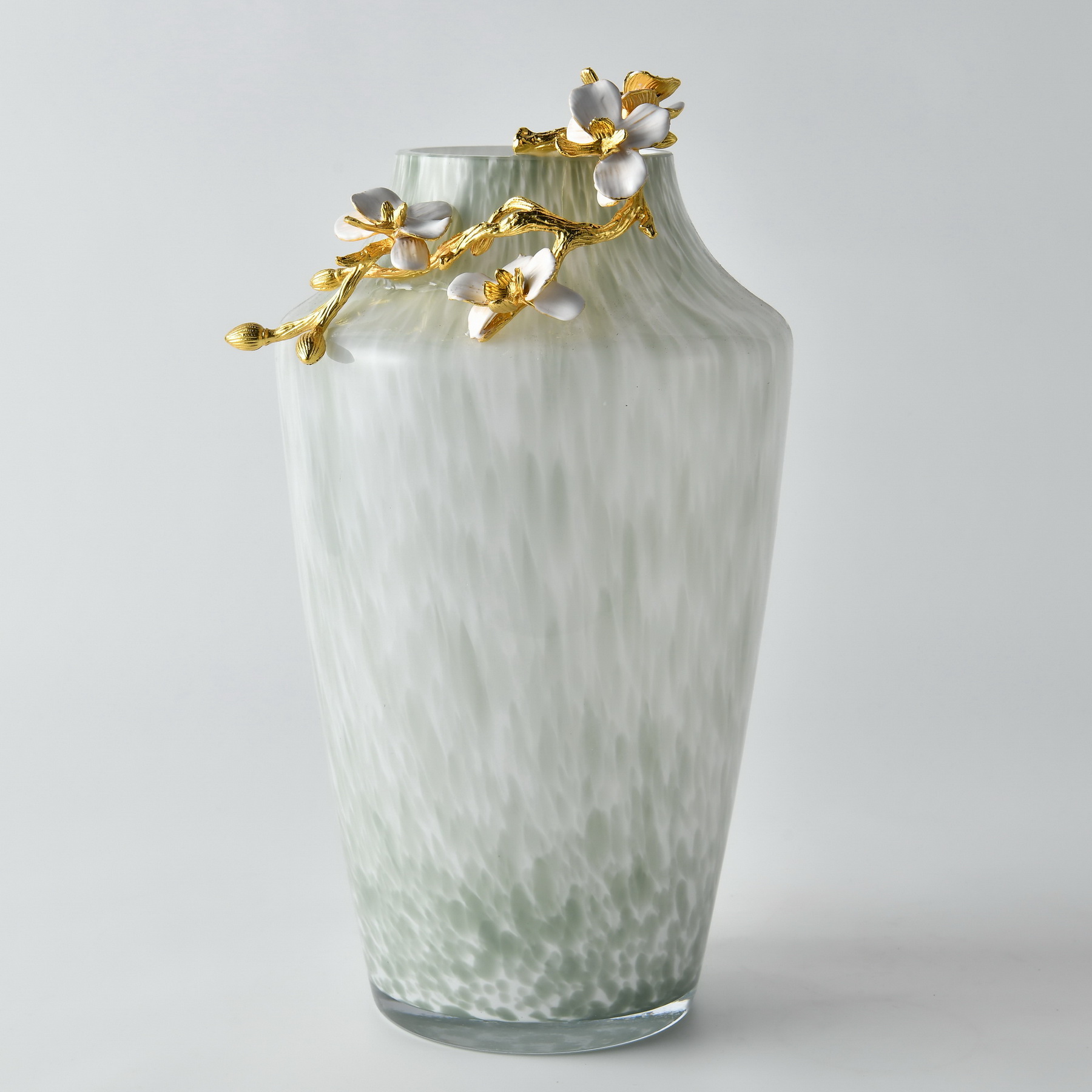 Make a sophisticated statement with the Grande Pearl Blossom Vase with Gold Floral Branch. Designed for impact, this tall and elegant vase features a refined sage and white speckled glass body, crowned with a sculptural golden branch adorned with lustrous pearl white blossoms. Its grand scale and graceful silhouette create a luxurious focal point for any room.Whether styled with tall florals or showcased as a sculptural accent, this vase blends timeless elegance with handcrafted artistry.
