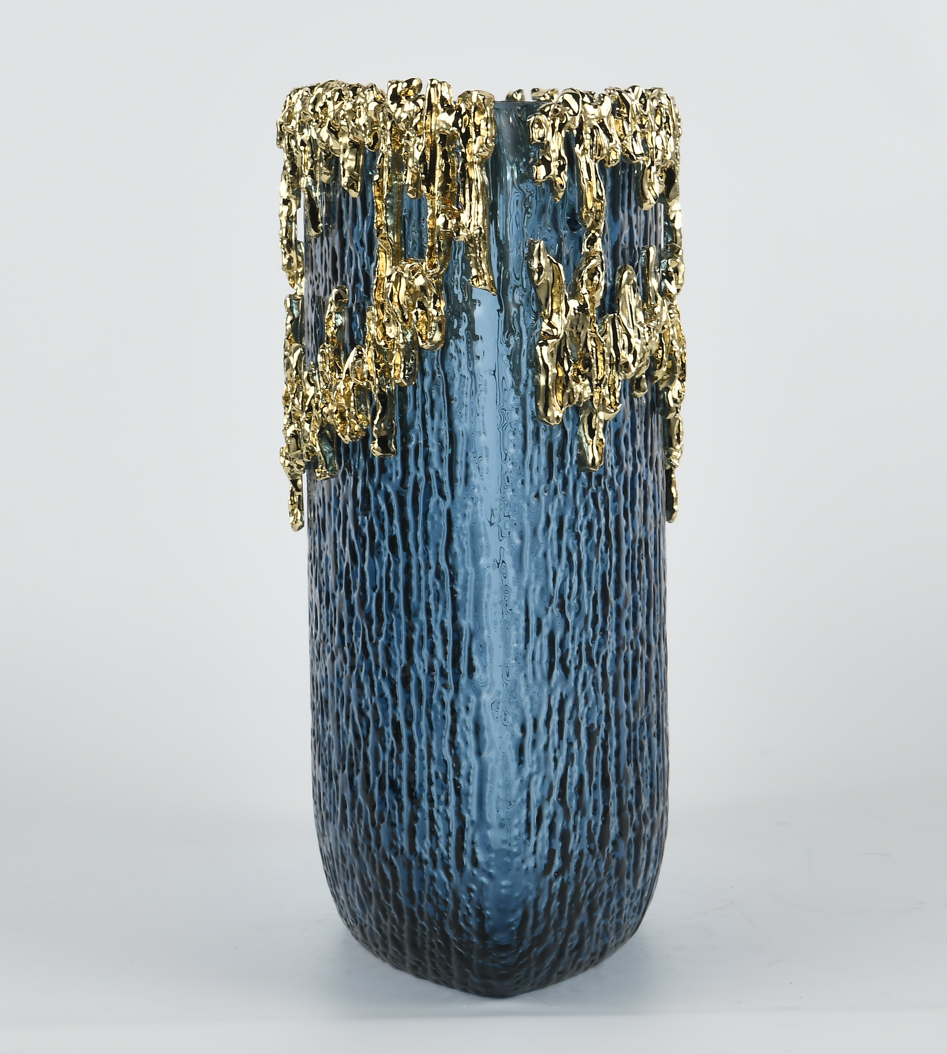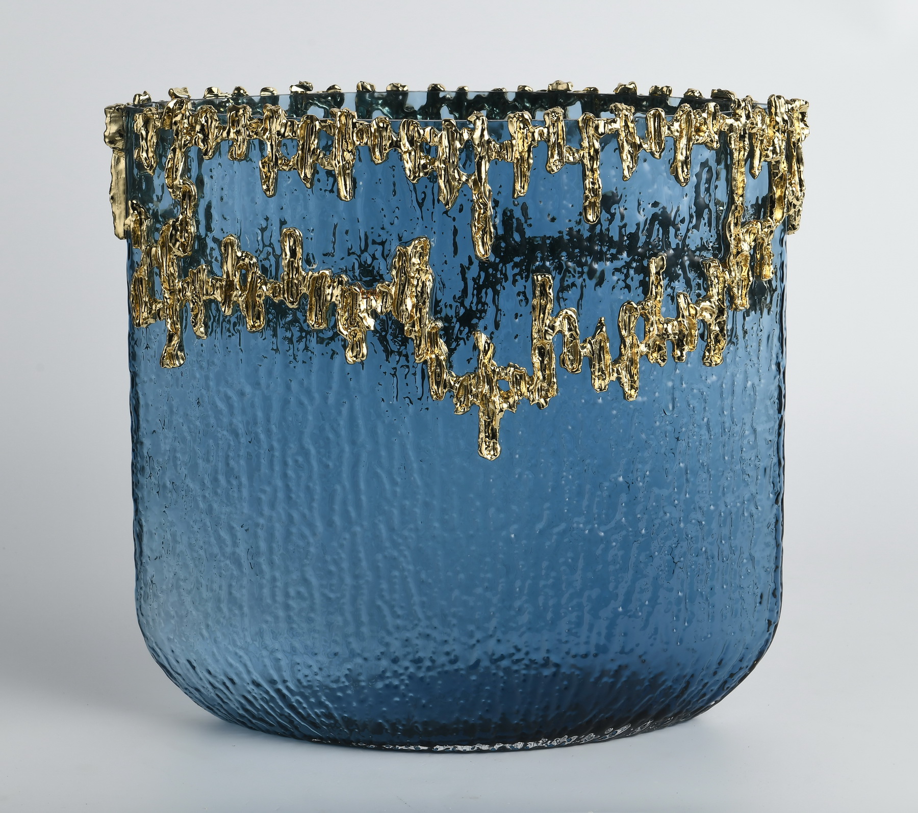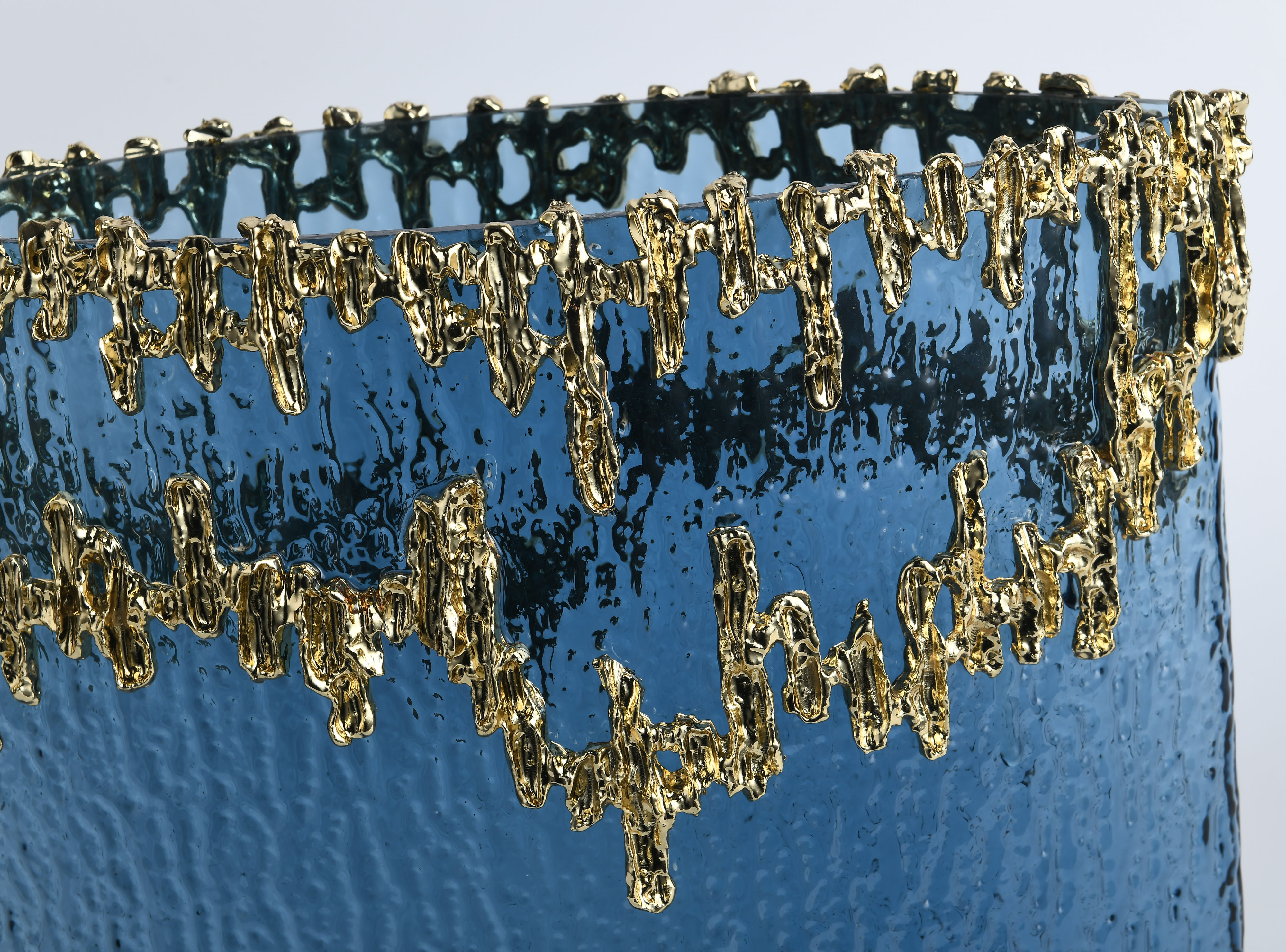 Make a bold statement with the Small Blue Cascade Luxe Vase—a stunning fusion of modern elegance and artistic flair. Featuring a rich cobalt blue body with a textured finish, this cylindrical vase is crowned with a dramatic cascade of molten gold detailing that shimmers like liquid metal. Perfect for elevating floral arrangements or standing alone as a sculptural showpiece. Turn any room into a gallery of style with this high-impact vase that blends glamor, craftsmanship, and contemporary design.