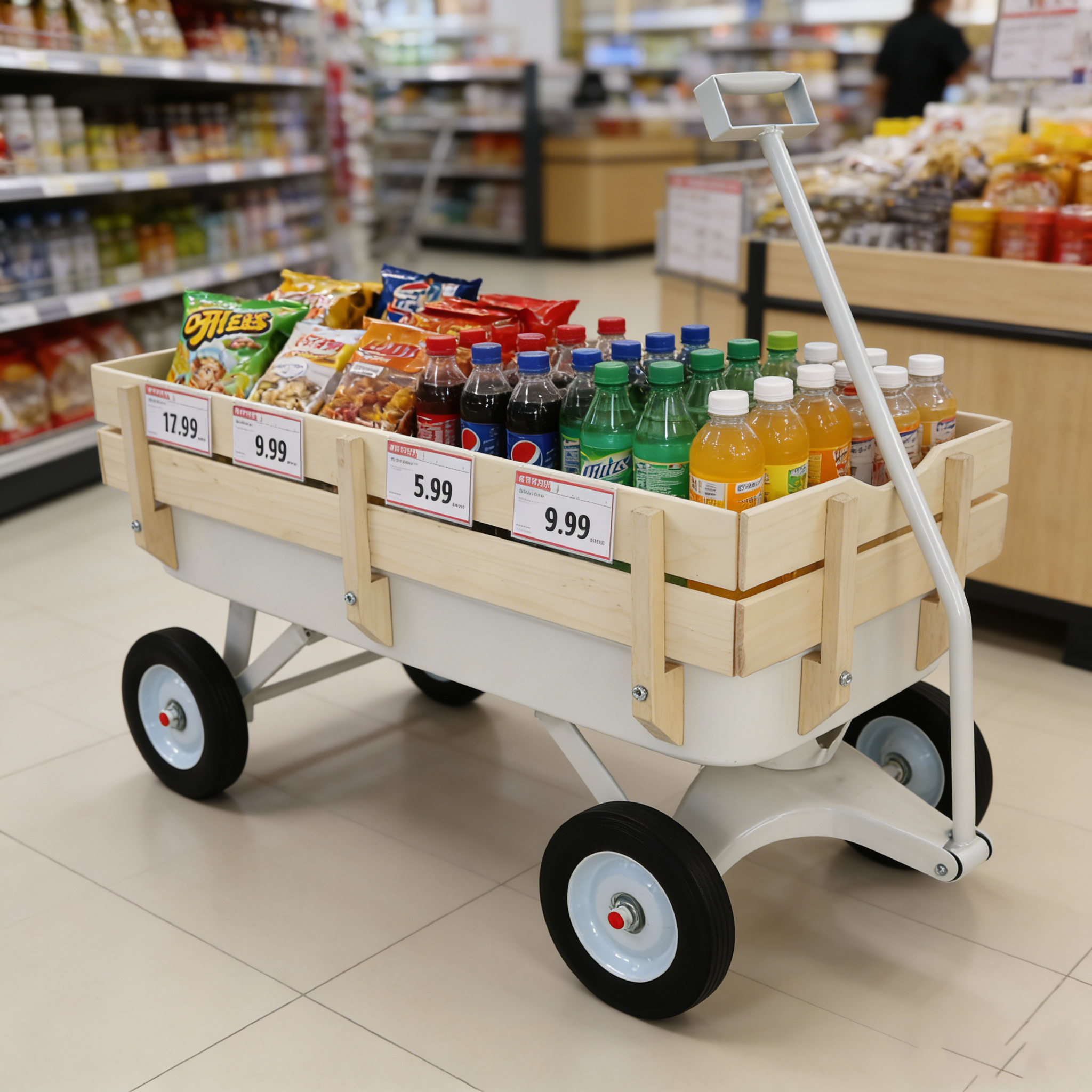 • Structural design: An open wooden fence surrounds the metal base, creating a semi-enclosed storage space. This not only facilitates the retrieval and placement of items but also prevents small objects from slipping off. The metal handle is of a simple square design, providing a comfortable grip and flexible pushing and pulling.