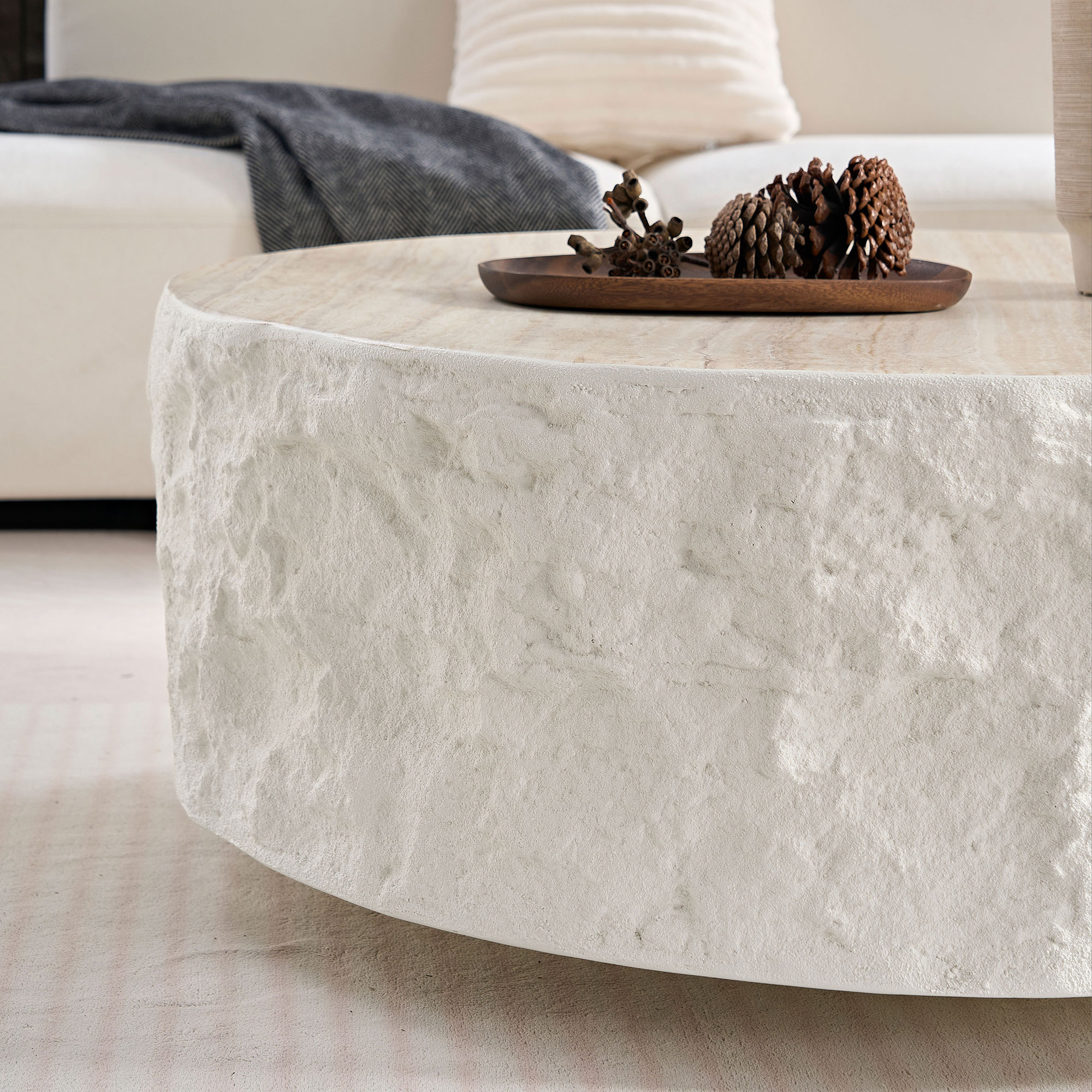 • [Modern Designed Coffee Table]The coffee table has a imitation stone design,the texture and feel of the stone are designed around the coffee table, which enhances its texture and design. The surface is smooth and easy to care for, and only needs to be gently wiped with a damp cloth to easily remove stains.