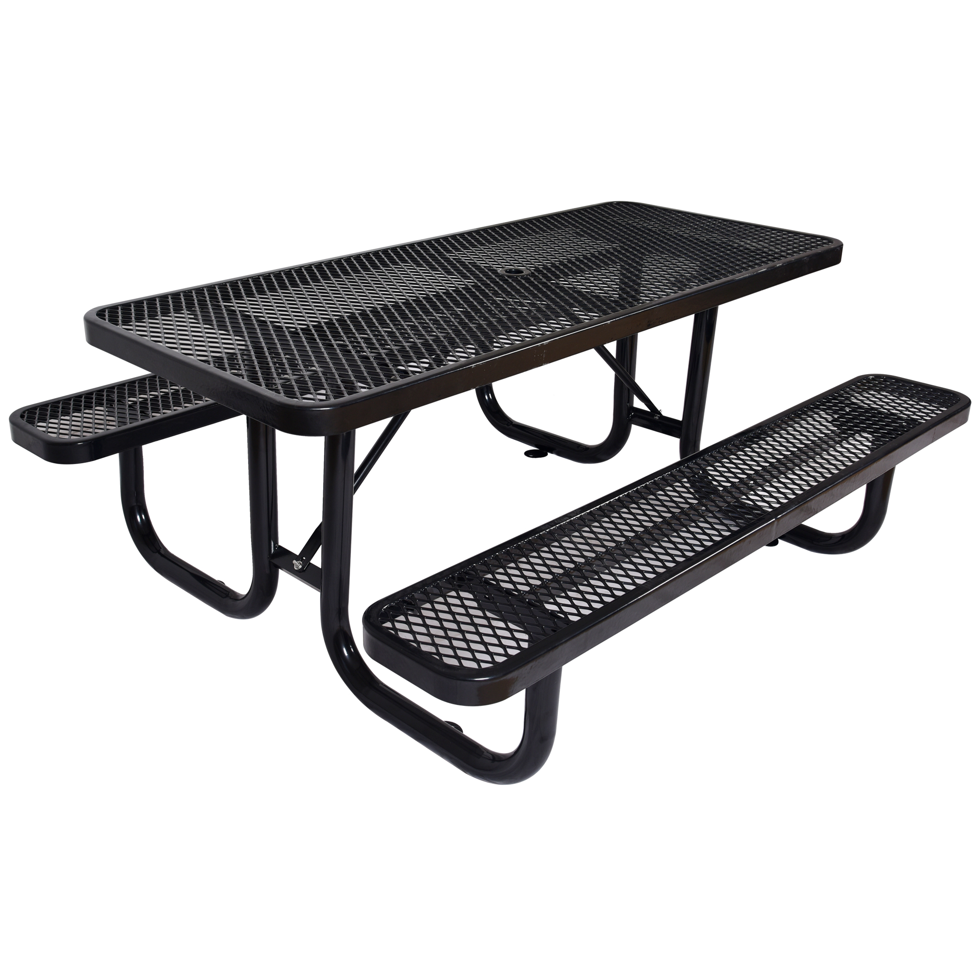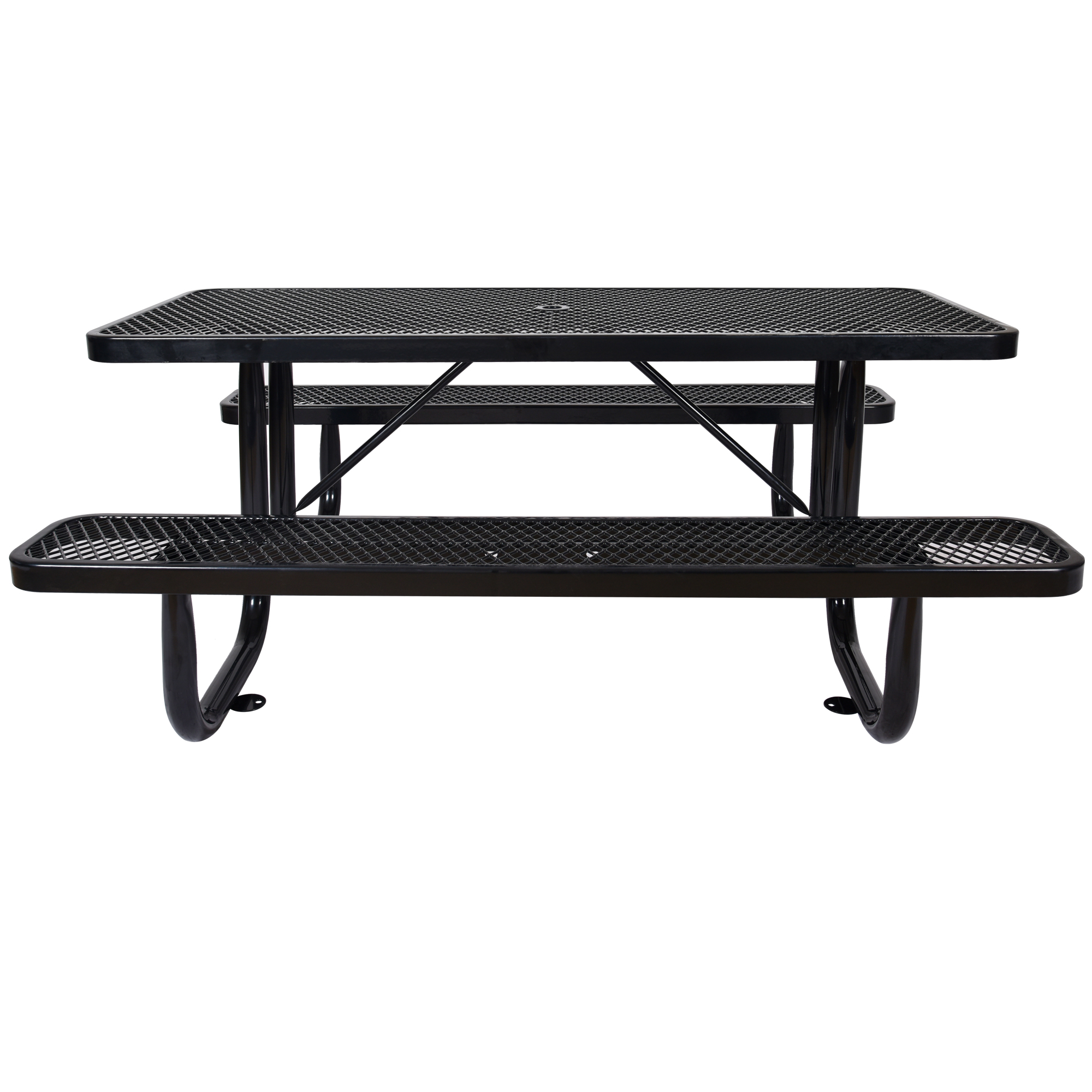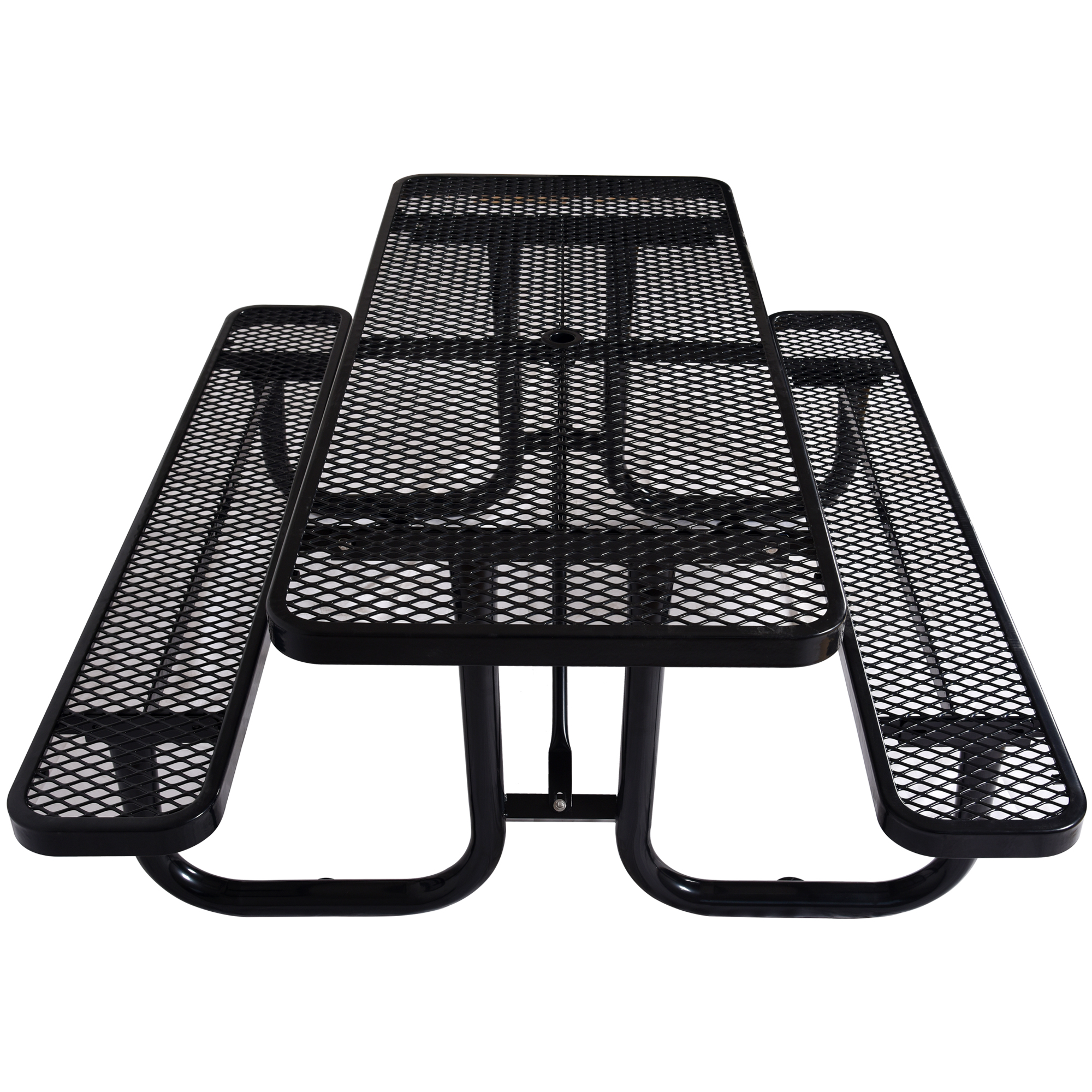 heavy-gauge perforated metal with a durable thermoplastic coating on benches and tabletop accept an umbrella with a pole of up to 1-1/2" diameter Specifications: Table Top Dimensions: 72" Rectangular Bench Dimensions: 72"l x 12W Overall Dimensions: 72"L x62"W x 29-1/2"H Table Top Color: BlACK Frame Color: Black Frame Material: Powder-Coated Steel Mounting Type: Portable or Surface