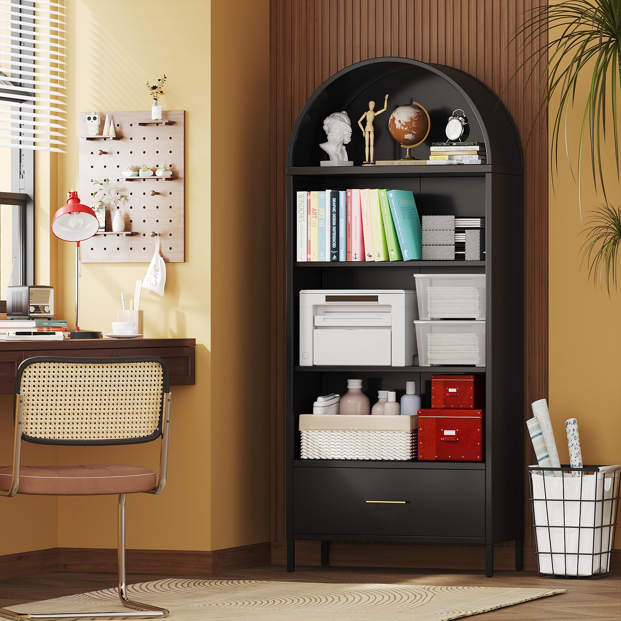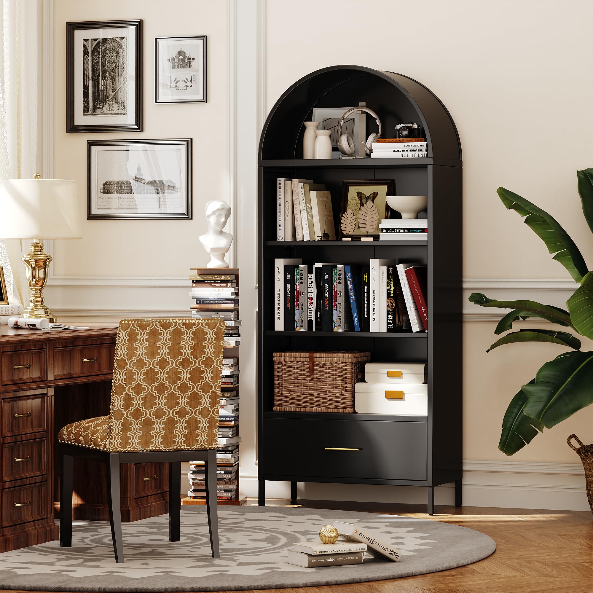 Home > 73inch Tall Arched Bookcase Cabinet, 5-Tiers Metal Black Arched Bookshelf With Drawer For Living Room, Home Office, Assembly Required