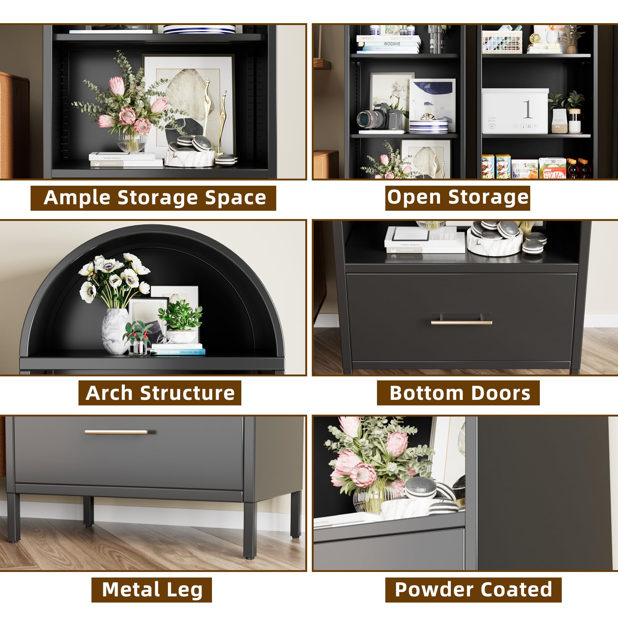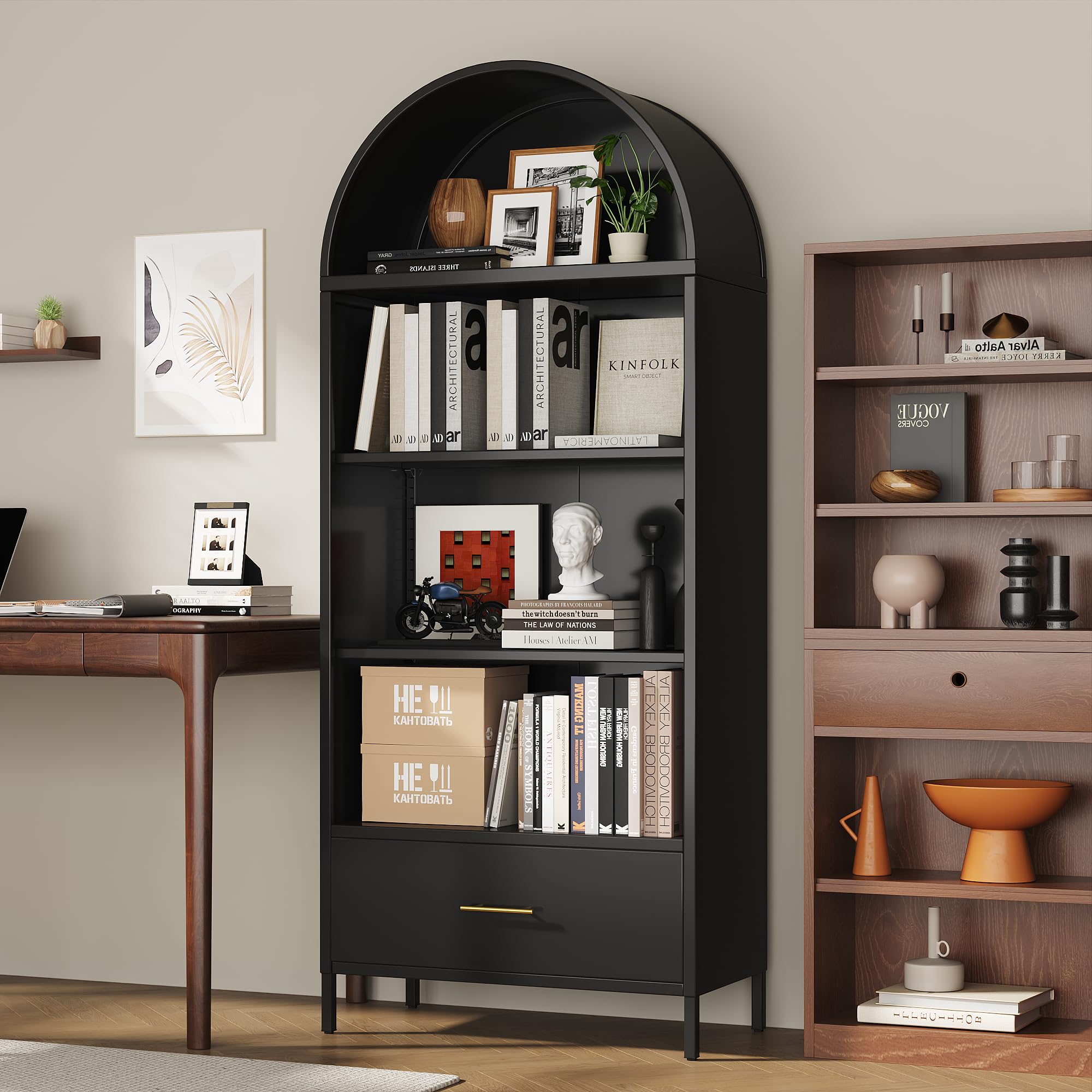 • Enhance your space with the elegant arched cabinet bookshelf. Its graceful arched design and refined structure, such as the arched black bookshelf option, add a touch of sophistication to your home or office decor.