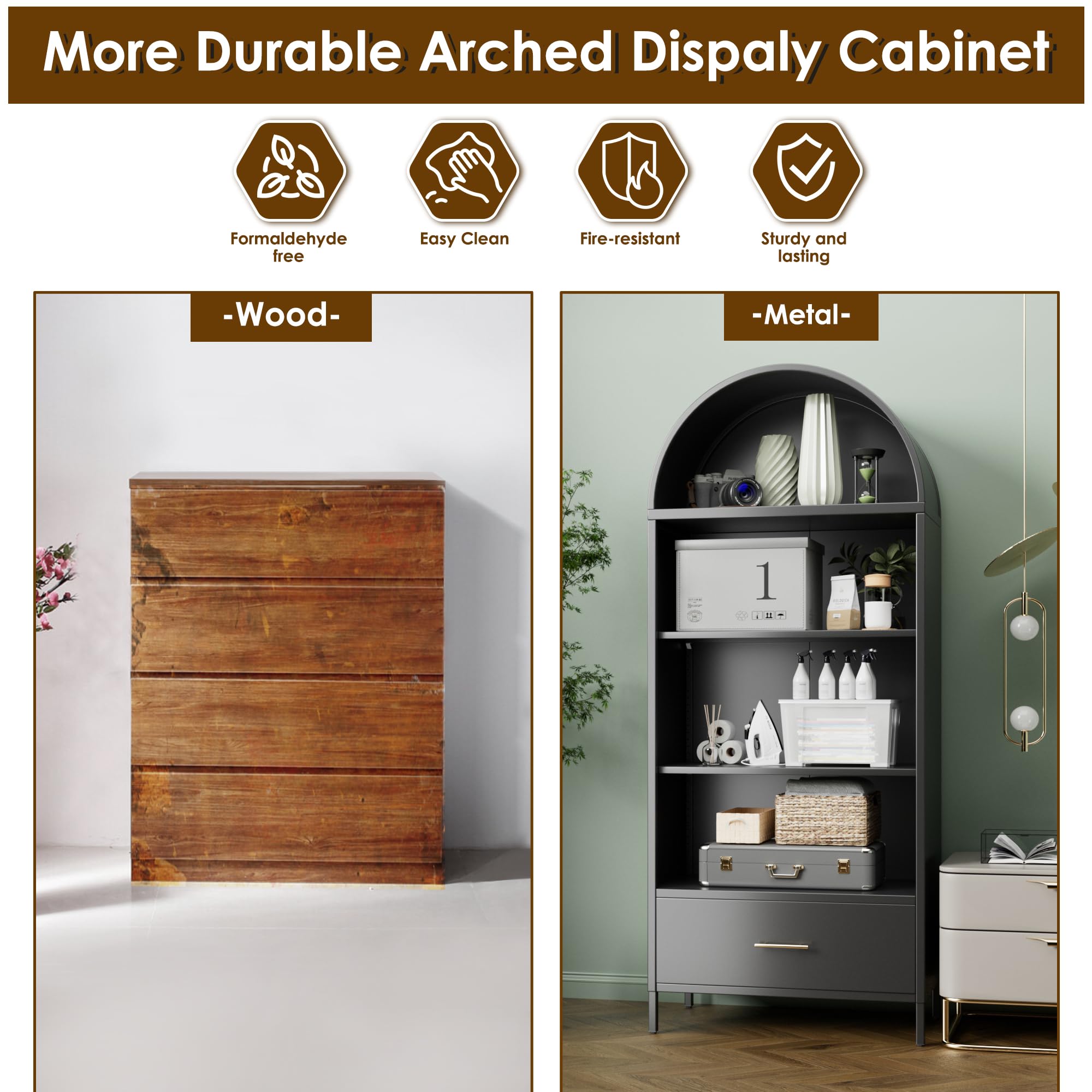 • Discover our arch shelf cabinet with an advanced electrostatic powder-coated finish. This process ensures a colorless, odorless, and formaldehyde-free surface that is fireproof, waterproof, and moisture-resistant—offering safety and durability for any room.