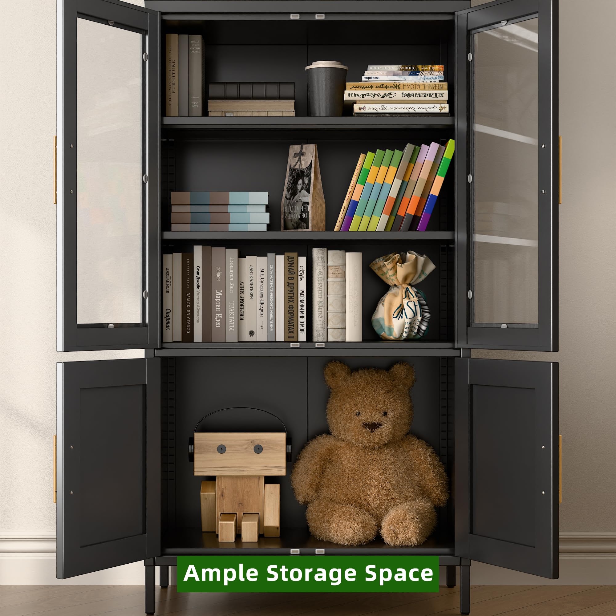 • 【Arched Cabinet with Doors】Black arched cabinet has 2 glass doors and 2 metal doors, can store different items. The design of the glass door not only makes it convenient for us not to open the door to confirm the items stored inside but also to isolate the dust in the air