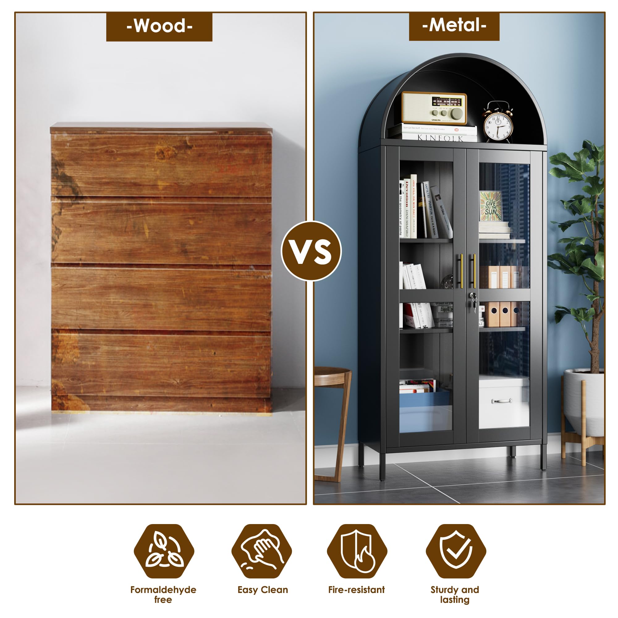 Metal Arched Cabinet With Lock, Arch Display Bookcase With Glass Doors Shelves, Modern Freestanding Kitchen Pantry Storage Cabinet For Dining Room, Ho