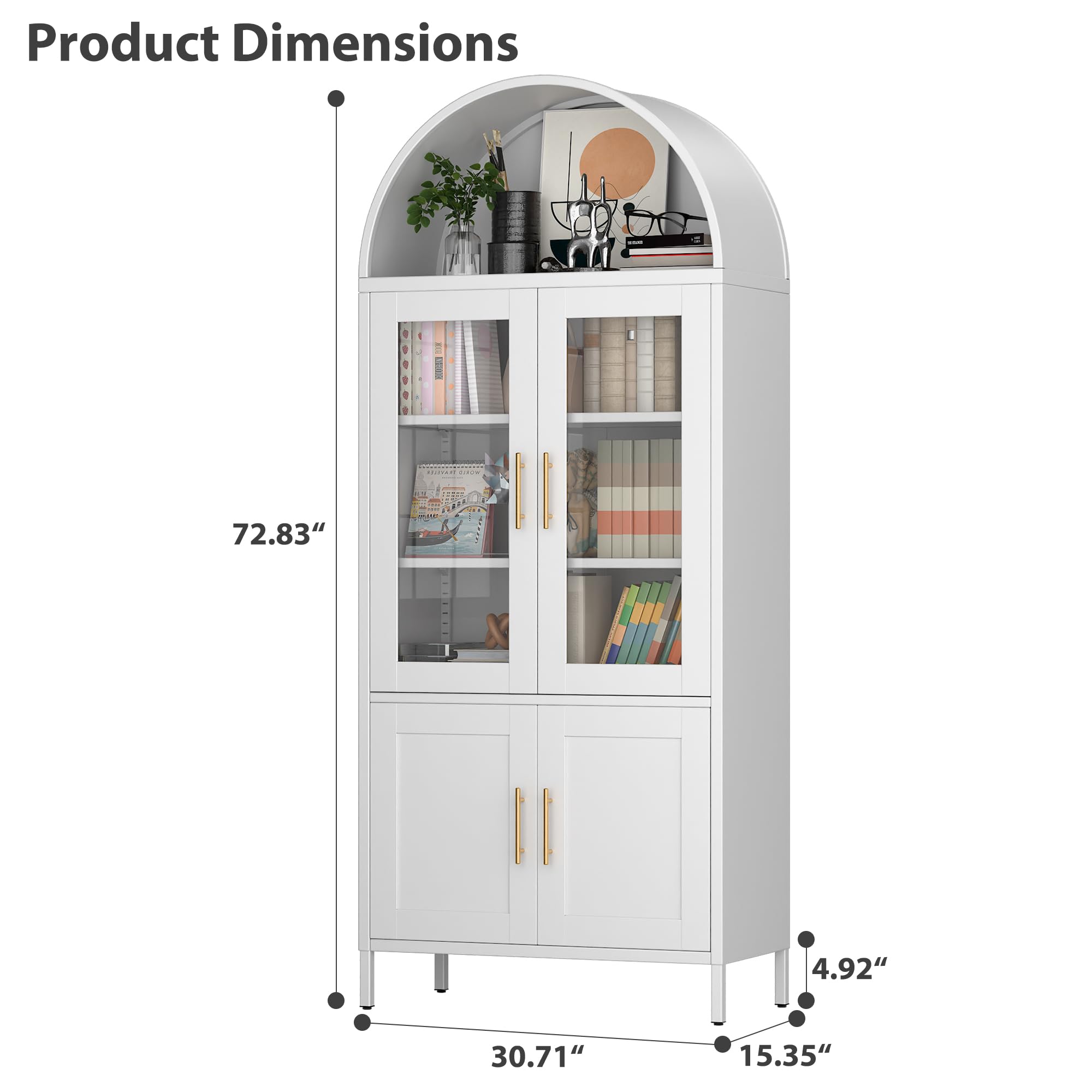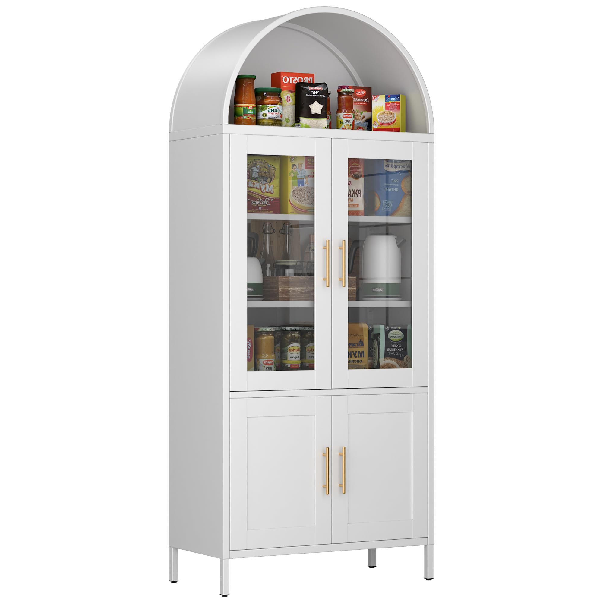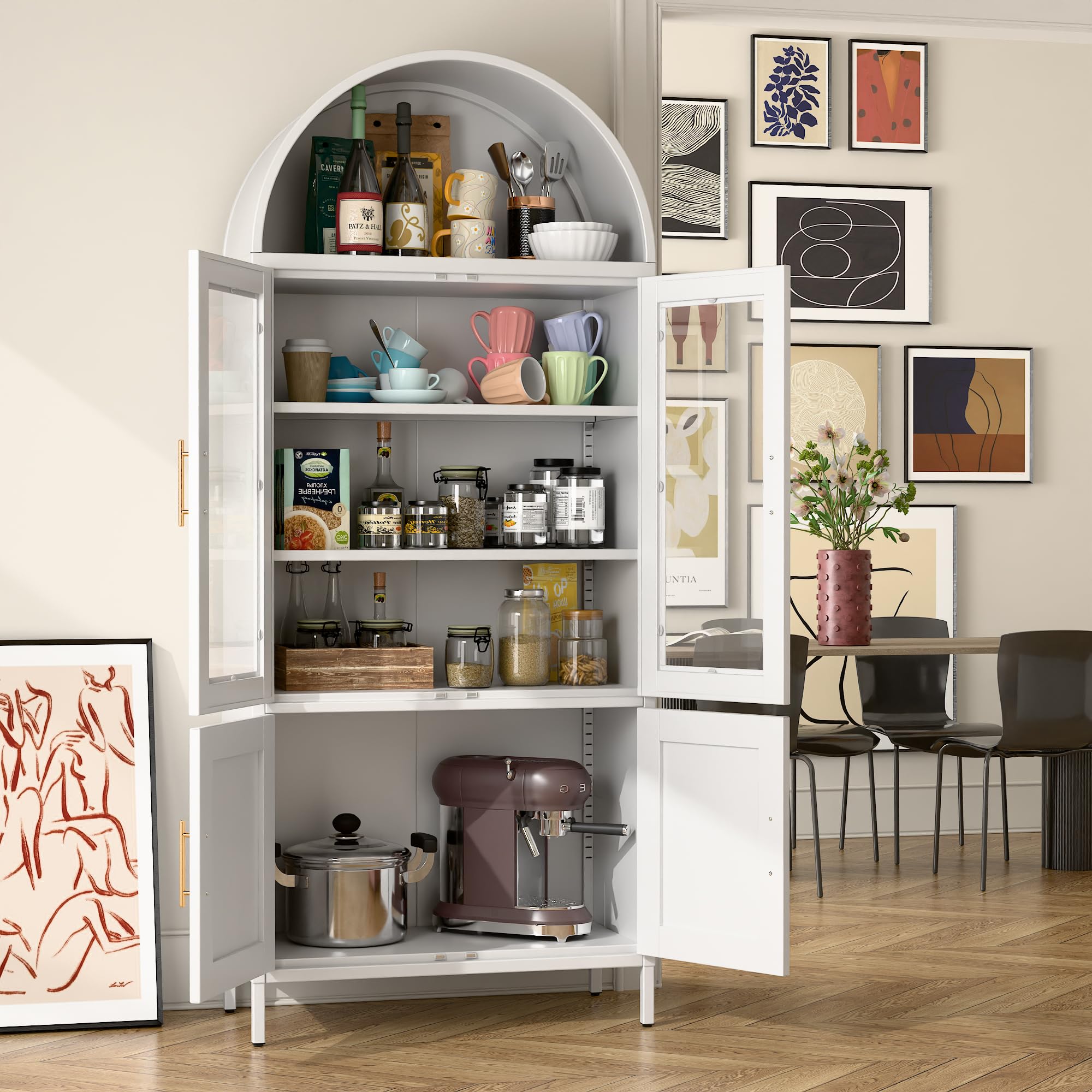 • 【Stylish Arch Design】The metal arched kitchen pantry cabinet is a stunning combination of design and practicality. Its gracefully arched silhouette serves as a statement piece, adding modern elegance to your home office. With two fully enclosed glass doors that showcase your china or prized possessions, this tall arched cabinet is stylish and functional, making it a perfect addition to any room.