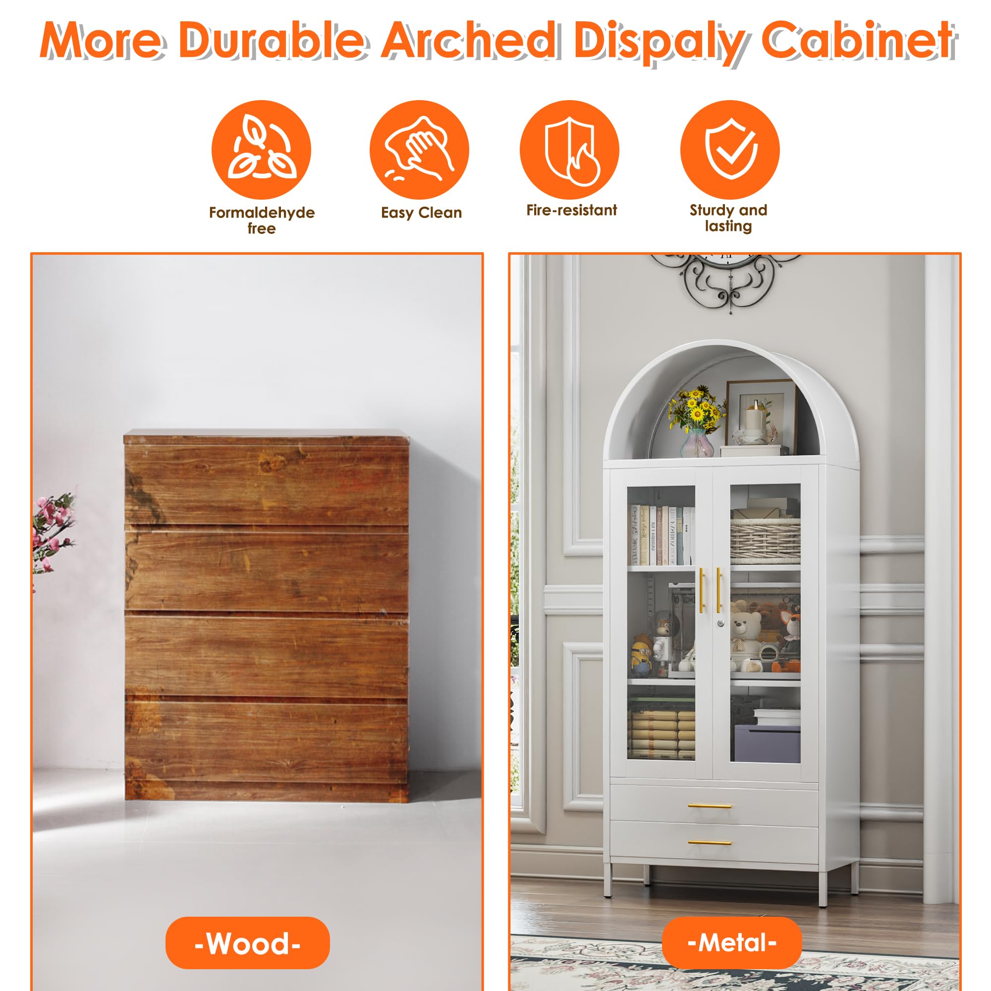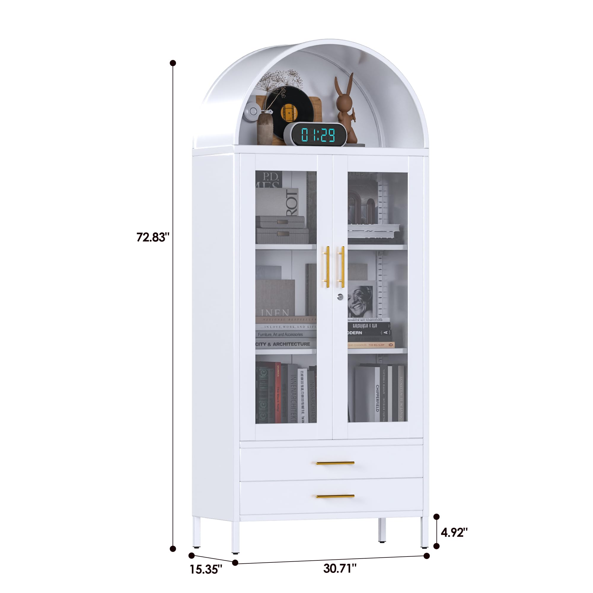73'' Tall Metal Arched Display Cabinet With Glass Doors, Freestanding Arch Kitchen Pantry Cabinet With 2 Drawers For Home Office Bookcase White