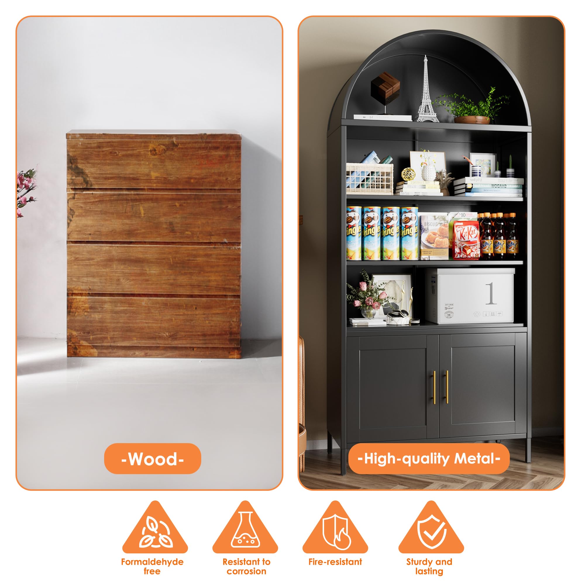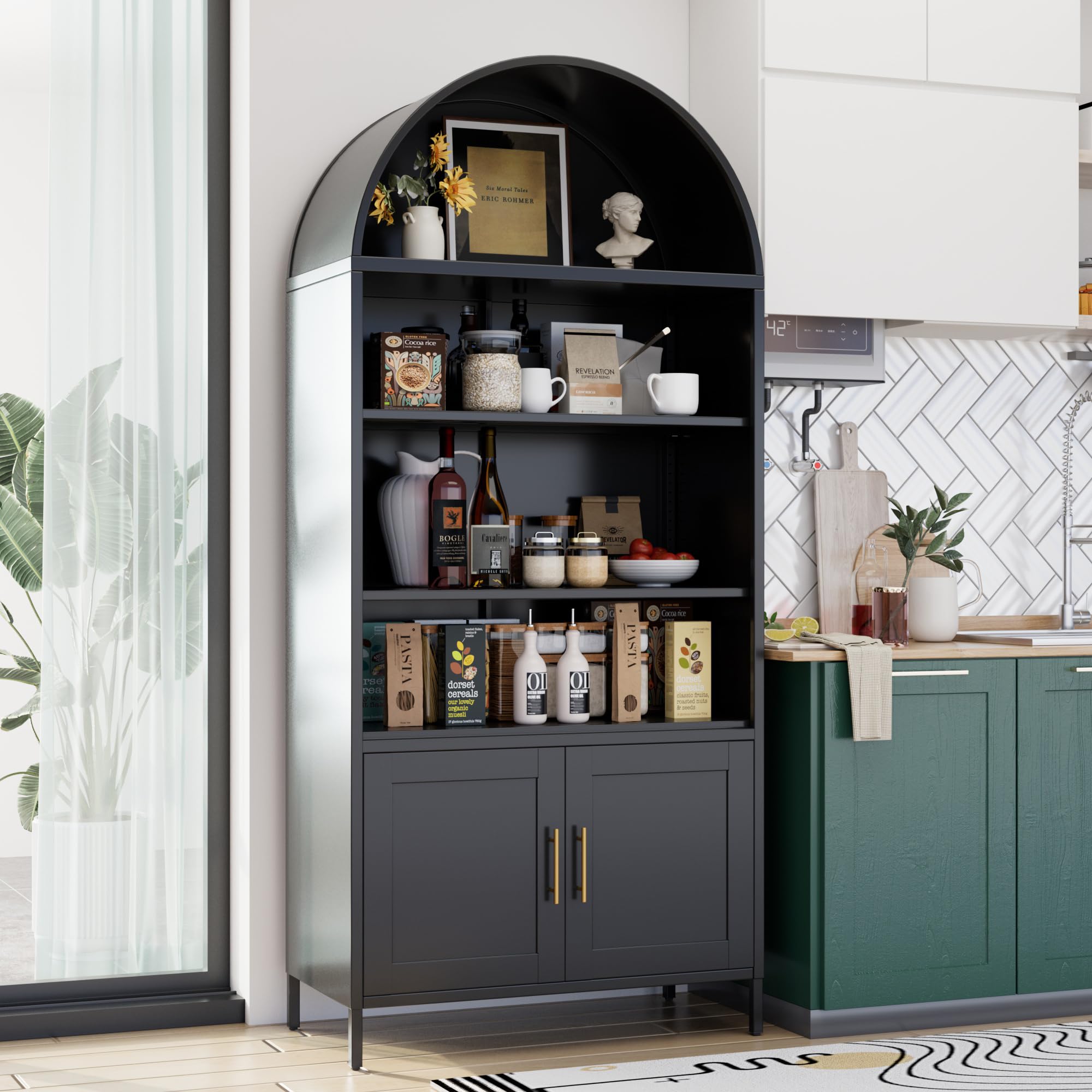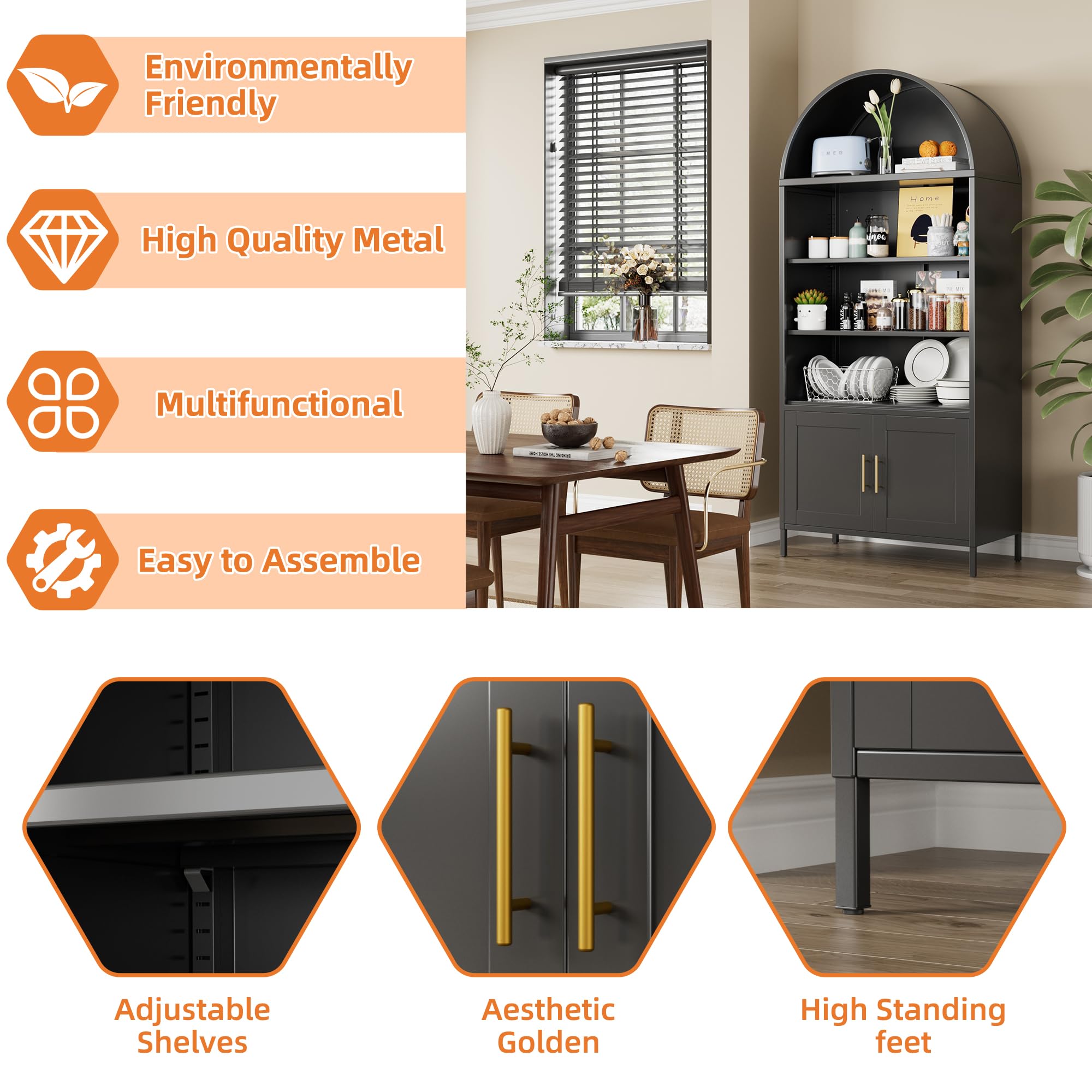 • Cleaning and Durability - The tall arched bookshelf are constructed from high-density metal, providing excellent stability and durability. With a 4.8-inch clearance between the bottom of the pantry cabinet and the floor, you can easily access and clean underneath, making maintenance simple. This thoughtful design helps keep your kitchen tidy and streamlines your cleaning routine.