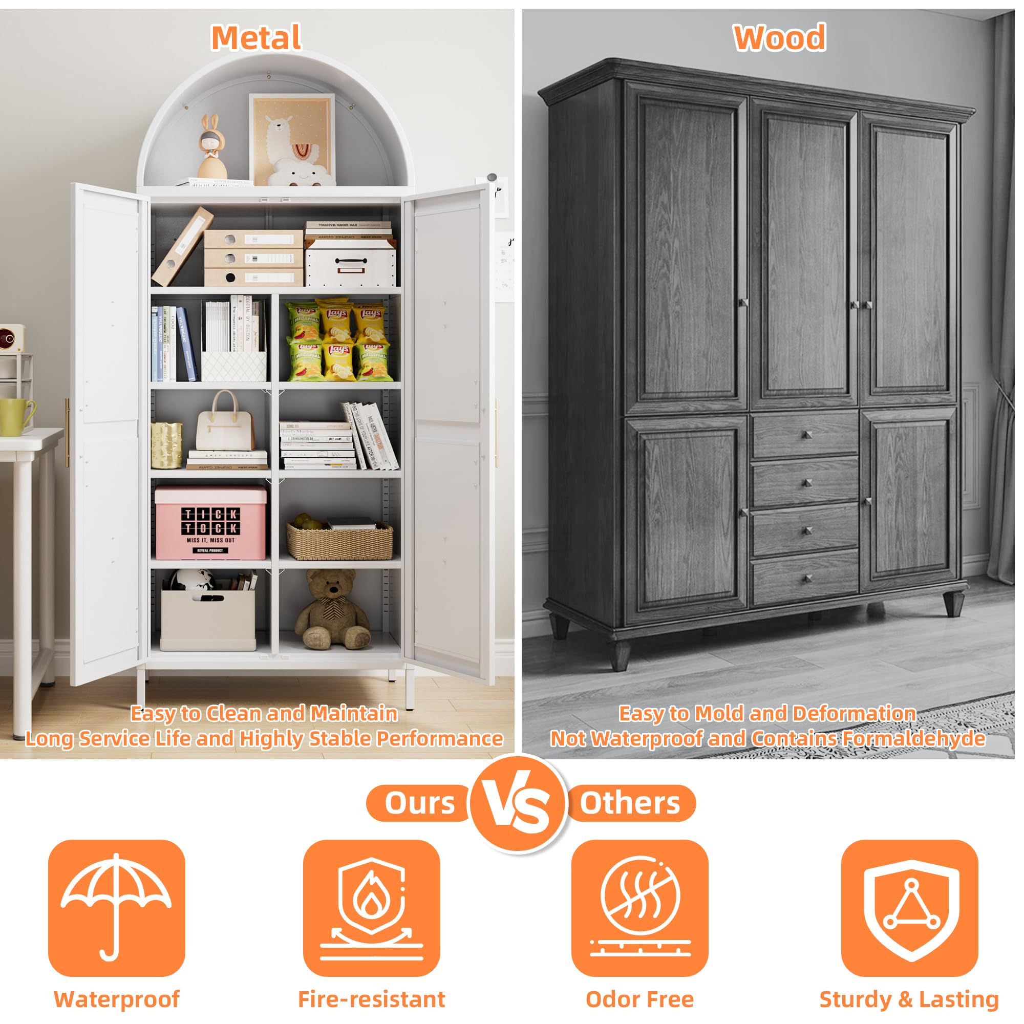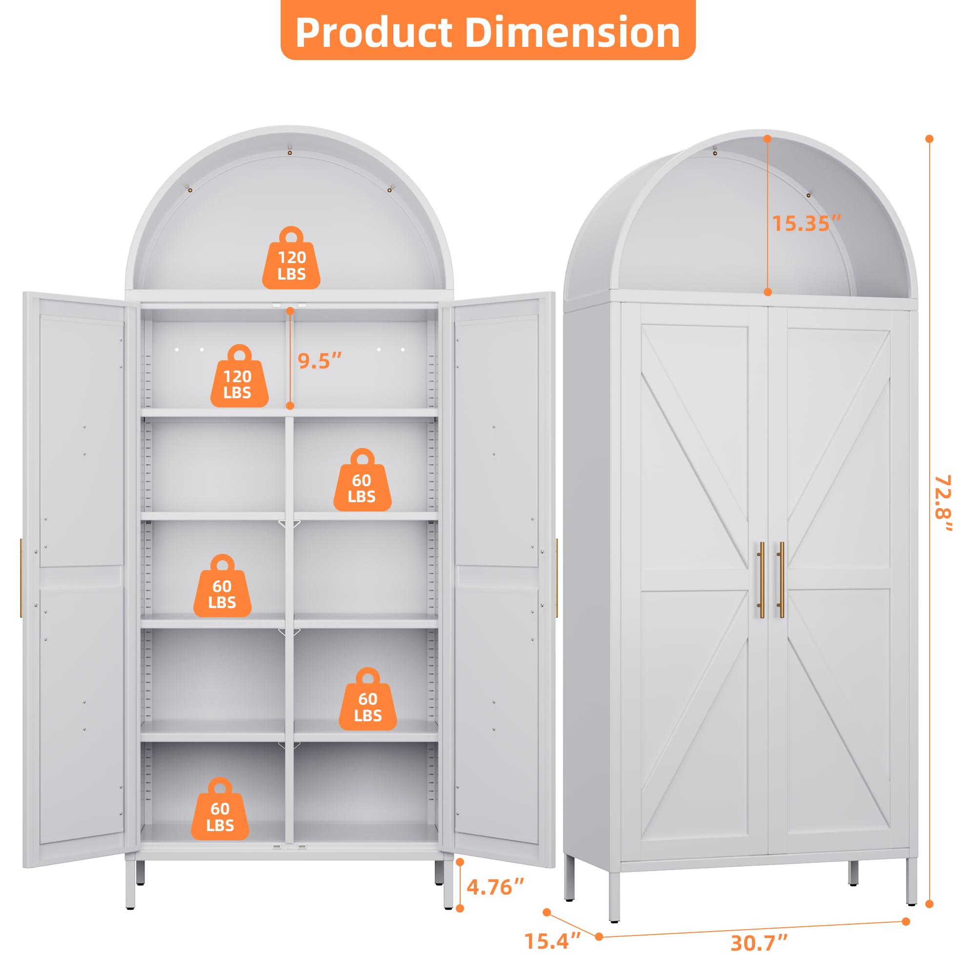 • Durable and Sturdy Design - Crafted for durability, this arched pantry cabinet features two stunning gold metal handles that add a touch of sophistication. Crafted from high-quality steel, this durable cupboard promises exceptional sturdiness and longevity, making it a reliable addition to your home.