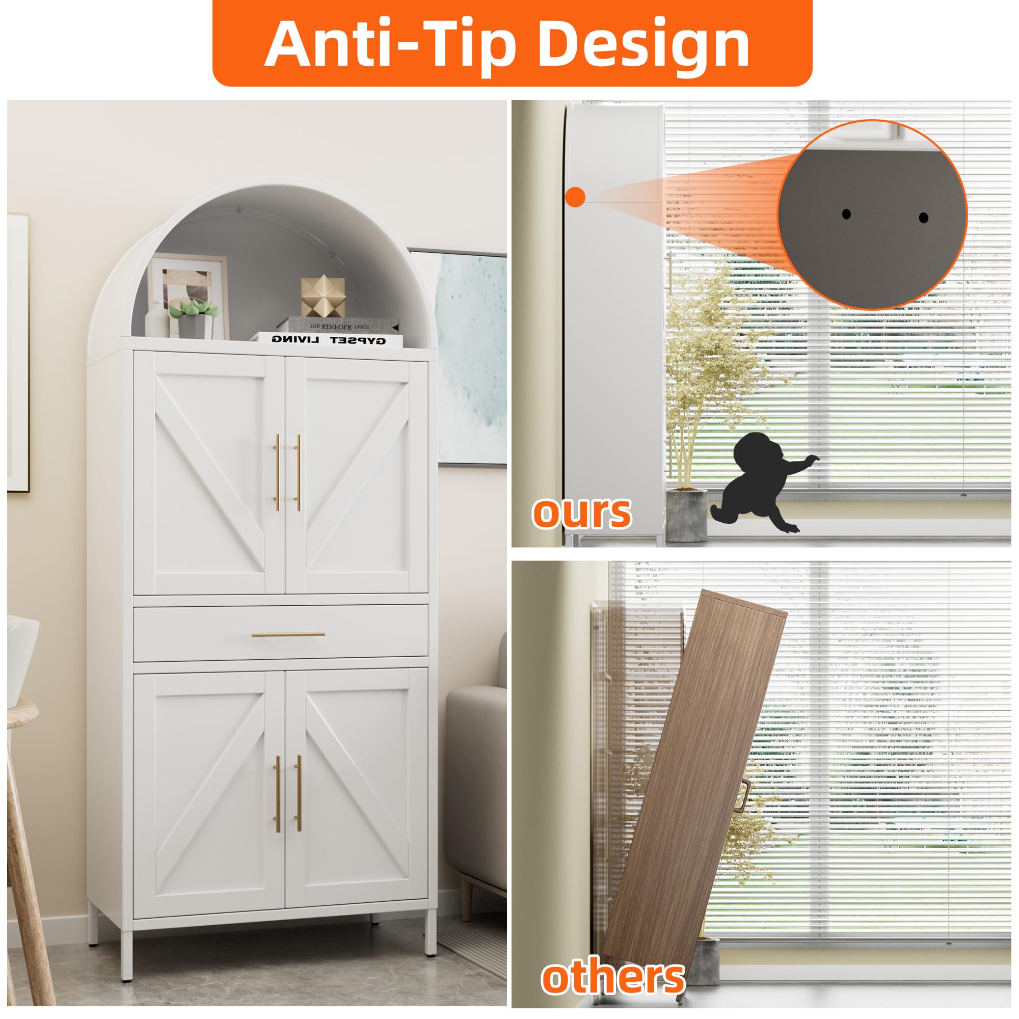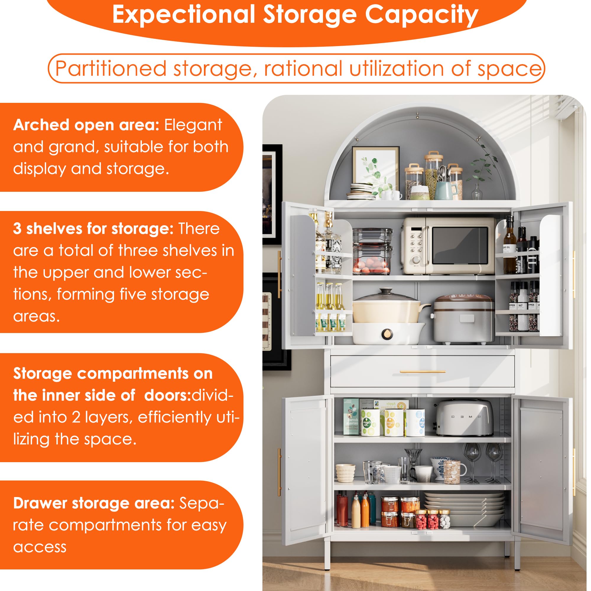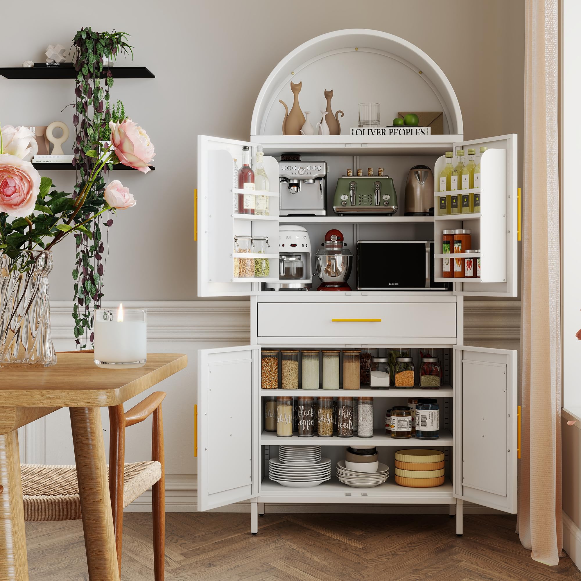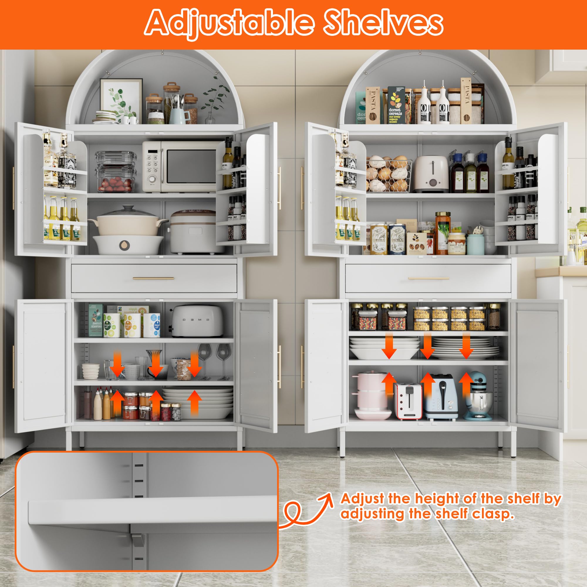 • Adjustable Feet and Magnetic Closure:When the arched kitchen pantry cabinet is uneven or the doors are not aligned, you can adjust the adjustable feet to align them.On the arched kitchen pantry cabinet, a strong adhesive Magnetic closure has also been added to ensure smooth and safe door closure. Sufficient space is suitable for various places such as kitchens, bedrooms, living rooms, and warehouses.