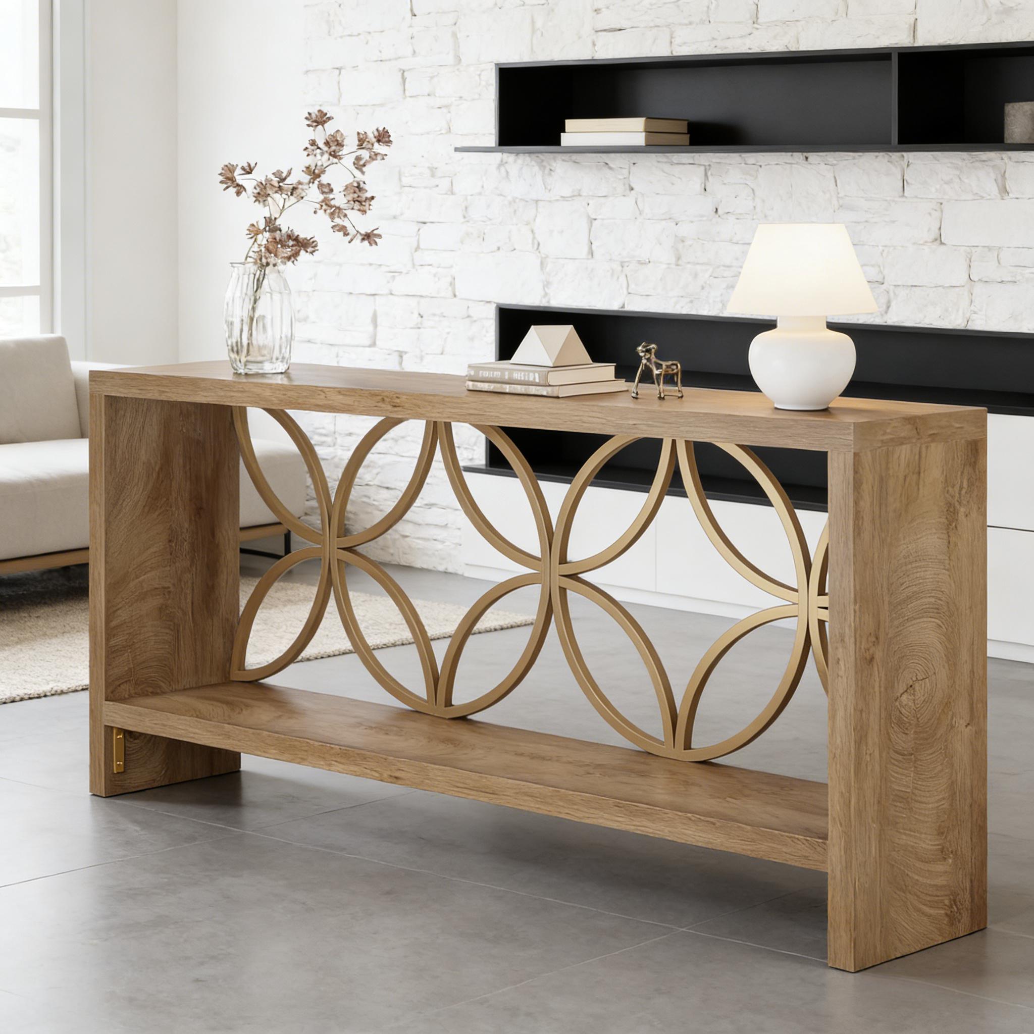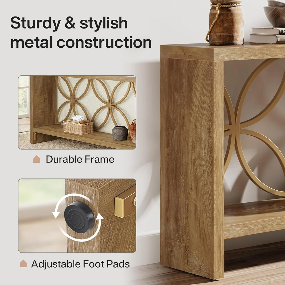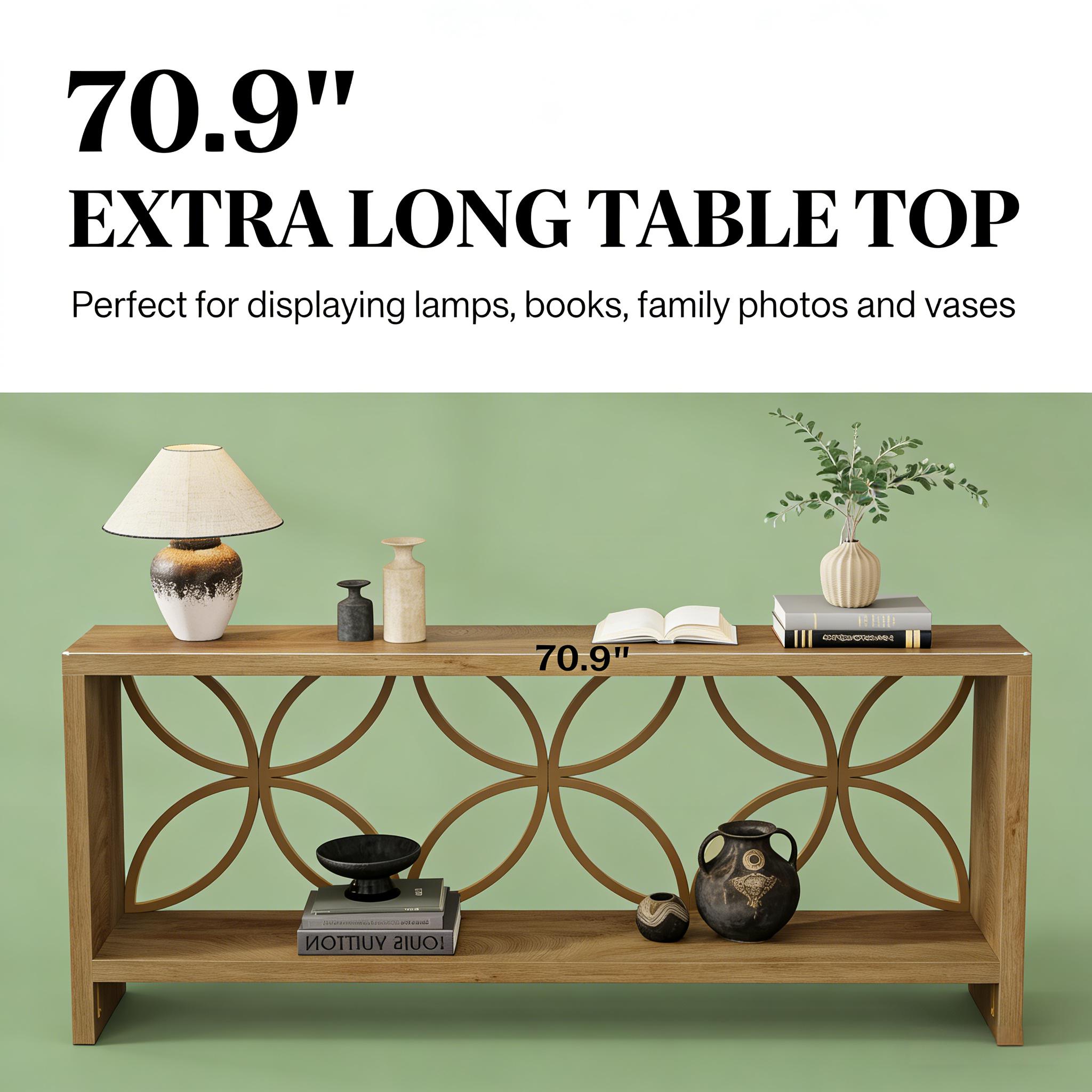 Important Reminder!!! 1) Attention: All products in our store do not support Canada self pickup ordering. Please do not create shipping labels for Canada. Our American products do not support self pickup to Canada 2)We do not ship to Alaska, Hawaii, US protectorates (e.g., Puerto Rico), P.O. boxes, or APO/FPO addresse 3)We don’t accept non-defective remorse returns Classic Farmhouse-Style Sofa Table - With a vintage wood grain surface, this long console table embodies a timeless farmhouse charm. The unique, intricately shaped metal frame on the back ensures an effortless blend of contemporary style with an artistic flair. Versatile Sofa Table with Storage - This sofa console table expertly merges versatility and style, allowing it to seamlessly blend into any home setting. Whether situated behind your couch as a sofa table enhancing your seating area, or placed in your entryway as a console table for a captivating decorative display, it enhances your living experience. Generous Storage Space - With overall dimensions of 70.9" L × 11.8" W × 31.9" H, this extra-large console table comfortably fits into narrow spaces, like entryways and hallways. Its 2-tier open-design shelf offers ample storage and display space for belongings and decor without taking up excessive floor space. Robust and Stable Structure - Crafted from high-quality particle board and steel, this skinny console table provides exceptional stability and durability. Each shelf can hold up to 198 pounds, and adjustable foot pads ensure adaptation to uneven floors, protecting your floor from scratches. Hassle-Free Assembly - Detailed assembly instructions are included with this entryway console table. All necessary parts, tools, and instructions are provided. If you have any queries, please feel free to contact us.