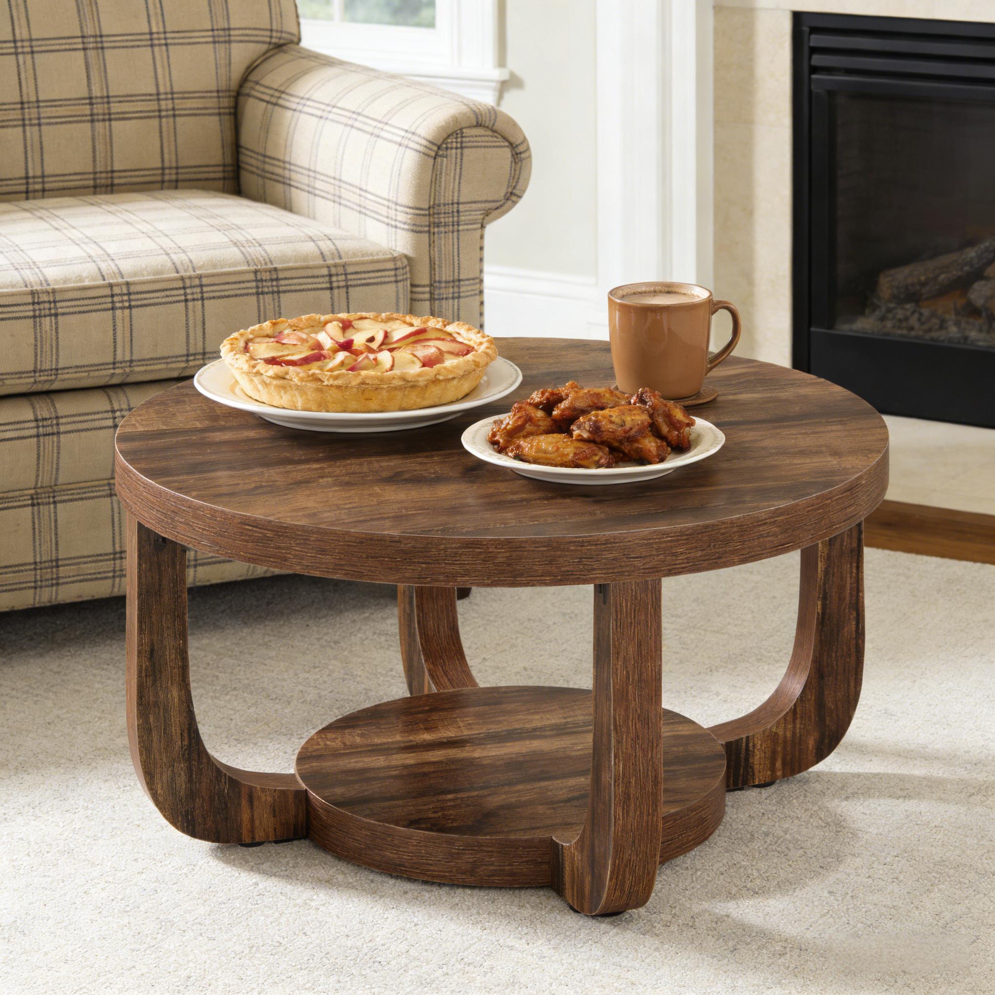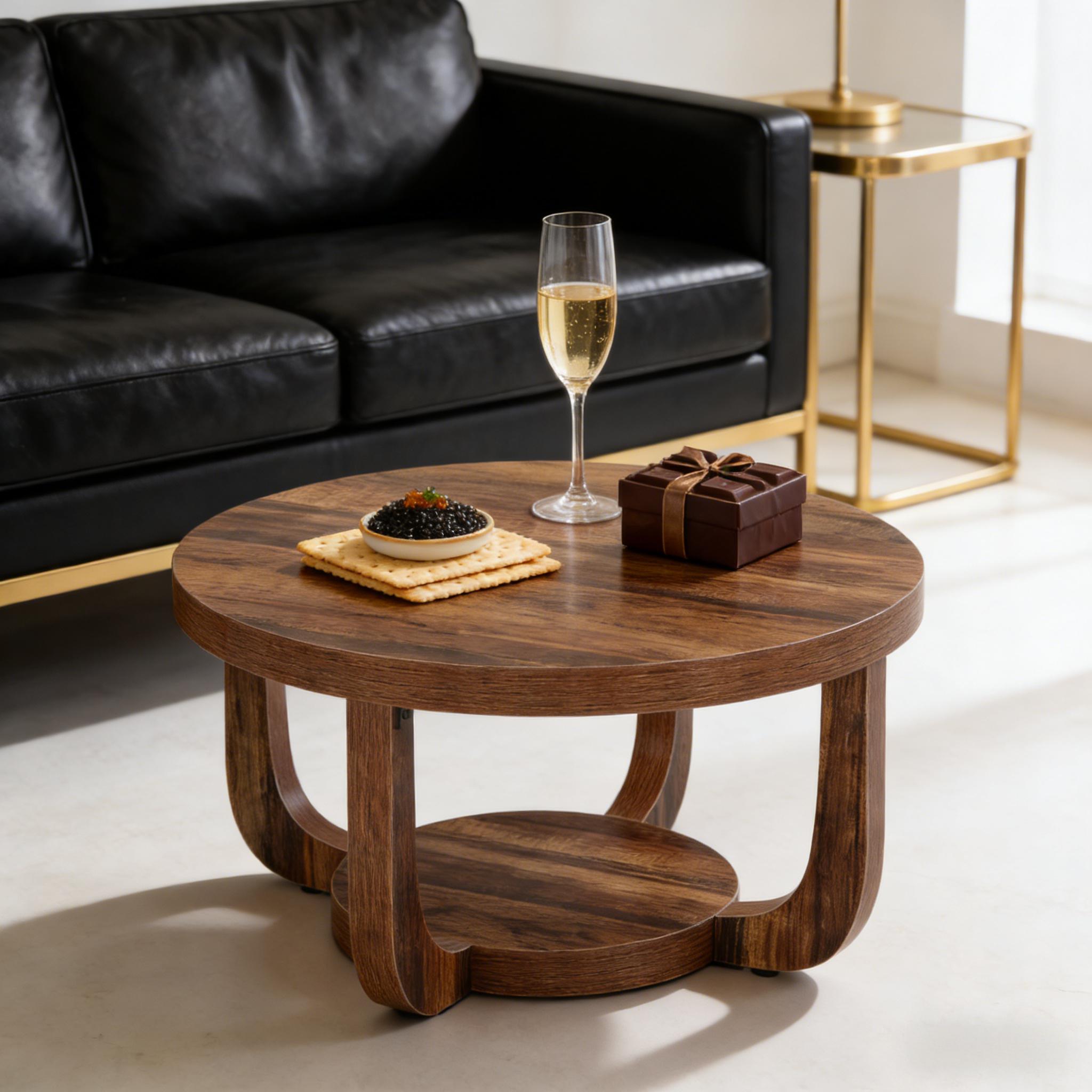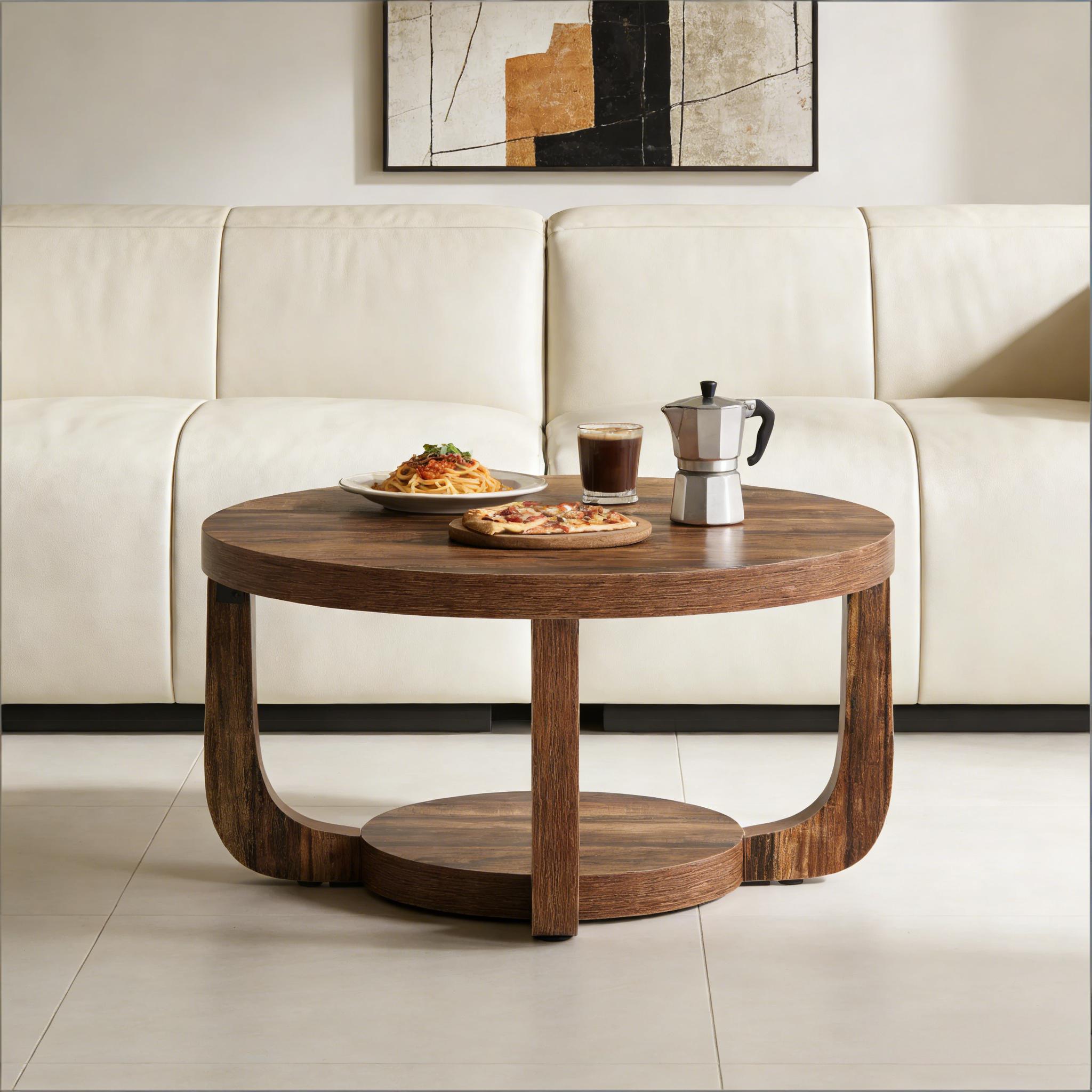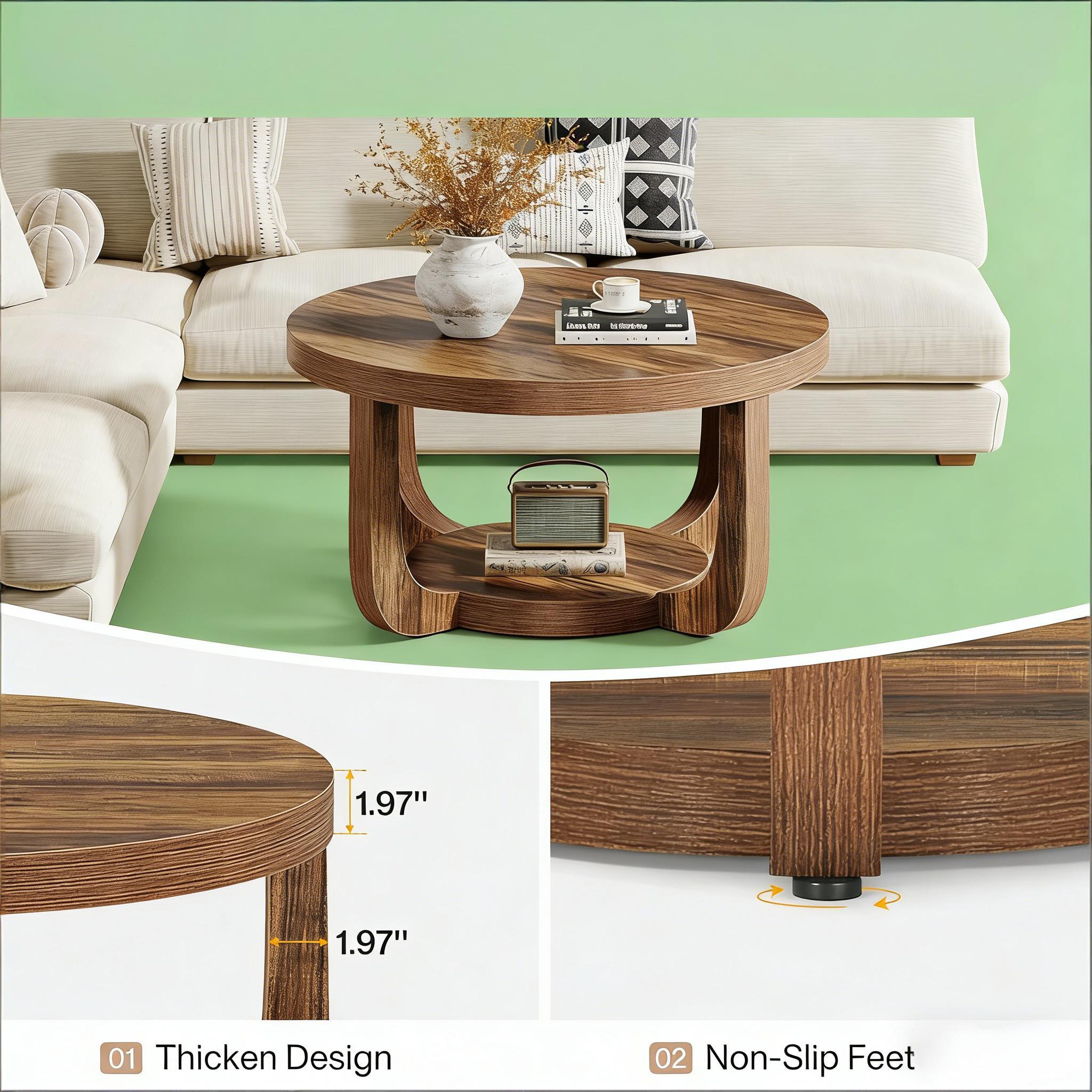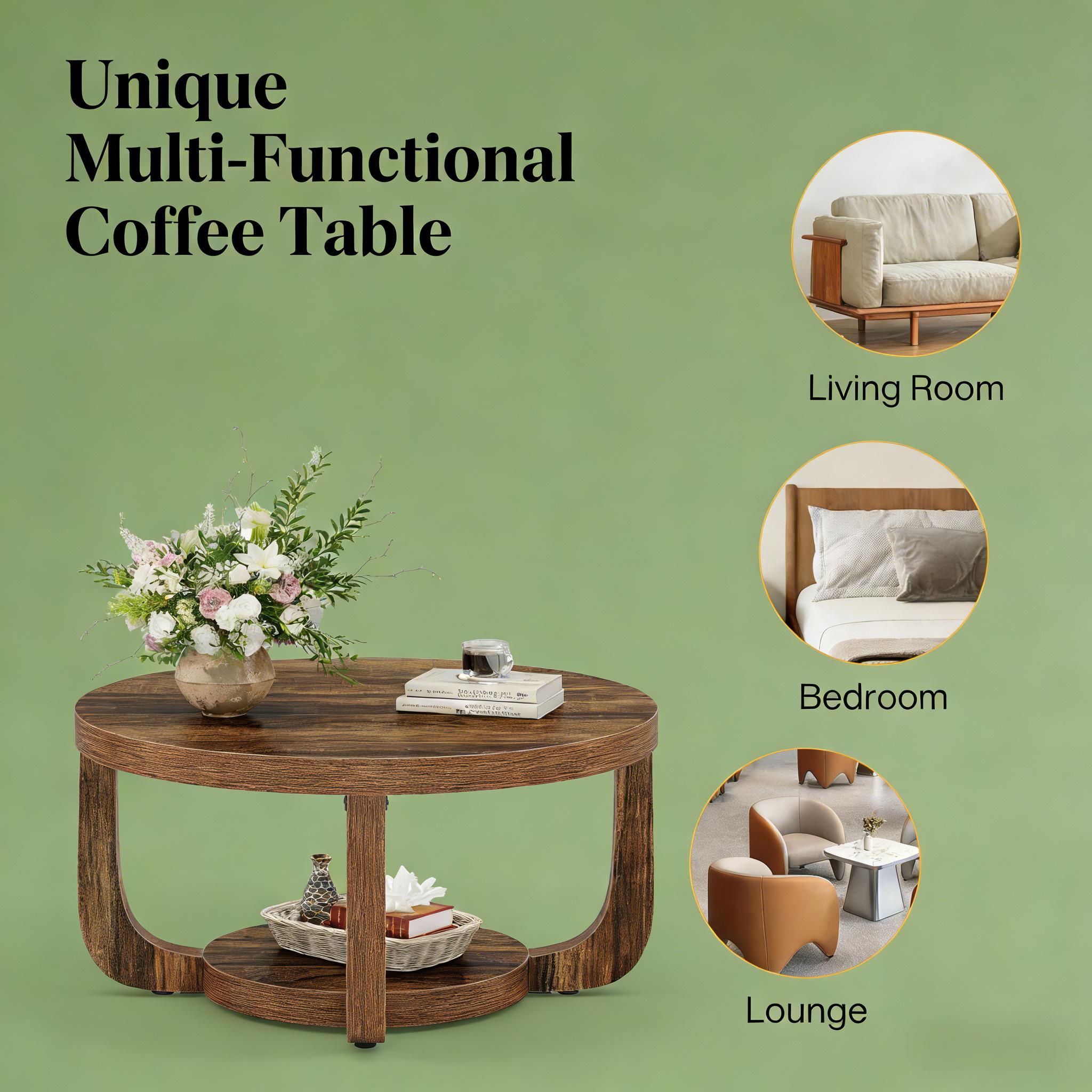 Important Reminder!!! 1) Attention: All products in our store do not support Canada self pickup ordering. Please do not create shipping labels for Canada. Our American products do not support self pickup to Canada 2)We do not ship to Alaska, Hawaii, US protectorates (e.g., Puerto Rico), P.O. boxes, or APO/FPO addresse 3)We don’t accept non-defective remorse returns Dual-Level Storage & Display - This coffee table in rustic brown boasts a sleek 2-tier design, combining functionality with modern style. With a 31.5" tabletop and a 17.7" base, there's plenty of room for setting down coffee cups, displaying decorative items, or arranging everyday essentials. Solid Build - The tabletop, made from 1.97-inch-thick premium particleboard, along with sturdy L-shaped legs, form a rock-solid structure. This modern round coffee table can effortlessly handle daily use—even the occasional heavy load is no match for it. Retro Appeal - With its clean lines and unique retro wood grain finish, this round wooden coffee table radiates timeless appeal. It's a statement piece mirroring refined taste, adding distinctive charm to any living area. Universal Charm - The circular coffee table seamlessly integrates into any setting, whether a sleek modern living room, professional office space, or an inviting reception area, instantly enhancing the atmosphere with a touch of elegance. Simple Assembly - All the necessary hardware and a user-friendly guide are included, making assembly of this circle coffee table with storage a breeze, even for beginners.