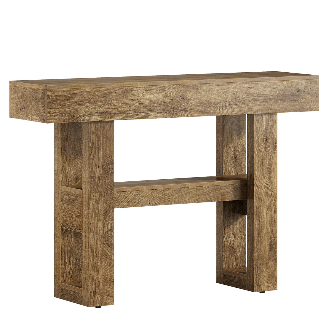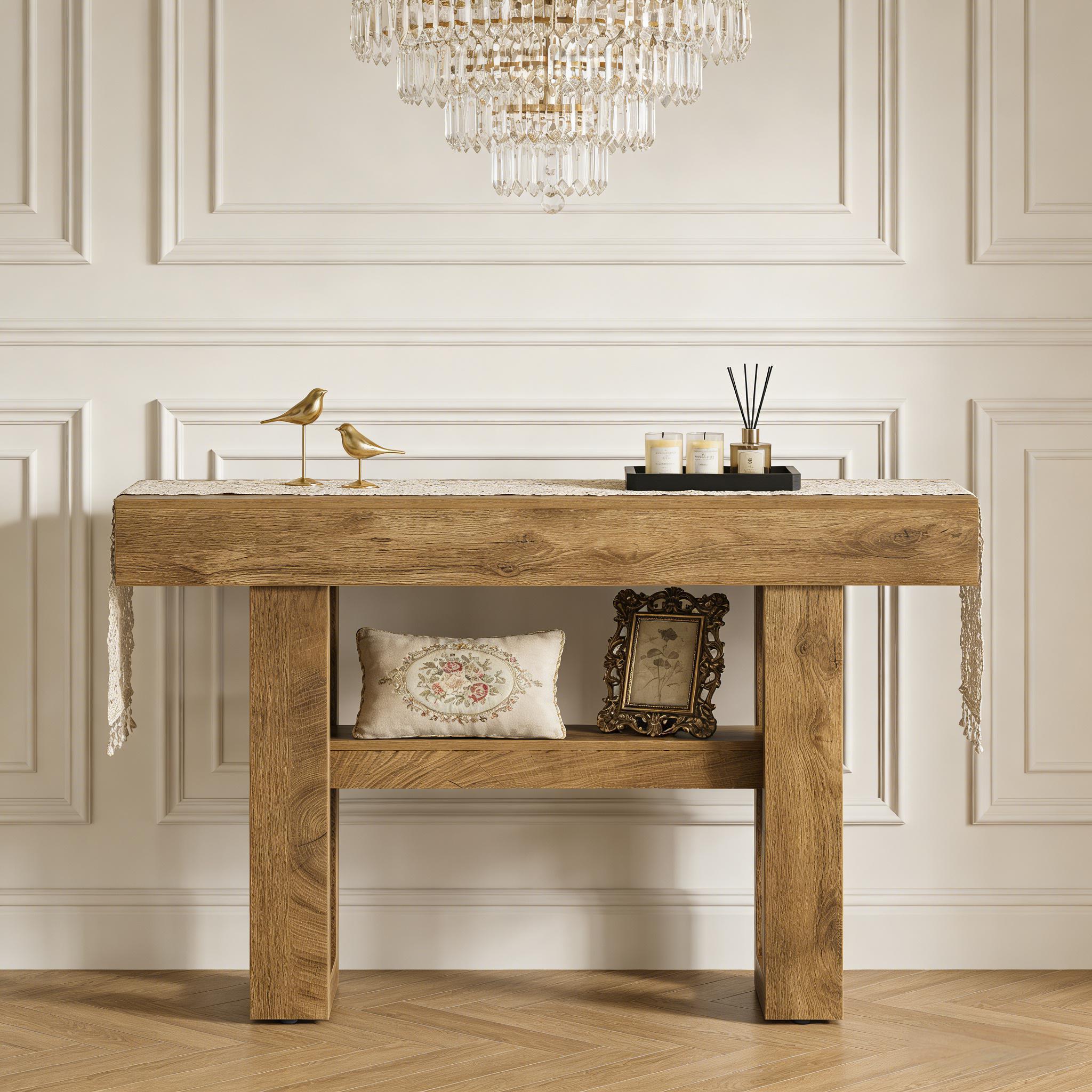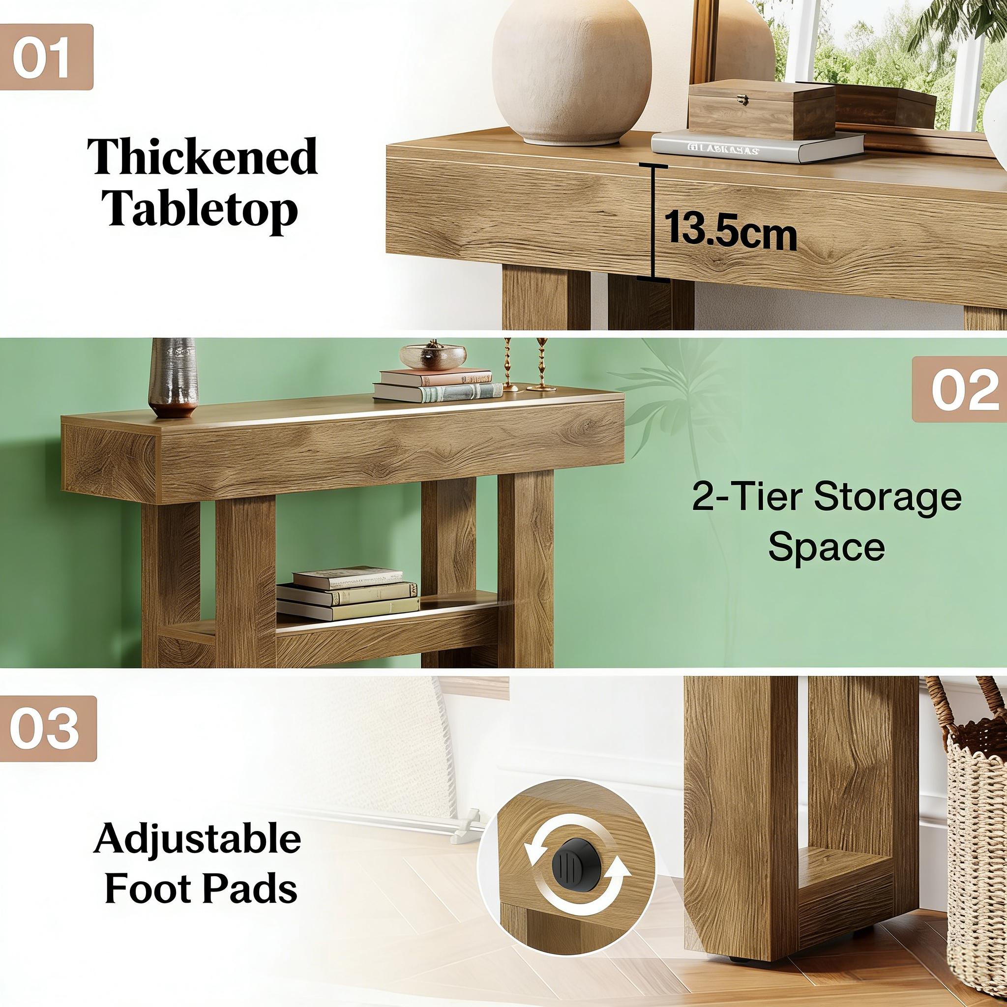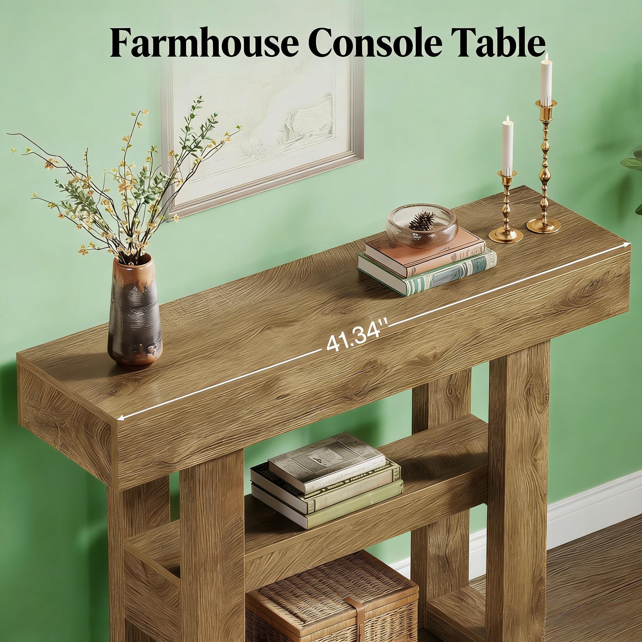 Important Reminder!!! 1) Attention: All products in our store do not support Canada self pickup ordering. Please do not create shipping labels for Canada. Our American products do not support self pickup to Canada 2)We do not ship to Alaska, Hawaii, US protectorates (e.g., Puerto Rico), P.O. boxes, or APO/FPO addresse 3)We don’t accept non-defective remorse returns Generous Storage Capacity - This rustic entryway table offers two spacious tiers, providing ample room to display decor, organize essentials, or keep your hallway tidy. Perfect for holding keys, mail, or adding a warm lamp to brighten your foyer. Multi-Purpose Design - Functioning as a sofa table, console table, or entryway piece, this versatile table adapts to any space. Place it in hallways, behind couches, or wherever you need stylish storage—ideal for small homes and apartments. Classic Farmhouse Style - The vintage brown wood grain finish brings cozy, rustic charm to your home. Whether in your entryway or living room, this table adds timeless elegance with its warm farmhouse aesthetic. Durable Construction - Made from high-quality thickened MDF, this hallway table features a sturdy, reliable build. Adjustable foot pads provide stability on uneven floors, ensuring long-lasting use in any home. Simple Setup & Support - Assembly is quick and easy with included instructions and tools. Plus, our dedicated customer service team is available to help if you need assistance.