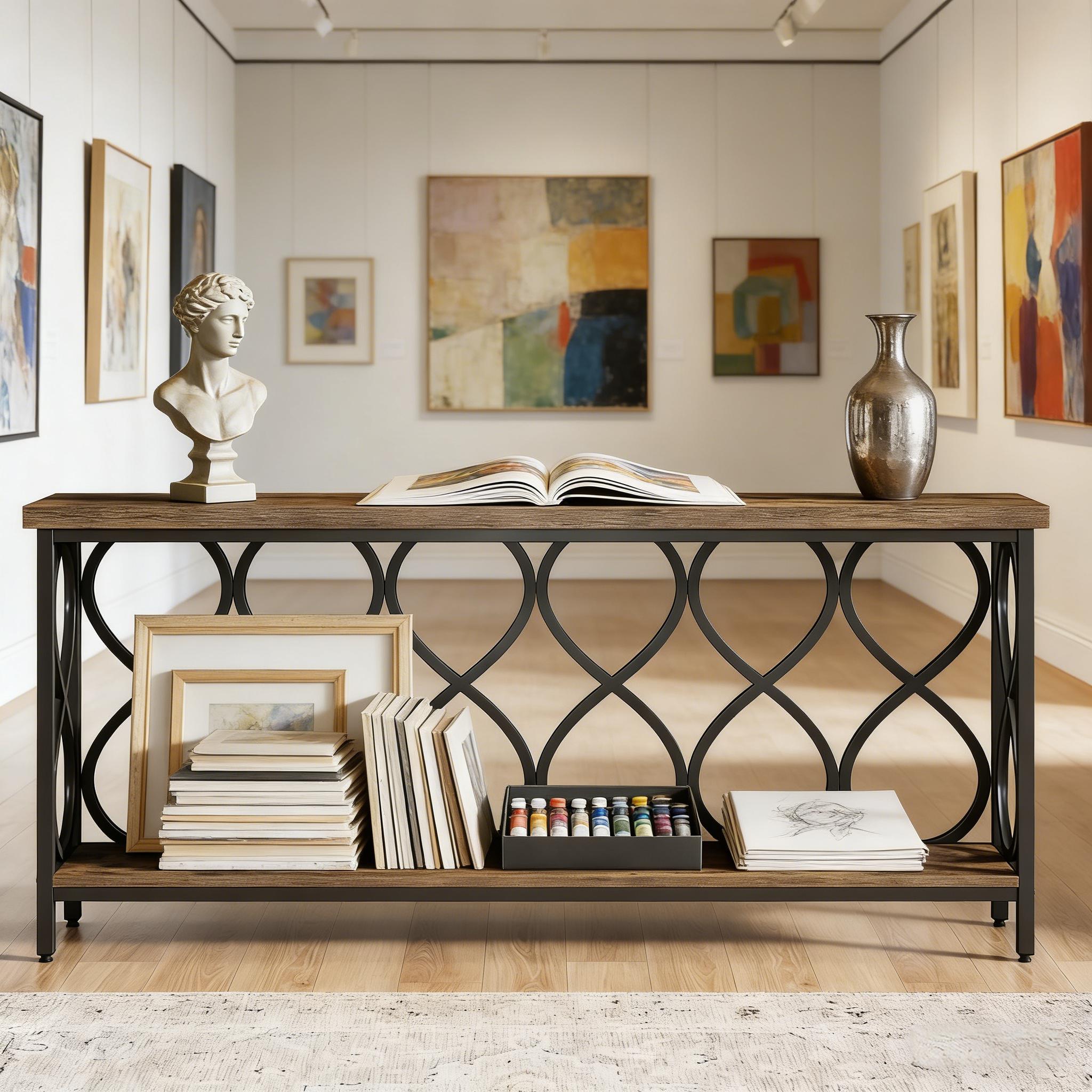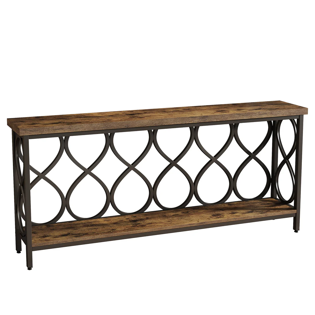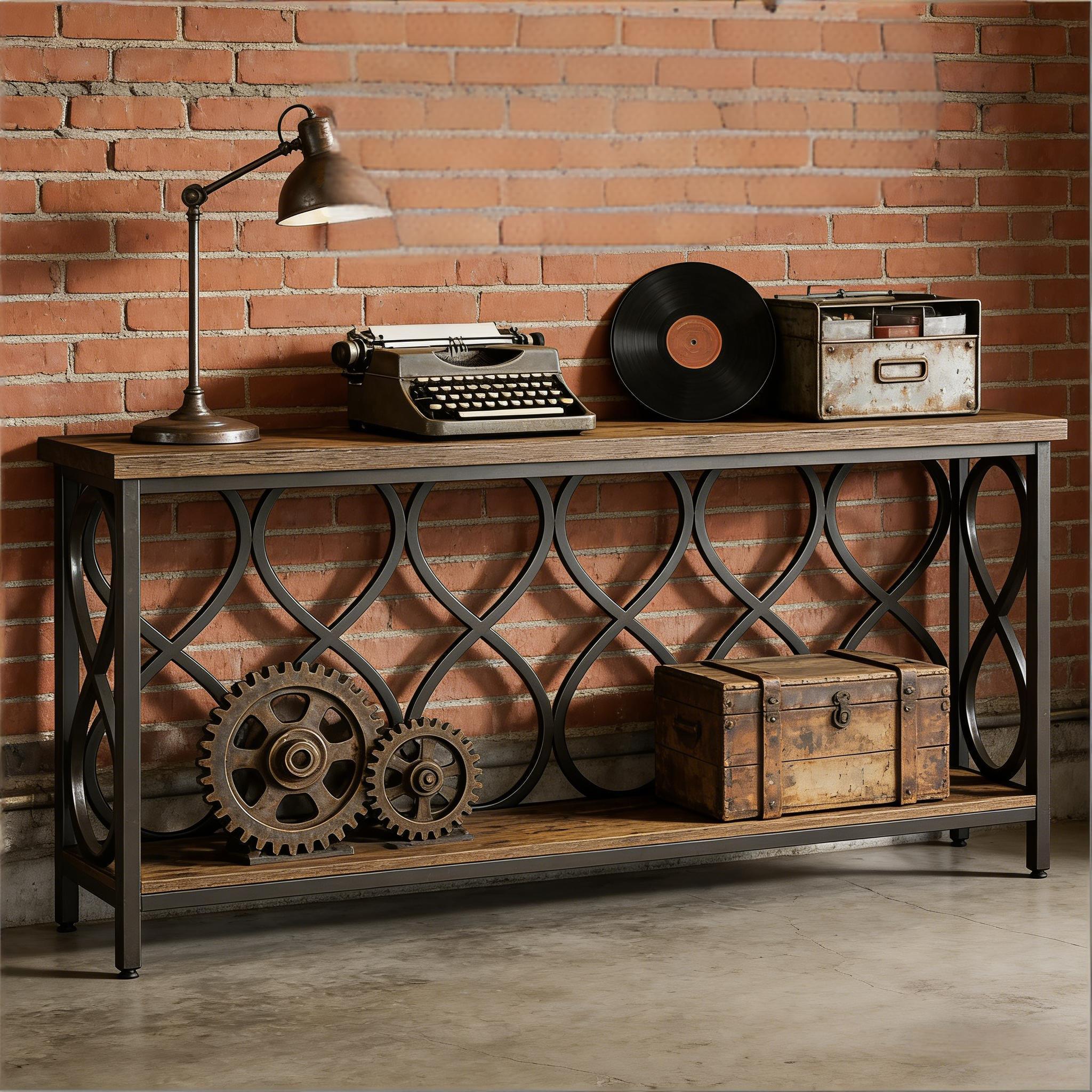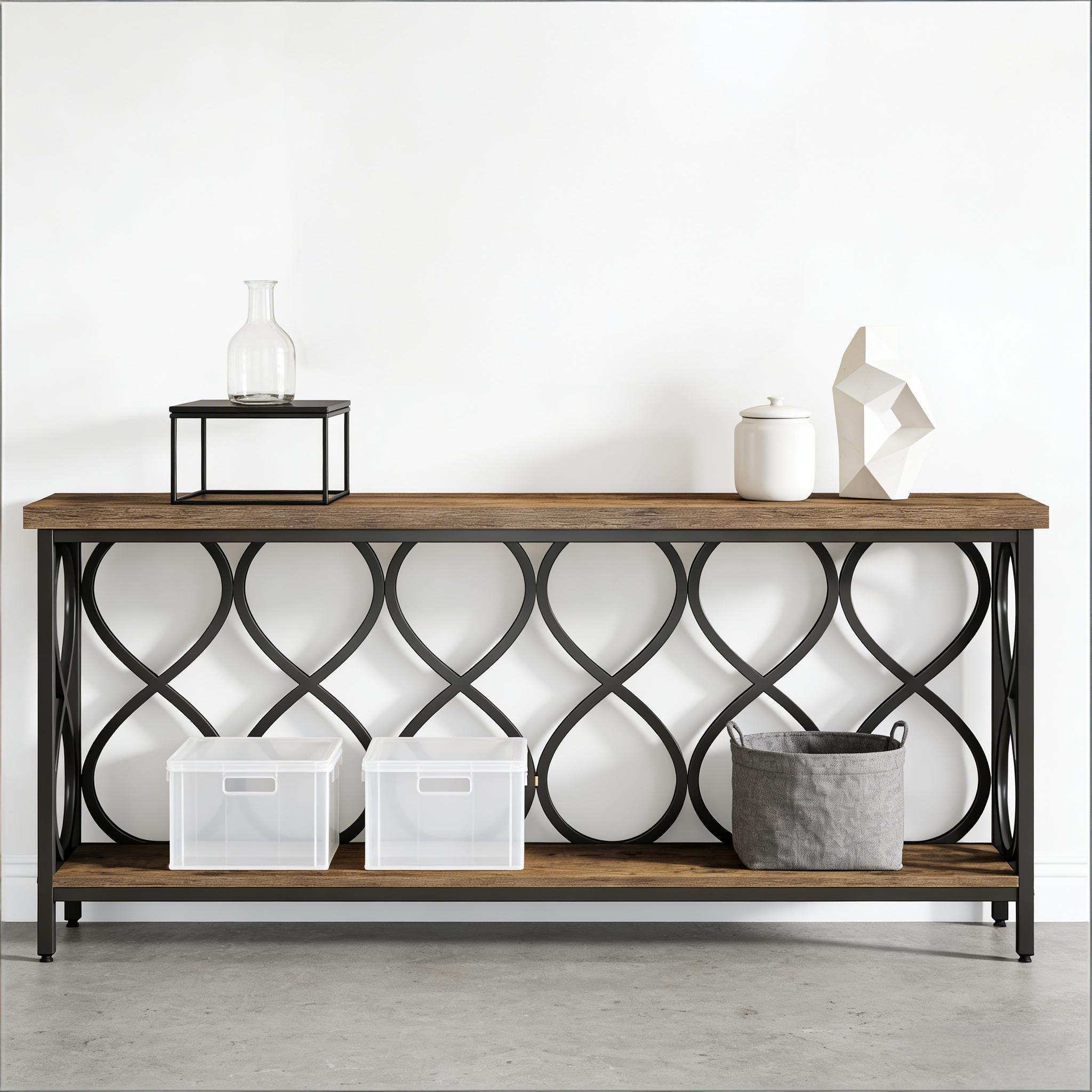 Important Reminder!!! 1) Attention: All products in our store do not support Canada self pickup ordering. Please do not create shipping labels for Canada. Our American products do not support self pickup to Canada 2)We do not ship to Alaska, Hawaii, US protectorates (e.g., Puerto Rico), P.O. boxes, or APO/FPO addresse 3)We don’t accept non-defective remorse returns Industrial Elegance - Seamlessly integrating rustic brown wood and black metal, this console table exudes an industrial chic vibe. It adds an instant warm and inviting character to your home. Generous Storage Space - With a 70.87" long tabletop, this rustic console offers an excellent stage for your essentials, decorative pieces, and collectibles. The additional bottom shelf keeps your room organized by providing extra storage. Versatile Use - Ideal for any space, this entryway table doubles as a sofa table, wall table, TV console, or plant stand. It's a versatile piece of furniture tailored to your needs. Sturdy & Durable - With a 1.57" thick tabletop and robust metal frame, it provides reliable durability and sturdiness, holding up to 250 lbs. Adjustable leg pads ensure stability on any surface. Effortless Assembly - This table is easy to assemble with clear instructions, labeled parts, and included hardware.