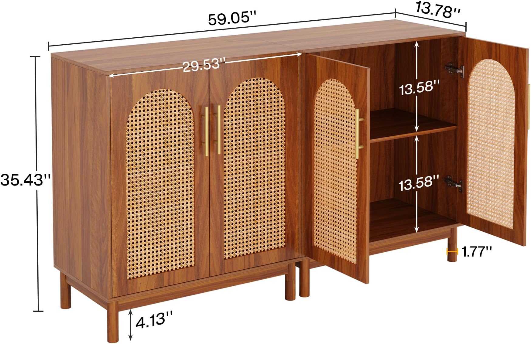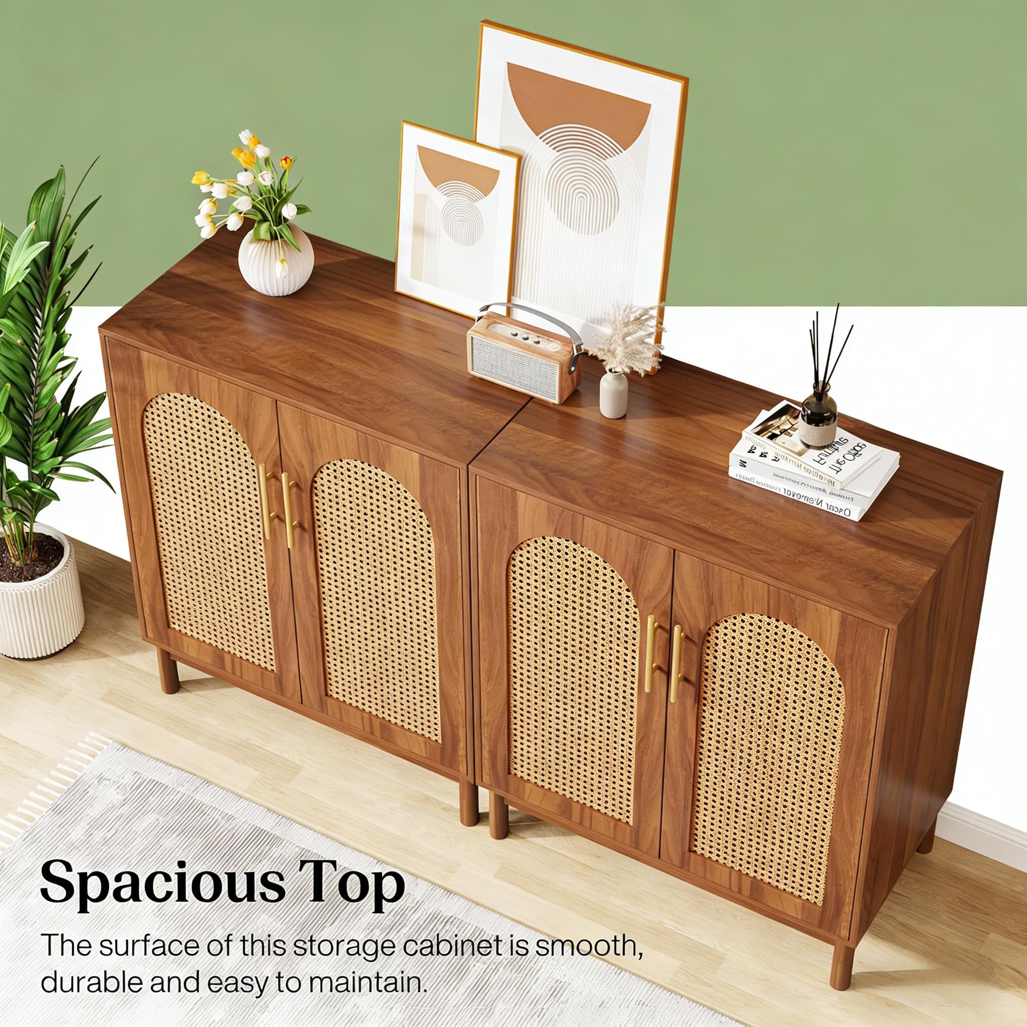 Important Reminder!!! 1) Attention: All products in our store do not support Canada self pickup ordering. Please do not create shipping labels for Canada. Our American products do not support self pickup to Canada 2)We do not ship to Alaska, Hawaii, US protectorates (e.g., Puerto Rico), P.O. boxes, or APO/FPO addresse 3)We don’t accept non-defective remorse returns Ample Storage - This buffet cabinet offers generous storage, with 4 door cabinets and a spacious tabletop and shelf. Perfect for cutlery, pots, pans, and more, it ensures a neat, organized space. Handmade Elegance - Crafted from MDF and solid wood legs , this accent cabinet is complemented by handmade, natural rattan doors, adding a luxurious, elegant touch to any room. Durable and Sturdy - Featuring a stain, heat, and scratch-resistant surface, this well-crafted buffet cabinet stands on cushioned pinewood legs that protect your floors while ensuring stability. Versatile Use - This rattan sideboard is suitable for a range of uses, serving as a coffee bar cabinet, storage unit, or TV console. Ideal for the kitchen, living room, dining room, or office. Easy Assembly - This rattan sideboard cabinet comes with all necessary tools, detailed instructions, and clearly labeled pieces for easy setup.