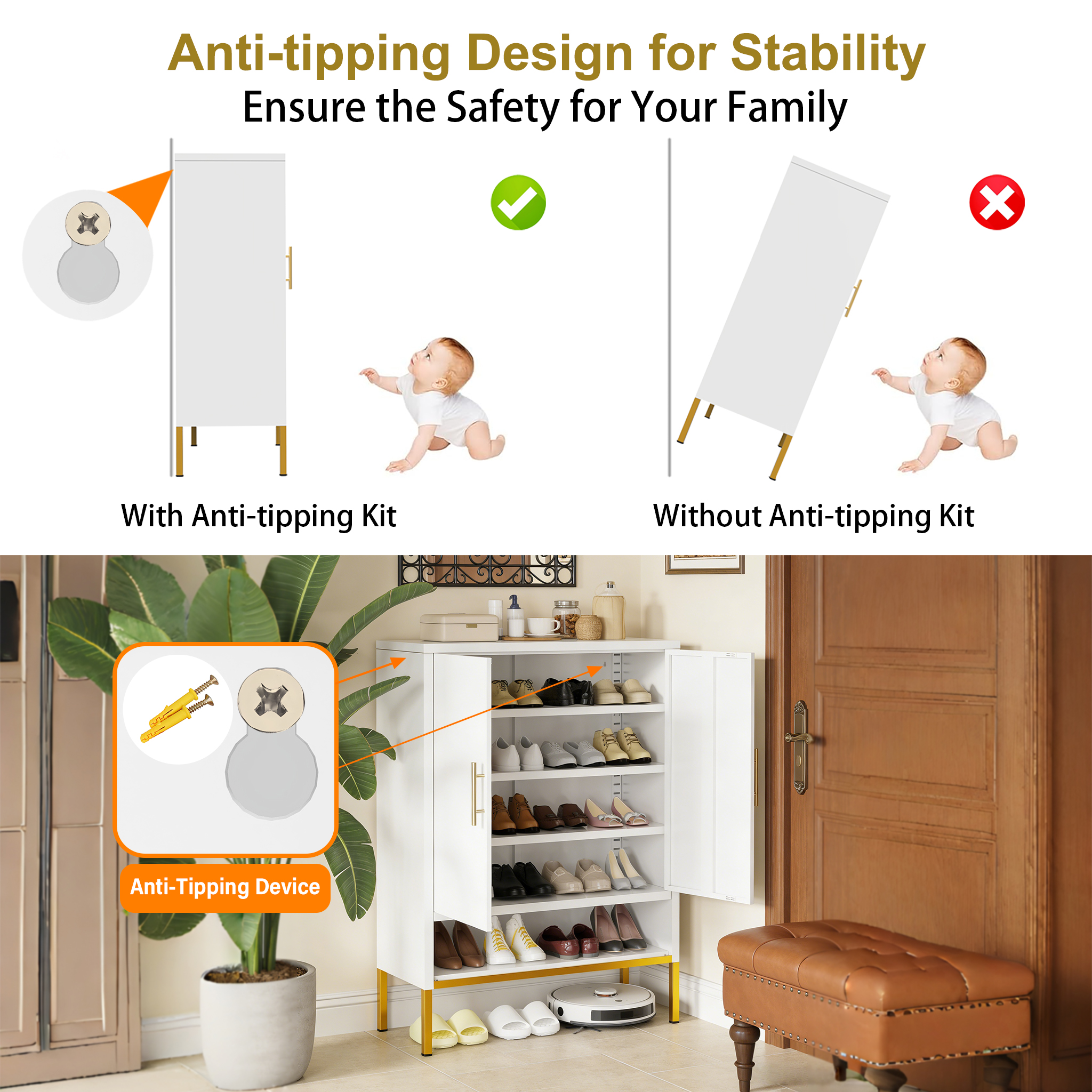 • 【Anti-Tipping Design for Safety】Equipped with an anti-tipping kit, this cabinet ensures stability and safety, preventing accidents in homes .