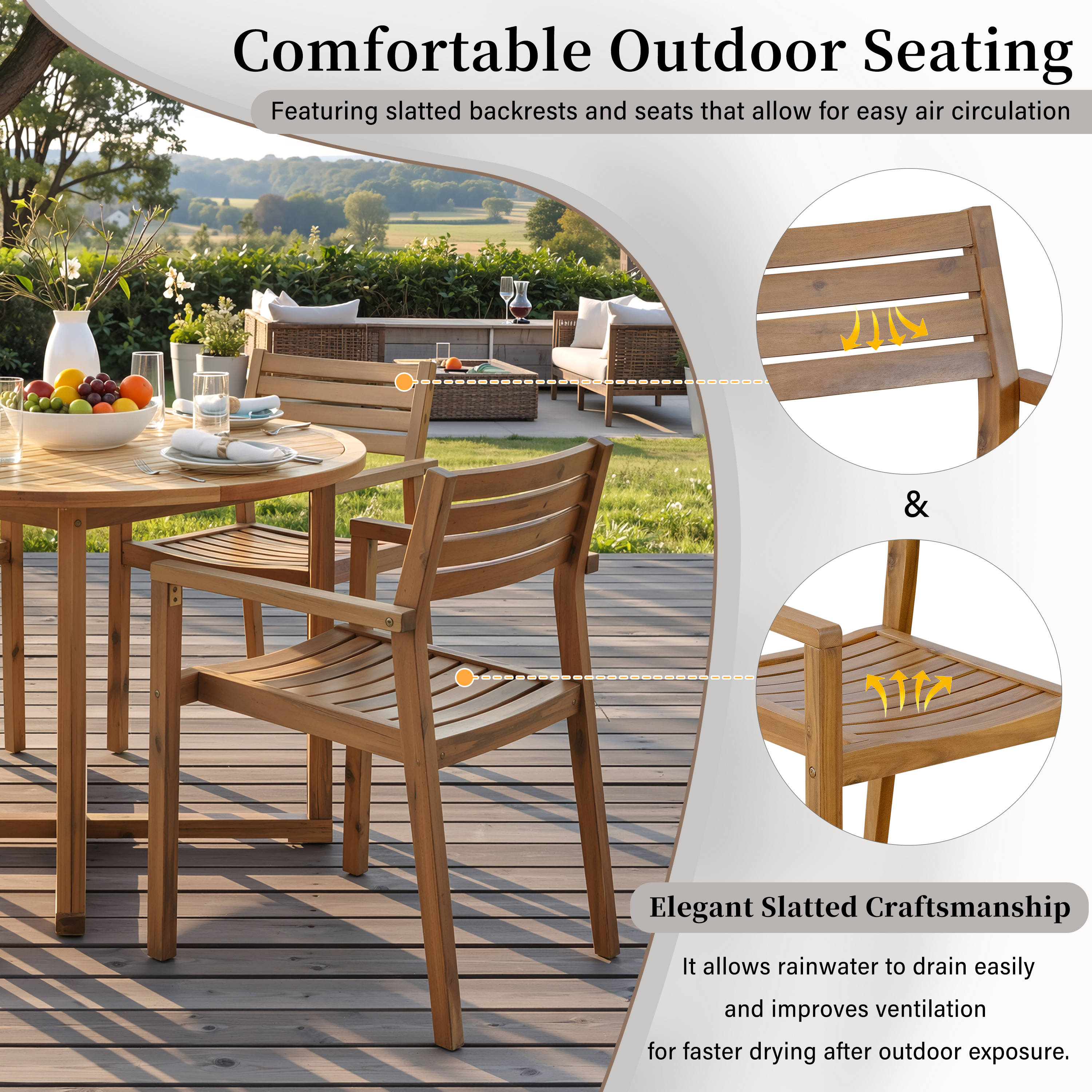 • [Ergonomically Designed Chairs]:Each chair is crafted for comfort with an ergonomic design, featuring slatted wood seats and backrests that promote relaxation during long outdoor meals.