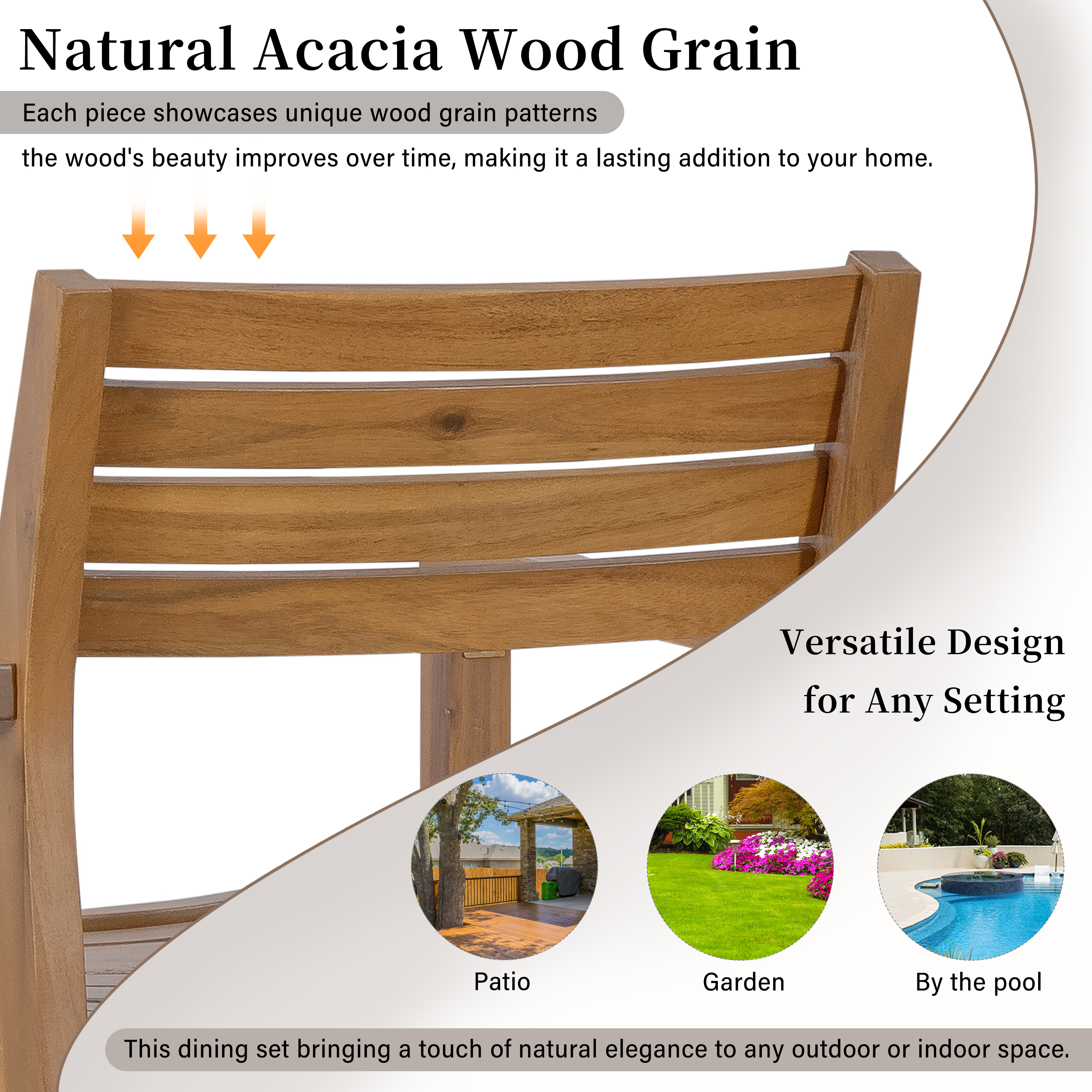 • [Premium Acacia Wood with Stunning Grain]:Crafted from high-quality acacia wood, each piece in this dining set showcases a unique natural wood grain, adding sophistication and warmth to your space.