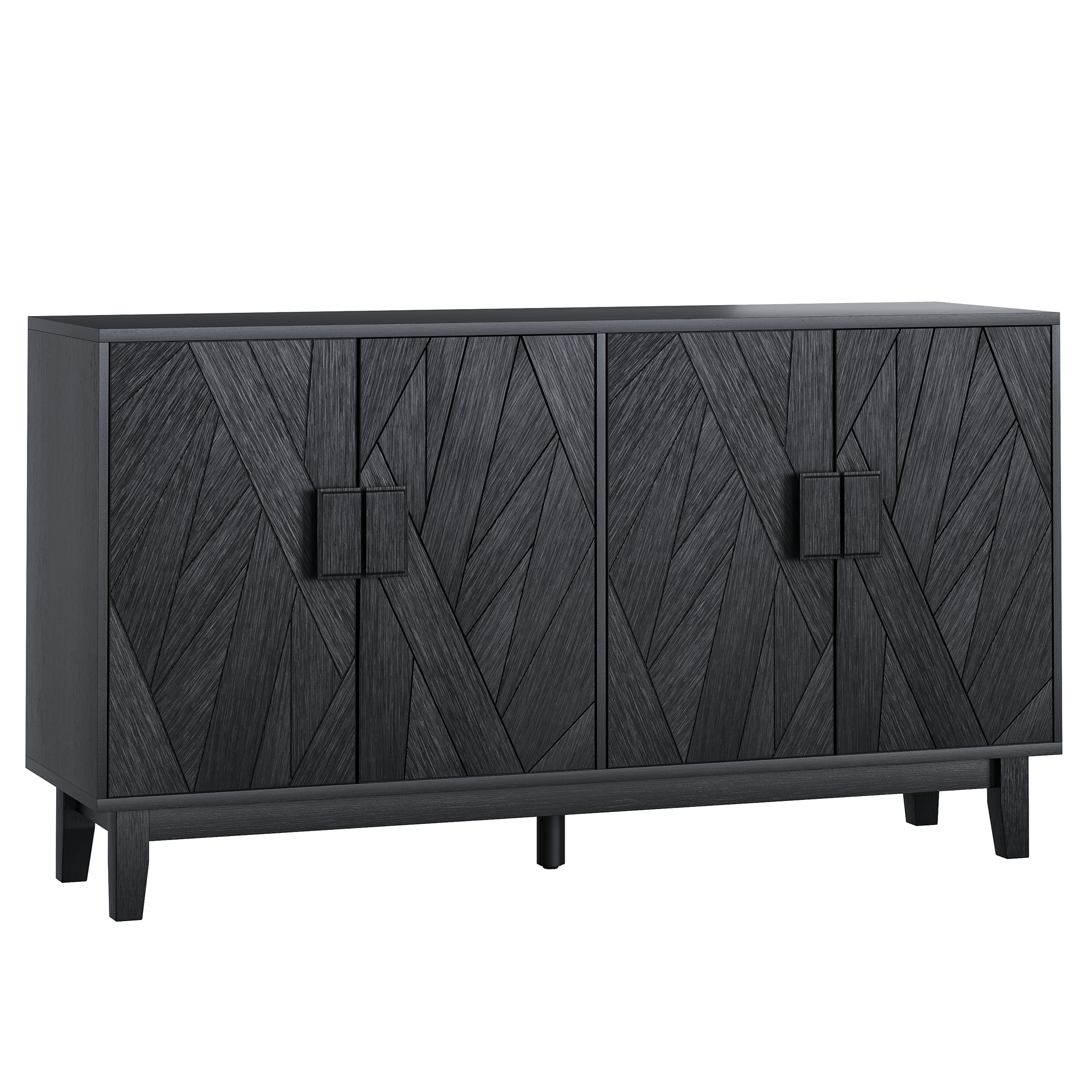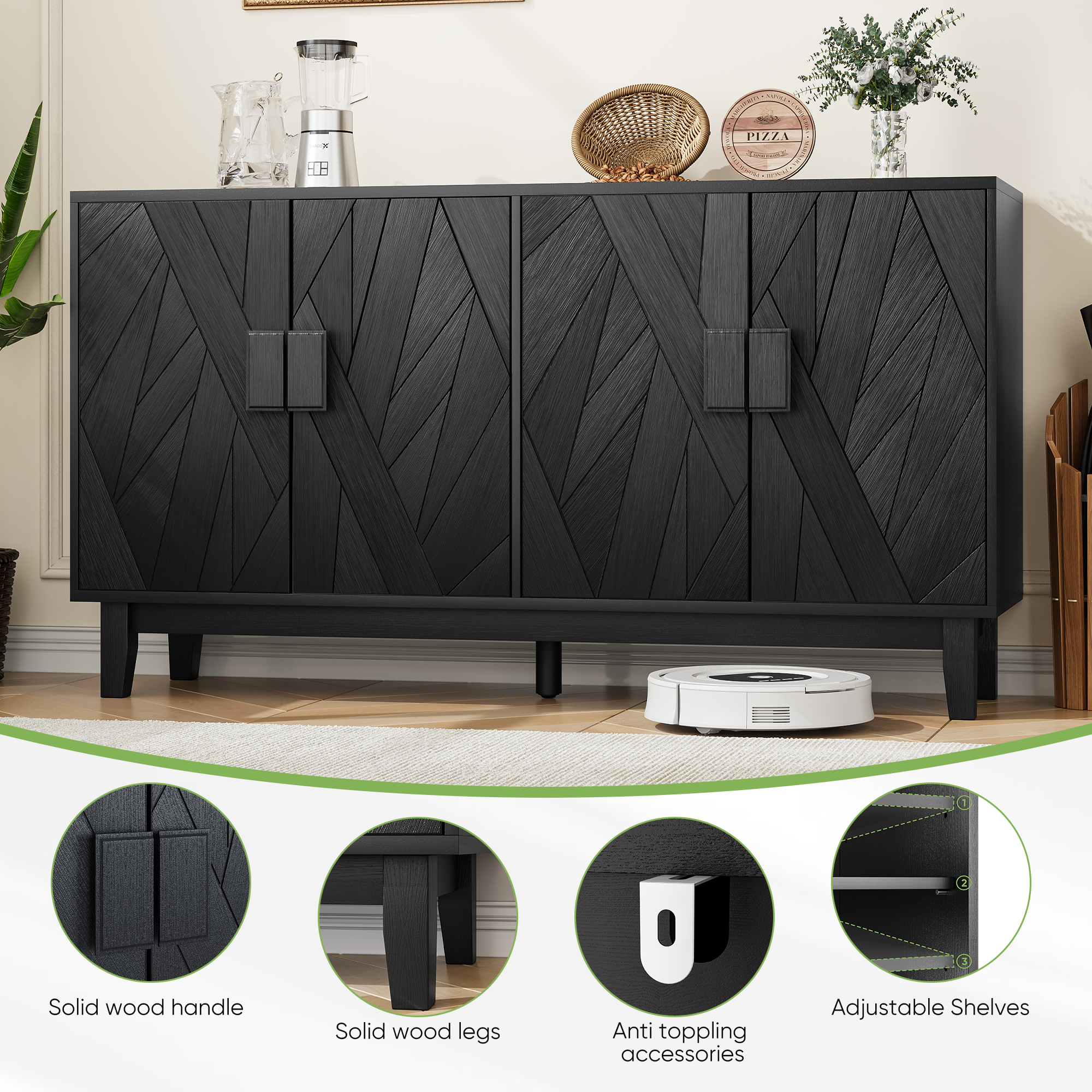 - ã€Modern Decorative Cabinet】The solid wood door of this cabinet adopts lrregular geometry design, with movable laminated boards inside and three adjustable ones. Its meticulous craftsmanship and modern design blend harmoniously, which can match any style of your room.