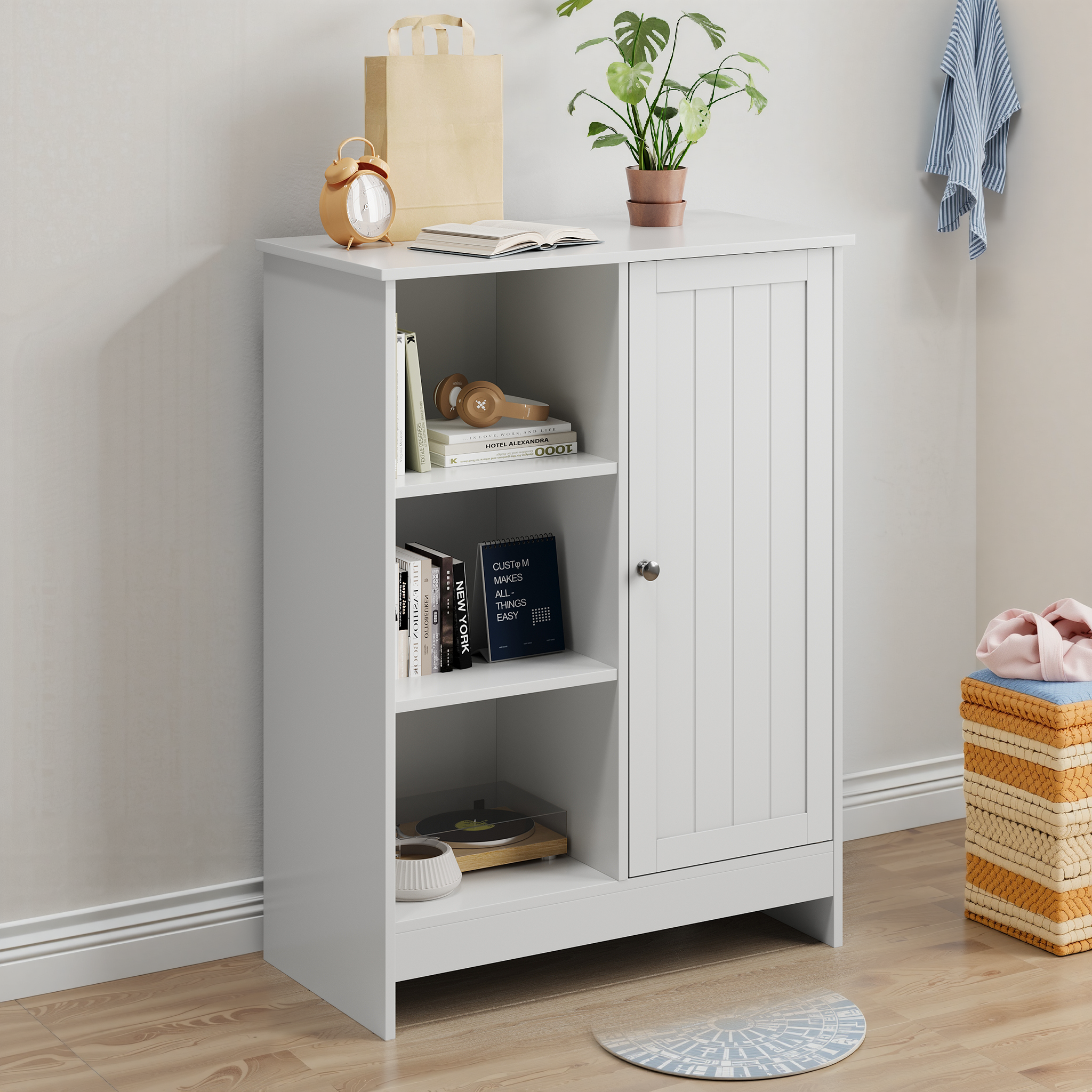 Product Name:Bathroom Cabinet, Kitchen Freestanding Storage Rack, 23.62" x 11.81" x 31.5" Floor Storage Cabinet with 1 Cabinet, 3 Open Compartments, Adjustable Shelves, White