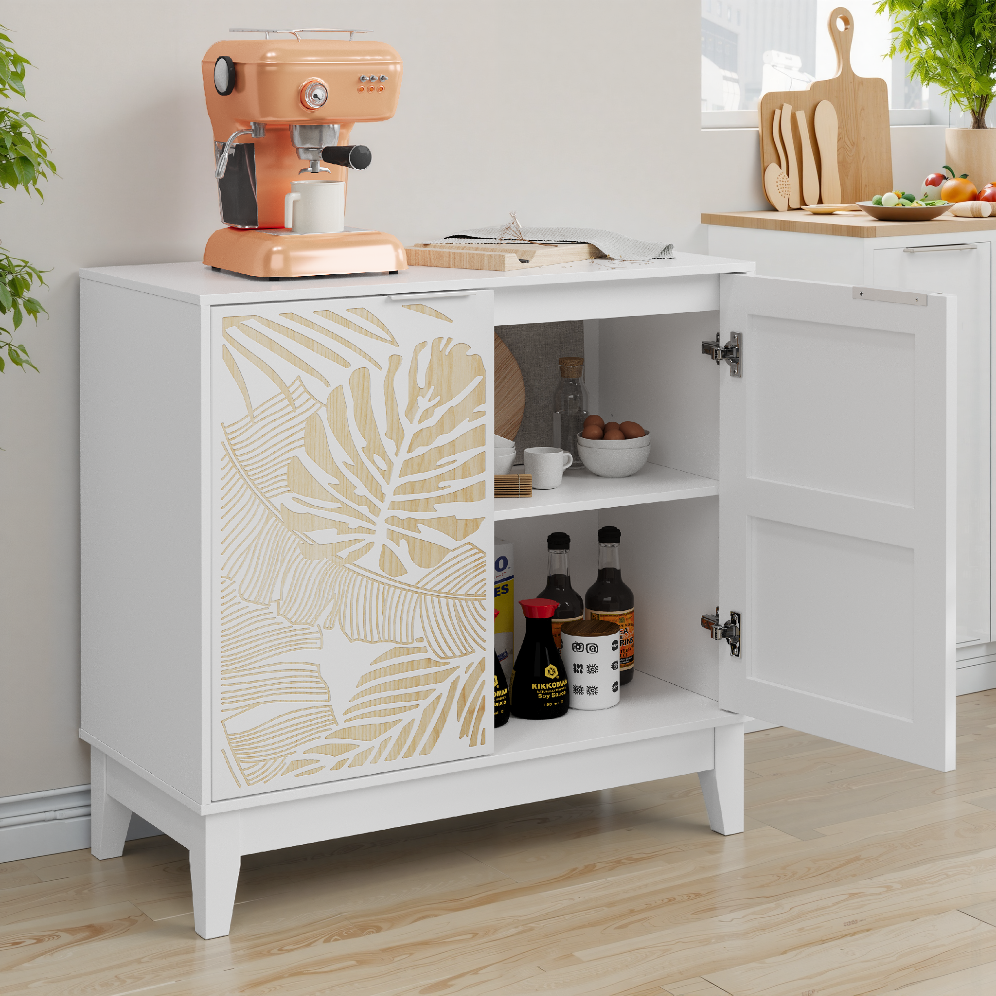 • 【Unique Leaf Carved Two-Door Cabinet】This buffet is made of special craftsmanship, and the leaf carving design makes the overall look more beautiful, which can be applied to any style and scene.