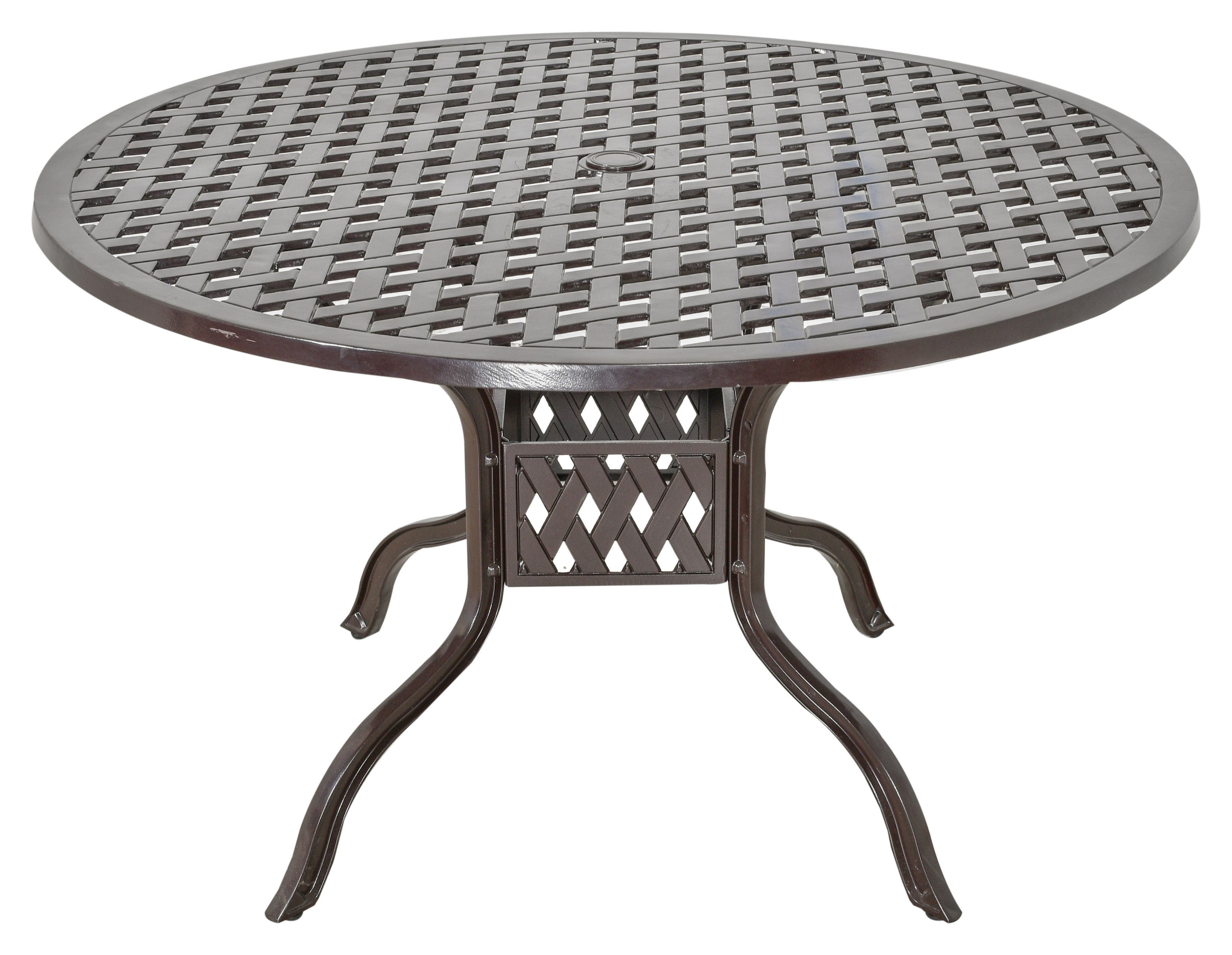 Elevate your outdoor living space with the Savannah Round Dining Table by Bridgeton Moore. This stunning 48-inch diameter cast aluminum table offers the perfect setting for intimate outdoor dining, morning coffee, or casual breakfast gatherings. Designed to comfortably seat four adults, the Savannah Table showcases timeless beauty with its classic woven lattice design and a rich, hand-applied brown bronzed powder coat finish.